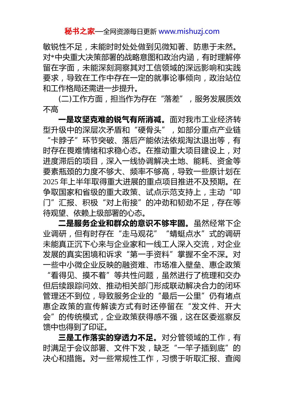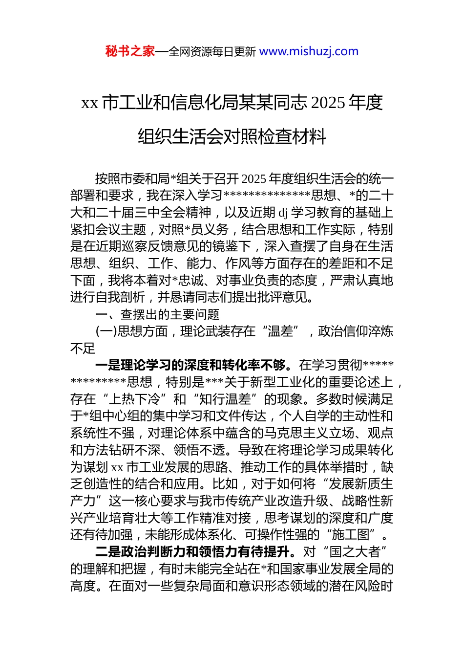 秘书之家—全网资源每日更新 www.mishuzj.comxx 市工业和信息化局某某同志 2025 年度组织生活会对照检查材料按照市委和局*组关于召开 2025 年度组织生活会的统一部署和要求,我在深入学习**************思想、*的二十大和二十届三中全会精神,以及近期 dj 学习教育的基础上紧扣会议主题,对照*员义务,结合思想和工作实际,特别是在近期巡察反馈意见的镜鉴下,深入查摆了自身在生活思想、组织、工作、能力、作风等方面存在的差距和不足下面,我将本着对*忠诚、对事业负责的态度,严肃认真地进行自我剖析,并恳请同志们提出批评意见。一、查摆出的主要问题(一)思想方面,理论武装存在“温差”,政治信仰淬炼不足一是理论学习的深度和转化率不够。在学习贯彻**************思想,特别是***关于新型工业化的重要论述上,存在“上热下冷”和“知行温差”的现象。多数时候满足于*组中心组的集中学习和文件传达,个人自学的主动性和系统性不强,对理论体系中蕴含的马克思主义立场、观点和方法钻研不深、领悟不透。导致在将理论学习成果转化为谋划 xx 市工业发展的思路、推动工作的具体举措时,缺乏创造性的结合和应用。比如,对于如何将“发展新质生产力”这一核心要求与我市传统产业改造升级、战略性新兴产业培育壮大等工作精准对接,思考谋划的深度和广度还有待加强,未能形成体系化、可操作性强的“施工图”。二是政治判断力和领悟力有待提升。对“国之大者”的理解和把握,有时未能完全站在*和国家事业发展全局的高度。在面对一些复杂局面和意识形态领域的潜在风险时秘书之家—全网资源每日更新 www.mishuzj.com敏锐性不足,未能时时处处做到见微知著、防患于未然。对*中央重大决策部署的战略意图和政治内涵,有时理解停留在字面,未能深刻洞察其对工信领域的深远影响和实践要求,导致在工作中存在一定的就事论事倾向,政治站位和工作格局还需进一步提升。(二)工作方面,担当作为存在“落差”,服务发展质效不高一是攻坚克难的锐气有所消减。面对我市工业经济转型升级中的深层次矛盾和“硬骨头”,如部分重点产业链“卡脖子”环节突破、落后产能依法依规淘汰退出等,有时存在畏难情绪和求稳心态。在推动重大项目建设上,对进度滞后的项目,深入一线协调解决土地、能耗、资金等要素瓶颈的力度不够大、频率不够高,导致一些原计划在2025 年上半年取得重大进展的重点项目推进不及预期。在争取国家和省级的重大政策、试点示范支持上,主动“叩门”汇报、积极“对上衔接”的冲劲和韧劲不足,存在等待观望、依赖上级部署的心态。二是服务企业和群众的意识不够牢固。虽然经常下企业调研,但有时存在“走马观花”“蜻蜓点水”式的调研未能真正沉下心来与企业家和一线工人深入交流,对企业发展的真实困境和诉求“第一手资料”掌握不全不深。对一些中小微企业反映的融资难、市场准入壁垒、惠企政策“看得见、摸不着”等共性问题,虽然进行了梳理和交办但后续跟踪问效、推动相关部门形成联动解决合力的闭环管理还不到位,导致服务企业的“最后一公里”仍有堵点惠企政策的宣传解读方式有时还停留在“发文件、开大会”的传统模式,企业政策获得感不强,这在区委巡察反馈中也得到了印证。三是工作落实的穿透力不足。对分管领域的工作,有时满足于会议部署、文件下发,缺乏“一竿子插到底”的决心和措施。对一些常规性工作,习惯于听取汇报、查阅秘书之家—全网资源每日更新 www.mishuzj.com台账,对工作实际成效的核查不够深入,导致部分工作在落实中出现“层层递减”甚至“空转”的现象。以推动制造业数字化转型为例,虽然我市明确了到 2025 年底新培育省级工业互联网平台 3 个左右、累计培育省级数字化改造标杆企业 30 家以上的目标但在实际推动中,我对企业“不愿转、不敢转、不会转”的深层原因研究不透,提出的激励和引导措施针对性不强,导致整体进度与预期目标存在差距。(三)能力方面,知识储备存在“逆差”,驾驭新局本领恐慌一是应对新一轮科技革命和产业变革的能力不足。当前,以人工智能、工业互联网、量子信息为代表的新技术正加速与制造业深度融合,但我个人在这些...