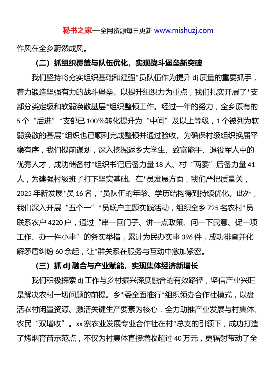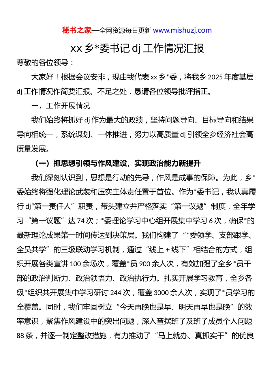 秘书之家—全网资源每日更新 www.mishuzj.comxx 乡*委书记 dj 工作情况汇报尊敬的各位领导:大家好!根据会议安排,现由我代表 xx 乡*委,将我乡 2025 年度基层dj 工作情况作简要汇报。不足之处,恳请各位领导批评指正。一、工作开展情况我们始终将抓好 dj 作为最大的政绩,坚持问题导向、目标导向和结果导向相统一,系统谋划、一体推进,努力以高质量 dj 引领全乡经济社会高质量发展。(一)抓思想引领与作风建设,实现政治能力新提升我们深刻认识到,思想是行动的先导,作风是成事的保障。为此,乡*委始终将强化理论武装和压实主体责任置于首位。作为*委书记,我认真履行 dj“第一责任人”职责,带头建立并严格落实“第一议题”制度,全年学习“第一议题”达 74 次;*委理论学习中心组开展集中学习 6 次,确保*的最新理论成果第一时间传达到决策层。我们构建了“*委领学、支部跟学、全员共学”的三级联动学习机制,通过“线上+线下”相结合的方式,组织开展各类宣讲 100 余场次,覆盖*员 900 余人次,有效加强了全乡*员干部的政治判断力、政治领悟力、政治执行力。扎实开展学习教育,全乡各级*组织共开展集中学习研讨 244 次,覆盖 3000 余人次,实现了*员学习的全覆盖。同时,我们牢固树立“今天再晚也是早、明天再早也是晚”的效率意识,聚焦作风建设中的突出问题,深入查摆班子及班子成员个人问题88 条,并逐一制定整改措施,有力推动了“马上就办、真抓实干”的优良秘书之家—全网资源每日更新 www.mishuzj.com作风在全乡蔚然成风。(二)抓组织覆盖与队伍优化,实现战斗堡垒新突破我们坚持将夯实组织基础和建强*员队伍作为提升 dj 质量的重要抓手,着力锻造坚强有力的战斗堡垒。以提升组织力为重点,我们扎实开展了*支部分类定级和软弱涣散基层*组织整顿工作。经过一年的努力,全乡原有的5 个“后进”*支部已 100%转化提升为“中间”及以上等级,1 个被列为软弱涣散的基层*组织也已顺利完成整顿并通过验收。为确保村级组织换届平稳有序,我们提前谋划,深入挖掘返乡大学生、致富能手、退役军人中的优秀人才,成功储备村*组织书记后备力量 18 人、村“两委”后备力量 41人,为建强村级班子打下坚实基础。在*员发展方面,我们严把质量关,2025 年新发展*员 16 名,*员队伍的年龄、学历结构得到持续优化。此外,我们深入开展“五个一”*员联户主题实践活动,组织全乡 725 名农村*员联系农户 4220 户,通过“串一回门子、讲一点政策、问一下民意、促一项工作、办一件小事”的务实举措,累计为民办实事 396 件,成功排查并化解矛盾纠纷 60 余起,让*群关系在服务与互动中愈加紧密。(三)抓 dj 融合与产业赋能,实现集体经济新增长我们积极探索 dj 工作与乡村振兴深度融合的有效路径,坚信产业兴旺是解决农村一切问题的前提。乡*委全面推行*组织领办合作社模式,以盘活农村闲置资源、激活关键生产要素为核心,全力助推产业发展与村集体、农民“双增收”。xx 寨农业发展专业合作社在村*总支的引领下,成功打造了烤烟育苗示范点,不仅为村集体直接增收超过 40 万元,更辐射带动了全秘书之家—全网资源每日更新 www.mishuzj.com乡 260 余户烟农实现总增收超 2200 万元,其中还精准帮扶了 40 余户脱贫户及“三类监测”对象,实现户均增收 1.5 万余元,联农带农成效显著。为进一步拓宽增收渠道,我们扎实推进“家门口务工车间”建设。依托 xx 村xx 山得天独厚的水源优势,乡里投入 310 万元在当地新建了一座占地 1500平方米的山泉水厂。通过将水厂租赁给专业企业运营,我们成功构建了“村集体+企业+群众”的紧密利益联结机制,确保村集体每年能够获得20 万元的稳定租金收入,同时为当地群众提供了 20 余个就业岗位,实现人均年增收 3 万余元,真正达到了村集体与群众利益的双赢。(四)抓多元共治与机制创新,实现乡村治理新格局我们认真学习并积极运用“千万工程”经验的 xx 做法,着力构建*组织领导下的自治、法治、德治相结合的乡村治理体系,有效激发了基层活力。乡*委指导各村建立了“村*总支...
