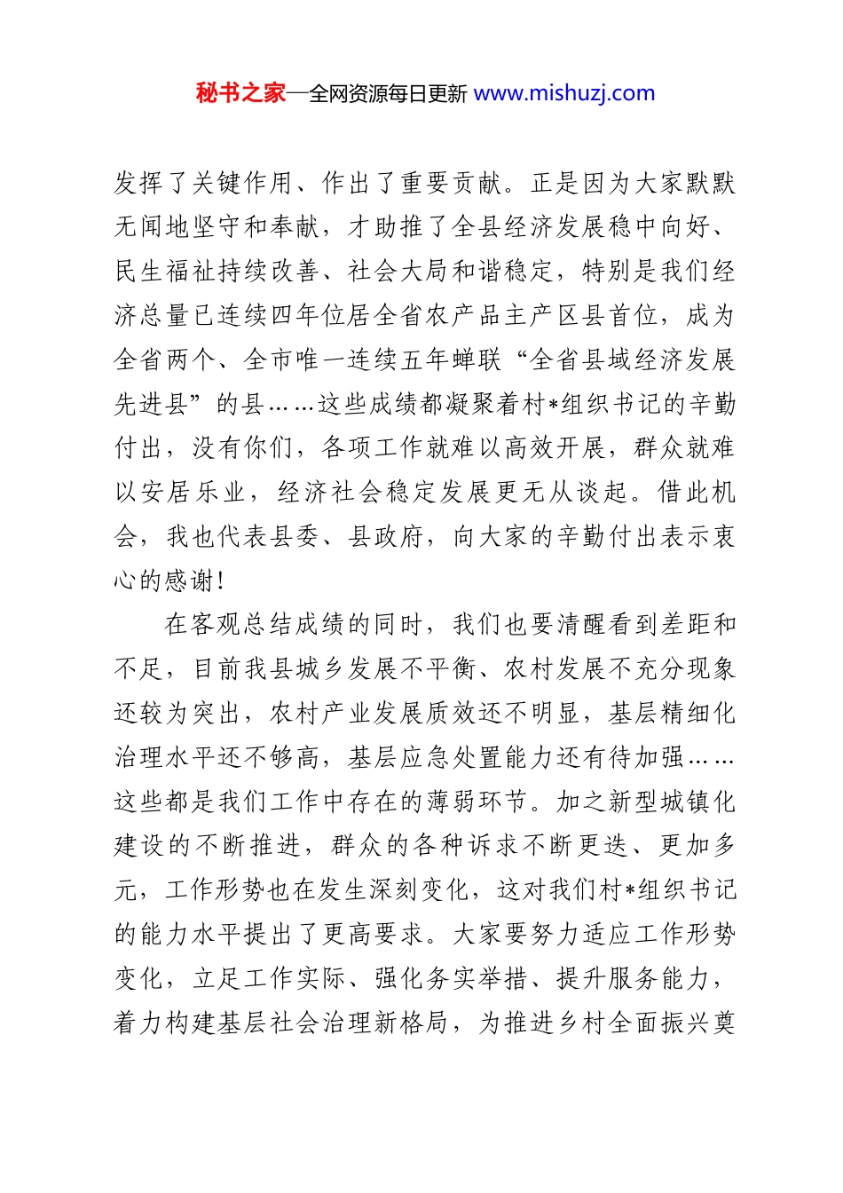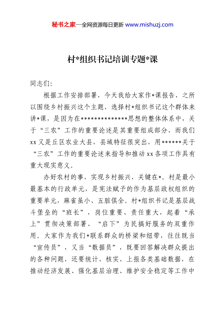 秘书之家—全网资源每日更新 www.mishuzj.com村*组织书记培训专题*课同志们:根据工作安排部署,今天我给大家作*课报告,之所以围绕乡村振兴这个主题,选择村*组织书记这个群体来讲*课,是因为在**************思想的整体体系中,关于“三农”工作的重要论述是其重要组成部分,而我们xx 又是丘区农业大县,县域特征很突出,用******关于“三农”工作的重要论述来指导和推动 xx 各项工作具有重大现实意义。办好农村的事,实现乡村振兴,关键在*。村是最小最基本的行政单元,是宪法赋予的作为基层政权组织的重要单元,麻雀虽小、五脏俱全。村*组织书记是基层战斗堡垒的“班长”,岗位重要、责任重大,起着“承上”贯彻决策部署、“启下”为民搞好服务的双重作用。大家作为我们*联系群众的桥梁和纽带,往往既当“宣传员”,又当“数据员”,既要回答解决群众提出的各种问题,还要统计、核实、上报各类基础数据,在推动经济发展、强化基层治理、维护安全稳定等工作中秘书之家—全网资源每日更新 www.mishuzj.com发挥了关键作用、作出了重要贡献。正是因为大家默默无闻地坚守和奉献,才助推了全县经济发展稳中向好、民生福祉持续改善、社会大局和谐稳定,特别是我们经济总量已连续四年位居全省农产品主产区县首位,成为全省两个、全市唯一连续五年蝉联“全省县域经济发展先进县”的县……这些成绩都凝聚着村*组织书记的辛勤付出,没有你们,各项工作就难以高效开展,群众就难以安居乐业,经济社会稳定发展更无从谈起。借此机会,我也代表县委、县政府,向大家的辛勤付出表示衷心的感谢!在客观总结成绩的同时,我们也要清醒看到差距和不足,目前我县城乡发展不平衡、农村发展不充分现象还较为突出,农村产业发展质效还不明显,基层精细化治理水平还不够高,基层应急处置能力还有待加强……这些都是我们工作中存在的薄弱环节。加之新型城镇化建设的不断推进,群众的各种诉求不断更迭、更加多元,工作形势也在发生深刻变化,这对我们村*组织书记的能力水平提出了更高要求。大家要努力适应工作形势变化,立足工作实际、强化务实举措、提升服务能力,着力构建基层社会治理新格局,为推进乡村全面振兴奠秘书之家—全网资源每日更新 www.mishuzj.com定坚实基础。乡村振兴,关键在人,关键在干部。******在担任福建宁德地委书记期间,有次下乡调研时,他强调当好村干部要做好几件事:一是要有带领大家脱贫致富的理想,首先要勇于带领大家摆脱贫困;二是不能多吃多占,不仅群众的东西不能多吃多占,集体的东西也不能多吃多占;三是遇事多与群众商量,处事要一碗水端平。******对村干部的三点要求告诉我们,是不是官不重要,最重要的是能不能为人民办事。大家作为村*组织书记,上连天线、下接地气,是承上启下、上下贯通的特殊角色,不可或缺、无可替代。新形势下,乡村全面振兴责任重大、使命光荣。一方面,大家要担负起农业强起来、农村美起来、农民富起来的重任。另一方面,还要确保农村社会和谐稳定、农民群众安居乐业。如何当好一名村*组织书记,真正发挥应有的作用,需要大家在以下几个方面下功夫。第一,要不忘初心,争当赶考书记1949 年 3 月 23 日,*中央离开西柏坡向北平进发,***同志将其比喻为“进京赶考”。*的十八大以来,******多次重申强调“赶考”,激励全*要时刻坚定理想信念秘书之家—全网资源每日更新 www.mishuzj.com宗旨,不忘初心、牢记使命,始终保持政治清醒,始终保持“赶考”状态,积极应对各种风险挑战,努力向历史和人民交出优异的成绩单。面对新形势、新任务、新要求,我们能不能适应这个新形势,能不能带领大家完成这个新任务,达到******对我们提出的新要求,就要走好新的赶考之路。要信仰至真。信仰中的“信”,就是信中国共产*领导的中国特色社会主义理论,信**************思想。*的二十大报告指出,实践告诉我们,中国共产*为什么能,中国特色社会主义为什么好,归根到底是马克思主义行,是中国化时代化的马克思主义行。我们现在奉行的马克思主义是中国化时代化的马克思主义,是我们从马克思主义的普遍原理结合中国国情的具体实际,结合中华传统...