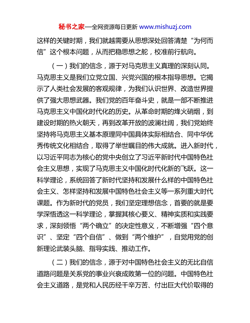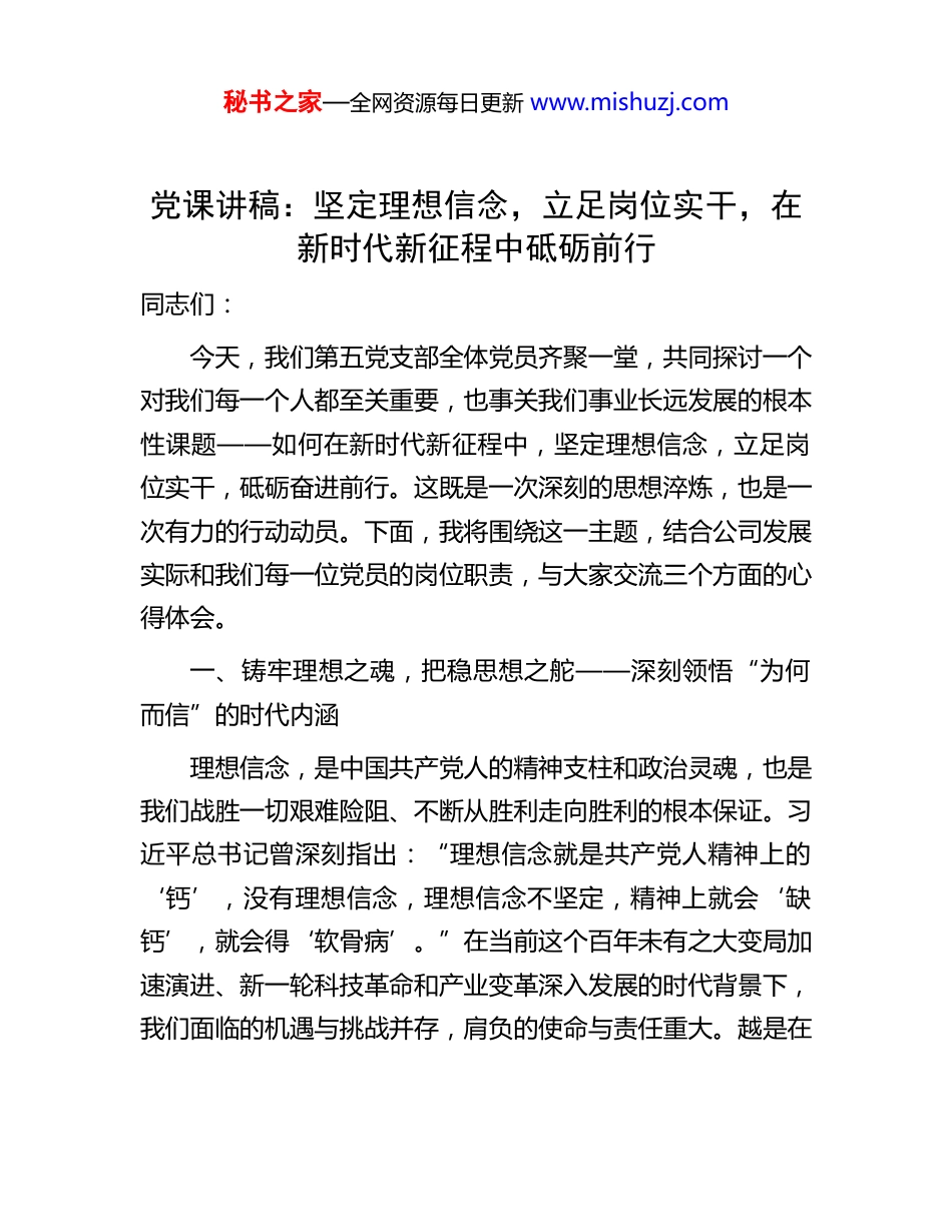 秘书之家—全网资源每日更新 www.mishuzj.com党课讲稿:坚定理想信念,立足岗位实干,在新时代新征程中砥砺前行同志们:今天,我们第五党支部全体党员齐聚一堂,共同探讨一个对我们每一个人都至关重要,也事关我们事业长远发展的根本性课题——如何在新时代新征程中,坚定理想信念,立足岗位实干,砥砺奋进前行。这既是一次深刻的思想淬炼,也是一次有力的行动动员。下面,我将围绕这一主题,结合公司发展实际和我们每一位党员的岗位职责,与大家交流三个方面的心得体会。一、铸牢理想之魂,把稳思想之舵——深刻领悟“为何而信”的时代内涵理想信念,是中国共产党人的精神支柱和政治灵魂,也是我们战胜一切艰难险阻、不断从胜利走向胜利的根本保证。习近平总书记曾深刻指出:“理想信念就是共产党人精神上的‘钙’,没有理想信念,理想信念不坚定,精神上就会‘缺钙’,就会得‘软骨病’。”在当前这个百年未有之大变局加速演进、新一轮科技革命和产业变革深入发展的时代背景下,我们面临的机遇与挑战并存,肩负的使命与责任重大。越是在秘书之家—全网资源每日更新 www.mishuzj.com这样的关键时期,我们就越需要从思想深处回答清楚“为何而信”这个根本问题,从而把稳思想之舵,校准前行航向。(一)我们的信念,源于对马克思主义真理的深刻认同。马克思主义是我们立党立国、兴党兴国的根本指导思想。它揭示了人类社会发展的客观规律,为我们认识世界、改造世界提供了强大思想武器。我们党的百年奋斗史,就是一部不断推进马克思主义中国化时代化的历史。从革命时期的烽火硝烟,到建设时期的热火朝天,再到改革开放的波澜壮阔,我们党始终坚持将马克思主义基本原理同中国具体实际相结合、同中华优秀传统文化相结合,取得了举世瞩目的伟大成就。进入新时代,以习近平同志为核心的党中央创立了习近平新时代中国特色社会主义思想,实现了马克思主义中国化时代化新的飞跃。这一科学理论,系统回答了新时代坚持和发展什么样的中国特色社会主义、怎样坚持和发展中国特色社会主义等一系列重大时代课题。作为新时代的党员,我们坚定理想信念,首要的就是要学深悟透这一科学理论,掌握其核心要义、精神实质和实践要求,深刻领悟“两个确立”的决定性意义,不断增强“四个意识”、坚定“四个自信”、做到“两个维护”,自觉用党的创新理论武装头脑、指导实践、推动工作。(二)我们的信念,源于对中国特色社会主义的无比自信道路问题是关系党的事业兴衰成败第一位的问题。中国特色社会主义道路,是党和人民历经千辛万苦、付出巨大代价取得的秘书之家—全网资源每日更新 www.mishuzj.com根本成就。这条道路,既坚持了科学社会主义的基本原则,又根据我国国情和时代特点赋予其鲜明的中国特色。实践是检验真理的唯一标准。几十年来,我们在这条道路上创造了经济快速发展和社会长期稳定两大奇迹,中华民族迎来了从站起来、富起来到强起来的伟大飞跃。反观世界上一些国家,由于道路选择的错误,陷入了政治动荡、经济停滞甚至社会撕裂的困境。历史和现实都雄辩地证明,中国特色社会主义道路是完全正确的、是行得通的。我们作为国有企业的党员,是这条道路的坚定实践者和捍卫者。*公司的发展壮大,正是中国特色社会主义制度优越性的生动缩影。我们必须倍加珍惜、长期坚持,以高度的道路自信、理论自信、制度自信、文化自信,心无旁骛地走好我们自己的路。(三)我们的信念,源于对实现中华民族伟大复兴的使命担当。实现中华民族伟大复兴,是近代以来中华民族最伟大的梦想。今天,我们比历史上任何时期都更接近、更有信心和能力实现这个目标。但行百里者半九十,越是接近目标,我们面临的风险挑战就越严峻复杂。作为国家经济体系的重要组成部分,我们*公司承担着服务区域经济发展、推动产业转型升级、保障关键供应链稳定的重要使命。我们正在推进的*智慧港口项目、*国际物流枢纽建设,以及我们*子公司正在攻坚的新能源汽车核心零部件国产化替代等重点任务,都与国家发展战略紧密相连,是我们服务构建新发展格局的具体行动。因此,我秘书之家—全网资源每日更新 www.mishuzj.com们每一位党员的理...