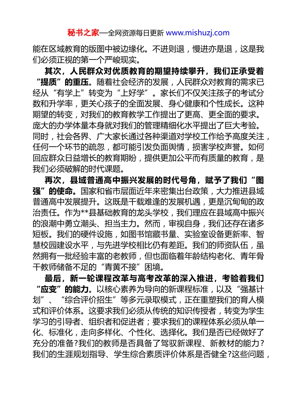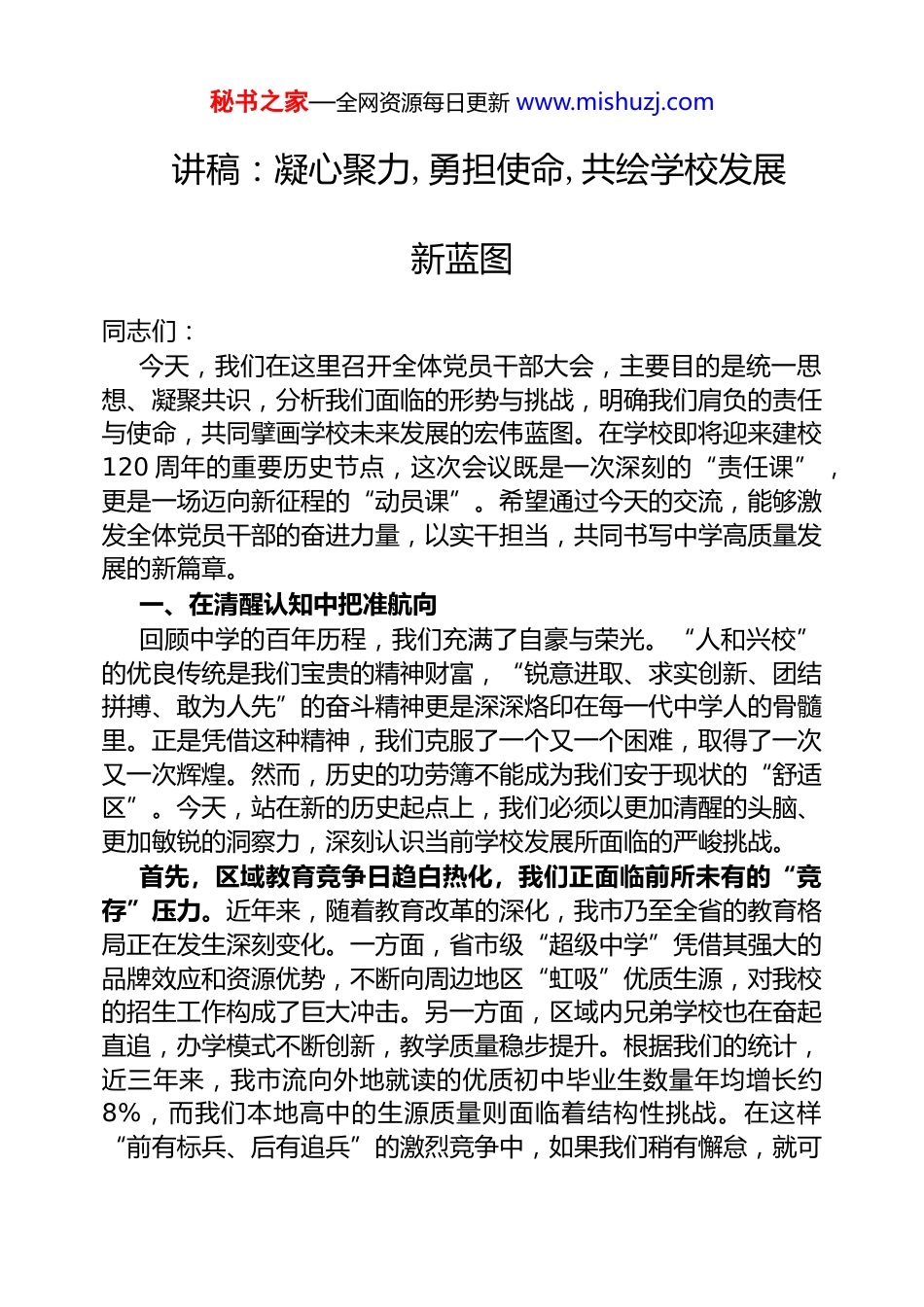 秘书之家—全网资源每日更新 www.mishuzj.com 讲稿:凝心聚力,勇担使命,共绘学校发展新蓝图同志们:今天,我们在这里召开全体党员干部大会,主要目的是统一思想、凝聚共识,分析我们面临的形势与挑战,明确我们肩负的责任与使命,共同擘画学校未来发展的宏伟蓝图。在学校即将迎来建校120 周年的重要历史节点,这次会议既是一次深刻的“责任课”,更是一场迈向新征程的“动员课”。希望通过今天的交流,能够激发全体党员干部的奋进力量,以实干担当,共同书写中学高质量发展的新篇章。一、在清醒认知中把准航向回顾中学的百年历程,我们充满了自豪与荣光。“人和兴校”的优良传统是我们宝贵的精神财富,“锐意进取、求实创新、团结拼搏、敢为人先”的奋斗精神更是深深烙印在每一代中学人的骨髓里。正是凭借这种精神,我们克服了一个又一个困难,取得了一次又一次辉煌。然而,历史的功劳簿不能成为我们安于现状的“舒适区”。今天,站在新的历史起点上,我们必须以更加清醒的头脑、更加敏锐的洞察力,深刻认识当前学校发展所面临的严峻挑战。首先,区域教育竞争日趋白热化,我们正面临前所未有的“竞存”压力。近年来,随着教育改革的深化,我市乃至全省的教育格局正在发生深刻变化。一方面,省市级“超级中学”凭借其强大的品牌效应和资源优势,不断向周边地区“虹吸”优质生源,对我校的招生工作构成了巨大冲击。另一方面,区域内兄弟学校也在奋起直追,办学模式不断创新,教学质量稳步提升。根据我们的统计,近三年来,我市流向外地就读的优质初中毕业生数量年均增长约8%,而我们本地高中的生源质量则面临着结构性挑战。在这样“前有标兵、后有追兵”的激烈竞争中,如果我们稍有懈怠,就可秘书之家—全网资源每日更新 www.mishuzj.com能在区域教育的版图中被边缘化。不进则退,慢进亦是退,这是我们必须正视的第一个严峻现实。其次,人民群众对优质教育的期望持续攀升,我们正承受着“提质”的重压。随着社会经济的发展,人民群众对教育的需求已经从“有学上”转变为“上好学”。家长们不仅关注孩子的考试分数和升学率,更关心孩子的全面发展、身心健康和个性成长。这种期望的转变,对我们的教育教学工作提出了更高、更全面的要求。庞大的办学体量本身就对我们的管理精细化水平提出了巨大考验。同时,社会各界、广大家长通过各种渠道对学校工作给予高度关注,任何一个环节的疏忽,都可能引发负面舆情,损害学校声誉。如何回应群众日益增长的教育期盼,提供更加公平而有质量的教育,是我们必须破解的时代课题。再次,县域普通高中振兴发展的时代号角,赋予了我们“图强”的使命。国家和省市层面近年来密集出台政策,大力推进县域普通高中发展提升。这既是千载难逢的发展机遇,更是沉甸甸的政治责任。作为**县基础教育的龙头学校,我们理应在县域高中振兴的浪潮中勇立潮头、担当主力。然而,审视自身,我们还存在诸多短板。我们的硬件设施,如图书馆藏书量、实验室设备更新率、智慧校园建设水平,与先进学校相比仍有差距。我们的师资队伍,虽然拥有一批经验丰富的老教师,但也面临着年龄结构老化、青年骨干教师储备不足的“青黄不接”困境。最后,新一轮课程改革与高考改革的深入推进,考验着我们“应变”的能力。以核心素养为导向的新课程标准,以及“强基计划”、“综合评价招生”等多元录取模式,正在重塑我们的育人模式和评价体系。这要求我们必须从传统的知识传授者,转变为学生学习的引导者、组织者和促进者;要求我们的课程体系必须从单一化、标准化,走向多样化、个性化、选择化。我们是否已经做好了充分的准备?我们的教师是否具备了驾驭新课程、新教材的能力?我们的生涯规划指导、学生综合素质评价体系是否健全?这些问题,秘书之家—全网资源每日更新 www.mishuzj.com直接关系到学校未来的核心竞争力,是我们必须立刻作答的改革考卷。同志们,挑战是客观存在的,回避解决不了问题,抱怨更无济于事。唯有直面挑战,正视差距,才能在危机中育新机,于变局中开新局。我们必须将这些压力转化为团结一心、主动作为的强大动力,才能赢得各方支持,在机遇与挑战的交织中,实...
