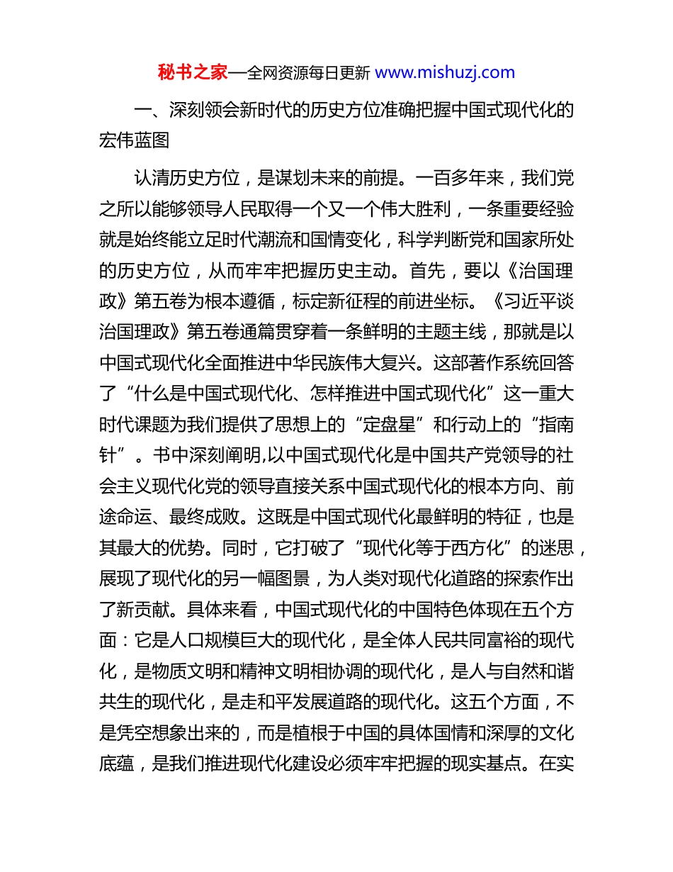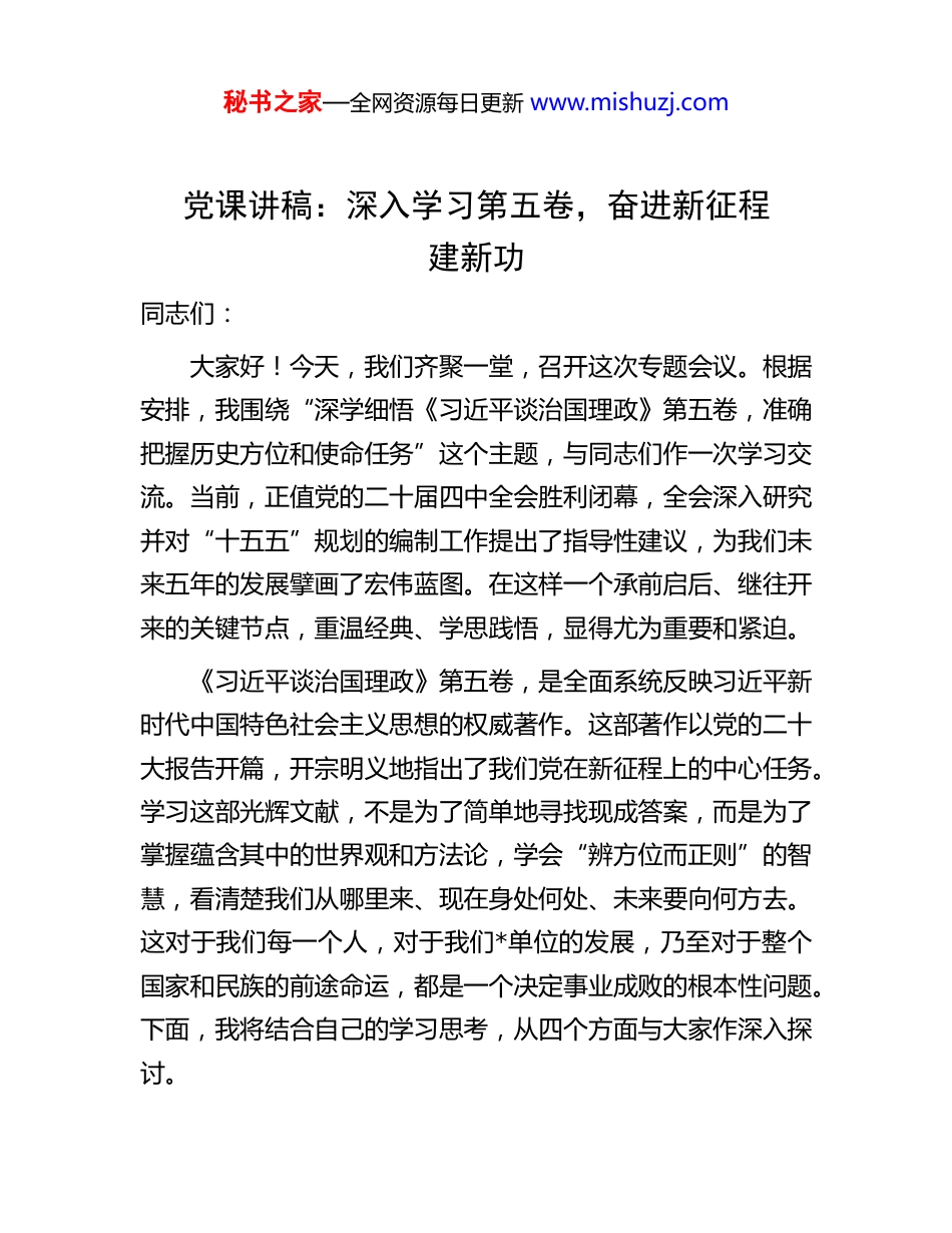 秘书之家—全网资源每日更新 www.mishuzj.com党课讲稿:深入学习第五卷,奋进新征程建新功同志们:大家好!今天,我们齐聚一堂,召开这次专题会议。根据安排,我围绕“深学细悟《习近平谈治国理政》第五卷,准确把握历史方位和使命任务”这个主题,与同志们作一次学习交流。当前,正值党的二十届四中全会胜利闭幕,全会深入研究并对“十五五”规划的编制工作提出了指导性建议,为我们未来五年的发展擘画了宏伟蓝图。在这样一个承前启后、继往开来的关键节点,重温经典、学思践悟,显得尤为重要和紧迫。《习近平谈治国理政》第五卷,是全面系统反映习近平新时代中国特色社会主义思想的权威著作。这部著作以党的二十大报告开篇,开宗明义地指出了我们党在新征程上的中心任务。学习这部光辉文献,不是为了简单地寻找现成答案,而是为了掌握蕴含其中的世界观和方法论,学会“辨方位而正则”的智慧,看清楚我们从哪里来、现在身处何处、未来要向何方去。这对于我们每一个人,对于我们*单位的发展,乃至对于整个国家和民族的前途命运,都是一个决定事业成败的根本性问题。下面,我将结合自己的学习思考,从四个方面与大家作深入探讨。秘书之家—全网资源每日更新 www.mishuzj.com一、深刻领会新时代的历史方位准确把握中国式现代化的宏伟蓝图认清历史方位,是谋划未来的前提。一百多年来,我们党之所以能够领导人民取得一个又一个伟大胜利,一条重要经验就是始终能立足时代潮流和国情变化,科学判断党和国家所处的历史方位,从而牢牢把握历史主动。首先,要以《治国理政》第五卷为根本遵循,标定新征程的前进坐标。《习近平谈治国理政》第五卷通篇贯穿着一条鲜明的主题主线,那就是以中国式现代化全面推进中华民族伟大复兴。这部著作系统回答了“什么是中国式现代化、怎样推进中国式现代化”这一重大时代课题为我们提供了思想上的“定盘星”和行动上的“指南针”。书中深刻阐明,以中国式现代化是中国共产党领导的社会主义现代化党的领导直接关系中国式现代化的根本方向、前途命运、最终成败。这既是中国式现代化最鲜明的特征,也是其最大的优势。同时,它打破了“现代化等于西方化”的迷思,展现了现代化的另一幅图景,为人类对现代化道路的探索作出了新贡献。具体来看,中国式现代化的中国特色体现在五个方面:它是人口规模巨大的现代化,是全体人民共同富裕的现代化,是物质文明和精神文明相协调的现代化,是人与自然和谐共生的现代化,是走和平发展道路的现代化。这五个方面,不是凭空想象出来的,而是植根于中国的具体国情和深厚的文化底蕴,是我们推进现代化建设必须牢牢把握的现实基点。在实秘书之家—全网资源每日更新 www.mishuzj.com践中,更要遵循其本质要求。这包括坚持中国共产党领导,坚持中国特色社会主义,实现高质量发展,发展全过程人民民主,丰富人民精神世界,实现全体人民共同富裕,促进人与自然和谐共生,推动构建人类命运共同体,创造人类文明新形态。这九个方面的要求,构成了一个内涵丰富、逻辑严密的有机整体,共同指明了中国式现代化的前进方向。中华民族伟大复兴已经进入了不可逆转的历史进程,这正是我们当前所处的宏大历史方位。二、聚焦高质量发展首要任务在深化改革与科技创新中勇毅前行明确了历史方位和宏伟蓝图,接下来的关键就是如何干、怎么走。习近平总书记在《治国理政》第五卷中明确指出,高质量发展是全面建设社会主义现代化国家的首要任务。而推动高质量发展的两大核心引擎,就是全面深化改革和科技创新。第一,以全面深化改革破除体制障碍,为现代化建设注入不竭动力。中国式现代化是在改革开放中不断推进的。面对新征程上的新挑战,特别是各种体制机制障碍,唯有拿出更大的勇气和智慧,坚定不移地推进改革。去年 7 月召开的党的二十届三中全会,吹响了新时代新征程上进一步全面深化改革的号角,审议通过的《中共中央关于进一步全面深化改革、推进中国式现代化的决定》就是一份纲领性的改革宣言。这份《决秘书之家—全网资源每日更新 www.mishuzj.com定》锚定 2035 年基本实现社会主义现代化的总目标,强调要更加注重系统集成、更加注...