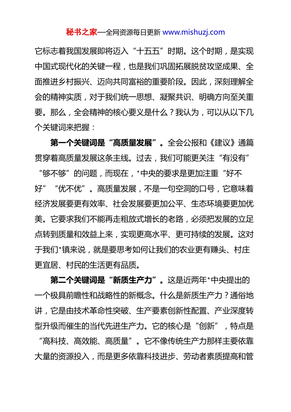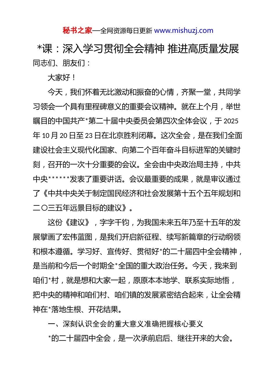 秘书之家—全网资源每日更新 www.mishuzj.com*课:深入学习贯彻全会精神 推进高质量发展同志们、朋友们:大家好!今天,我们怀着无比激动和振奋的心情,齐聚一堂,共同学习领会一个具有里程碑意义的重要会议精神。就在上个月,举世瞩目的中国共产*第二十届中央委员会第四次全体会议,于 2025年 10 月 20 日至 23 日在北京胜利闭幕。这次全会,是在我们全面建设社会主义现代化国家、向第二个百年奋斗目标进军的关键时刻,召开的一次十分重要的会议。全会由中央政治局主持,中共中央******发表了重要讲话。会议最重要的成果,就是审议通过了《中共中央关于制定国民经济和社会发展第十五个五年规划和二〇三五年远景目标的建议》。这份《建议》,字字千钧,为我国未来五年乃至十五年的发展擘画了宏伟蓝图,是我们开启新征程、续写新篇章的行动纲领和根本遵循。学习好、宣传好、贯彻好*的二十届四中全会精神,是当前和今后一个时期全*全国的重大政治任务。今天,我来到咱们*村,就是想和大家一起,原原本本地学、联系实际地悟,把中央的精神和咱们村、咱们镇的发展紧密结合起来,让全会精神在*落地生根、开花结果。一、深刻认识全会的重大意义准确把握核心要义*的二十届四中全会,是一次承前启后、继往开来的大会。秘书之家—全网资源每日更新 www.mishuzj.com它标志着我国发展即将迈入“十五五”时期。这个时期,是实现中国式现代化的关键一程,也是我们巩固拓展脱贫攻坚成果、全面推进乡村振兴、迈向共同富裕的重要阶段。因此,深刻理解全会的精神实质,对于我们统一思想、凝聚共识、明确方向至关重要。那么,全会精神的核心要义是什么?我认为,可以从以下几个关键词来把握:第一个关键词是“高质量发展”。全会公报和《建议》通篇贯穿着高质量发展这条主线。过去,我们可能更关注“有没有”“够不够”的问题,而现在,*中央的要求是更加注重“好不好”“优不优”。高质量发展,不是一句空洞的口号,它意味着经济发展要更有效率、社会发展要更加公平、生态环境要更加优美。它要求我们不能再走粗放式增长的老路,必须把发展的立足点转到质量和效益上来,实现更高水平、更可持续的发展。这对于我们*镇来说,就是要思考如何让我们的农业更有赚头、村庄更宜居、村民的生活更有品质。第二个关键词是“新质生产力”。这是近两年*中央提出的一个极具前瞻性和战略性的新概念。什么是新质生产力?通俗地讲,它是由技术革命性突破、生产要素创新性配置、产业深度转型升级而催生的当代先进生产力。它的核心是“创新”,特点是“高科技、高效能、高质量”。它不像传统生产力那样主要依靠大量的资源投入,而是更多依靠科技进步、劳动者素质提高和管秘书之家—全网资源每日更新 www.mishuzj.com理创新。对于我们农村地区而言,发展新质生产力,就是要用现代科技武装农业,比如推广精准灌溉、智能温控大棚、无人机植保;就是要用数字技术赋能乡村,比如发展农村电商、直播带货,把我们的特色农产品卖到全国各地;就是要培育新型农业经营主体,让有文化、懂技术、善经营的新型农民成为乡村振兴的主力军。第三个关键词是“共同富裕”。全会再次强调,要扎实推进共同富裕,坚持以人民为中心的发展思想。中国式现代化,是全体人民共同富裕的现代化。共同富裕不是“劫富济贫”,更不是搞平均主义“大锅饭”,而是通过高质量发展把“蛋糕”做大做好,然后通过合理的制度安排把“蛋糕”切好分好。这意味着我们要持续缩小城乡差距、区域差距和收入差距。具体到我们身边,就是要不断完善农村的基础设施,让村里的路更宽、灯更亮、网络更快;就是要提升公共服务水平,让孩子们在家门口能上好学,让老人们生病了能方便看医;就是要千方百计拓宽农民增收致富的渠道,让大家的腰包越来越鼓,日子越过越红火。第四个关键词是“安全与发展”。全会强调,要更好统筹发展和安全。安全是发展的前提,发展是安全的保障。这里的安全,是广义的安全,不仅包括国防安全、粮食安全,也包括生态安全、社会安全、生产安全。对我们基层来说,就是要守好粮食生产的底线,保障我们的“米袋子”“菜篮子”;就是要保护...