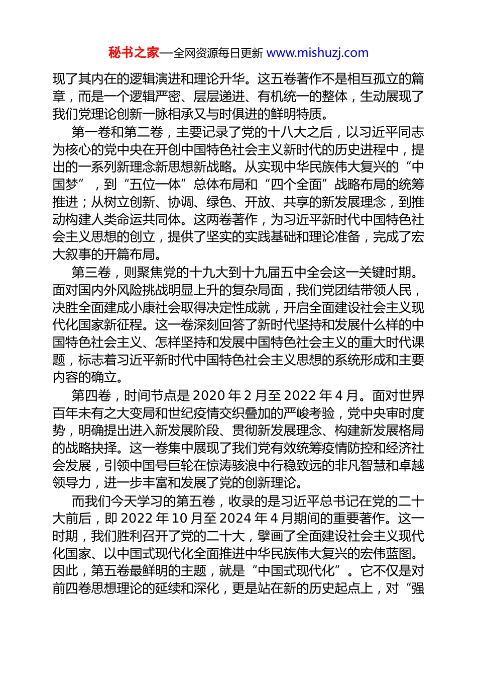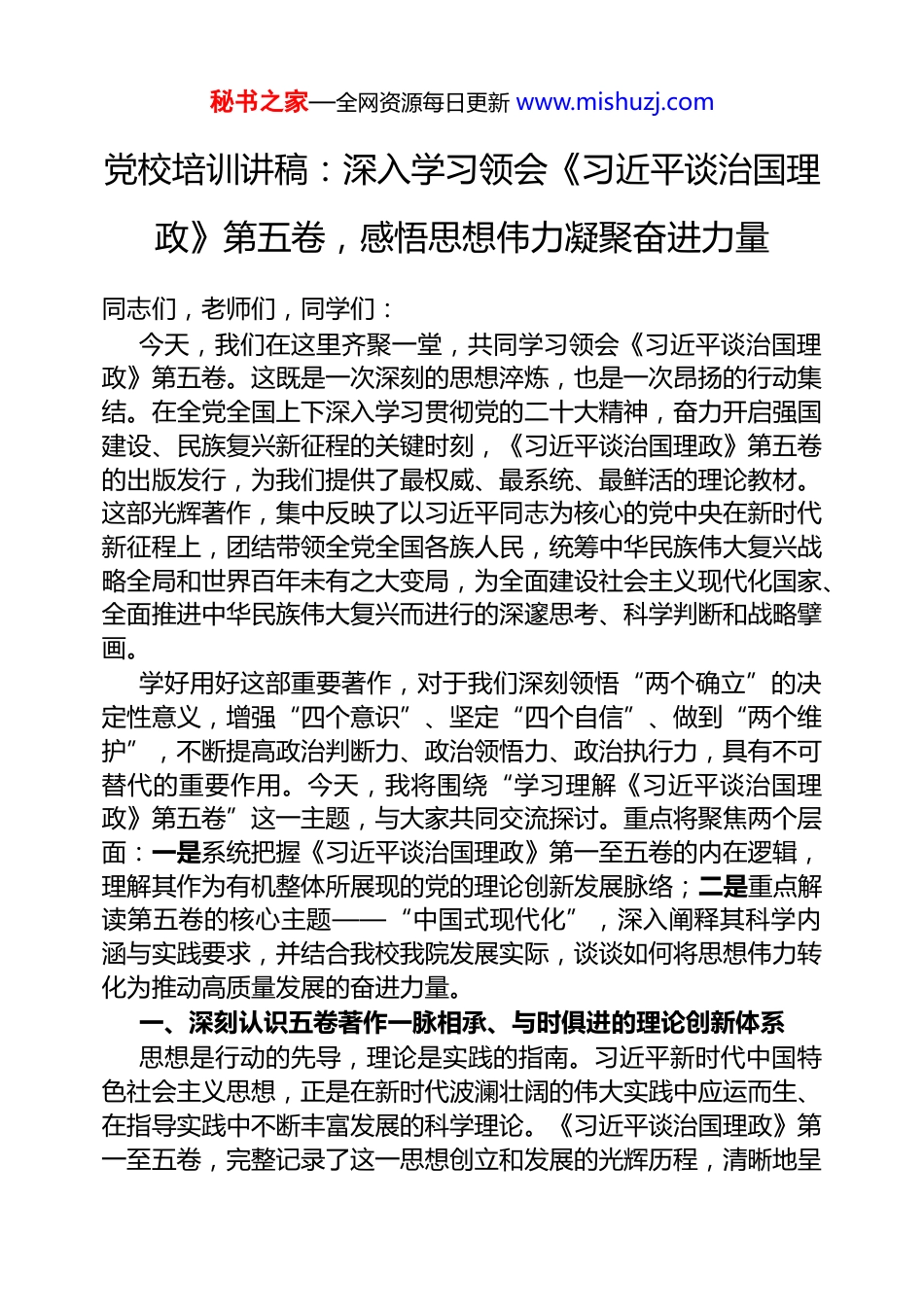 秘书之家—全网资源每日更新 www.mishuzj.com党校培训讲稿:深入学习领会《习近平谈治国理政》第五卷,感悟思想伟力凝聚奋进力量同志们,老师们,同学们:今天,我们在这里齐聚一堂,共同学习领会《习近平谈治国理政》第五卷。这既是一次深刻的思想淬炼,也是一次昂扬的行动集结。在全党全国上下深入学习贯彻党的二十大精神,奋力开启强国建设、民族复兴新征程的关键时刻,《习近平谈治国理政》第五卷的出版发行,为我们提供了最权威、最系统、最鲜活的理论教材。这部光辉著作,集中反映了以习近平同志为核心的党中央在新时代新征程上,团结带领全党全国各族人民,统筹中华民族伟大复兴战略全局和世界百年未有之大变局,为全面建设社会主义现代化国家、全面推进中华民族伟大复兴而进行的深邃思考、科学判断和战略擘画。学好用好这部重要著作,对于我们深刻领悟“两个确立”的决定性意义,增强“四个意识”、坚定“四个自信”、做到“两个维护”,不断提高政治判断力、政治领悟力、政治执行力,具有不可替代的重要作用。今天,我将围绕“学习理解《习近平谈治国理政》第五卷”这一主题,与大家共同交流探讨。重点将聚焦两个层面:一是系统把握《习近平谈治国理政》第一至五卷的内在逻辑,理解其作为有机整体所展现的党的理论创新发展脉络;二是重点解读第五卷的核心主题——“中国式现代化”,深入阐释其科学内涵与实践要求,并结合我校我院发展实际,谈谈如何将思想伟力转化为推动高质量发展的奋进力量。一、深刻认识五卷著作一脉相承、与时俱进的理论创新体系思想是行动的先导,理论是实践的指南。习近平新时代中国特色社会主义思想,正是在新时代波澜壮阔的伟大实践中应运而生、在指导实践中不断丰富发展的科学理论。《习近平谈治国理政》第一至五卷,完整记录了这一思想创立和发展的光辉历程,清晰地呈秘书之家—全网资源每日更新 www.mishuzj.com现了其内在的逻辑演进和理论升华。这五卷著作不是相互孤立的篇章,而是一个逻辑严密、层层递进、有机统一的整体,生动展现了我们党理论创新一脉相承又与时俱进的鲜明特质。第一卷和第二卷,主要记录了党的十八大之后,以习近平同志为核心的党中央在开创中国特色社会主义新时代的历史进程中,提出的一系列新理念新思想新战略。从实现中华民族伟大复兴的“中国梦”,到“五位一体”总体布局和“四个全面”战略布局的统筹推进;从树立创新、协调、绿色、开放、共享的新发展理念,到推动构建人类命运共同体。这两卷著作,为习近平新时代中国特色社会主义思想的创立,提供了坚实的实践基础和理论准备,完成了宏大叙事的开篇布局。第三卷,则聚焦党的十九大到十九届五中全会这一关键时期。面对国内外风险挑战明显上升的复杂局面,我们党团结带领人民,决胜全面建成小康社会取得决定性成就,开启全面建设社会主义现代化国家新征程。这一卷深刻回答了新时代坚持和发展什么样的中国特色社会主义、怎样坚持和发展中国特色社会主义的重大时代课题,标志着习近平新时代中国特色社会主义思想的系统形成和主要内容的确立。第四卷,时间节点是 2020 年 2 月至 2022 年 4 月。面对世界百年未有之大变局和世纪疫情交织叠加的严峻考验,党中央审时度势,明确提出进入新发展阶段、贯彻新发展理念、构建新发展格局的战略抉择。这一卷集中展现了我们党有效统筹疫情防控和经济社会发展,引领中国号巨轮在惊涛骇浪中行稳致远的非凡智慧和卓越领导力,进一步丰富和发展了党的创新理论。而我们今天学习的第五卷,收录的是习近平总书记在党的二十大前后,即 2022 年 10 月至 2024 年 4 月期间的重要著作。这一时期,我们胜利召开了党的二十大,擘画了全面建设社会主义现代化国家、以中国式现代化全面推进中华民族伟大复兴的宏伟蓝图。因此,第五卷最鲜明的主题,就是“中国式现代化”。它不仅是对前四卷思想理论的延续和深化,更是站在新的历史起点上,对“强秘书之家—全网资源每日更新 www.mishuzj.com国建设、民族复兴”这一中心任务的全面部署和系统阐发,是习近平新时代中国特色社会主义思想的最新成果和“集大成”之作。从第一卷到第...