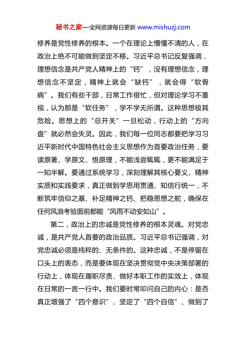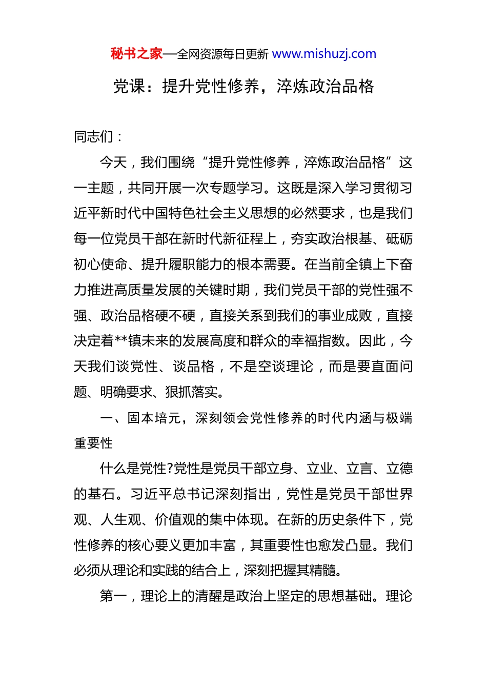 秘书之家—全网资源每日更新 www.mishuzj.com党课:提升党性修养,淬炼政治品格 同志们:今天,我们围绕“提升党性修养,淬炼政治品格”这一主题,共同开展一次专题学习。这既是深入学习贯彻习近平新时代中国特色社会主义思想的必然要求,也是我们每一位党员干部在新时代新征程上,夯实政治根基、砥砺初心使命、提升履职能力的根本需要。在当前全镇上下奋力推进高质量发展的关键时期,我们党员干部的党性强不强、政治品格硬不硬,直接关系到我们的事业成败,直接决定着**镇未来的发展高度和群众的幸福指数。因此,今天我们谈党性、谈品格,不是空谈理论,而是要直面问题、明确要求、狠抓落实。一、固本培元,深刻领会党性修养的时代内涵与极端重要性什么是党性?党性是党员干部立身、立业、立言、立德的基石。习近平总书记深刻指出,党性是党员干部世界观、人生观、价值观的集中体现。在新的历史条件下,党性修养的核心要义更加丰富,其重要性也愈发凸显。我们必须从理论和实践的结合上,深刻把握其精髓。第一,理论上的清醒是政治上坚定的思想基础。理论秘书之家—全网资源每日更新 www.mishuzj.com修养是党性修养的根本。一个在理论上懵懂不清的人,在政治上绝不可能做到坚定不移。习近平总书记反复强调,理想信念是共产党人精神上的“钙”,没有理想信念,理想信念不坚定,精神上就会“缺钙”,就会得“软骨病”。我们有些干部,日常工作很忙,但对理论学习不重视,认为那是“软任务”,学不学无所谓。这种思想极其危险。思想上的“总开关”一旦松动,行动上的“方向盘”就必然会失灵。因此,我们每一位同志都要把学习习近平新时代中国特色社会主义思想作为首要政治任务,要读原著、学原文、悟原理,不能浅尝辄辄,更不能满足于一知半解。要通过系统学习,深刻理解其核心要义、精神实质和实践要求,真正做到学思用贯通、知信行统一,不断筑牢信仰之基、补足精神之钙、把稳思想之舵,确保在任何风浪考验面前都能“风雨不动安如山”。第二,政治上的忠诚是党性修养的根本灵魂。对党忠诚,是共产党人首要的政治品质。习近平总书记强调,对党忠诚必须是纯粹的、无条件的。这种忠诚,不是停留在口头上的表态,而是要体现在坚决贯彻党中央决策部署的行动上,体现在履职尽责、做好本职工作的实效上,体现在日常的一言一行中。我们要时常叩问自己的内心:是否真正增强了“四个意识”、坚定了“四个自信”、做到了秘书之家—全网资源每日更新 www.mishuzj.com“两个维护”?在面对重大原则问题、面对各种错误思潮、面对各种诱惑考验时,我们的立场是否坚定、旗帜是否鲜明?近年来,我们党内查处的一些反面典型,如*志刚、*再勇等人,他们曾经也身居高位,也曾有过辉煌的过去,但最终走向腐化堕落,根本原因就在于理想信念坍塌,政治忠诚丧失。他们对党的指示阳奉阴违,搞“两面派”,做“两面人”,对个人利益的算计超过了对党和人民事业的忠诚,最终不仅毁了自己,也给党和人民的事业造成了巨大损失。这些惨痛的教训警示我们,政治忠诚是具体的、实践的。作为**镇的干部,忠诚就是要不折不扣地把上级的各项决策部署落到实处,就是要全心全意为**镇的发展和群众的福祉而奋斗,绝不允许搞变通、打折扣,更不允许出现政令不畅、执行不力的问题。第三,作风上的过硬是党性修养的直接体现。习近平总书记一针见血地指出,“作风问题本质上是党性问题”。党性纯不纯,看作风;品格硬不硬,也看作风。我们党最大的政治优势是密切联系群众,而脱离群众是我们党执政后的最大危险。因此,我们必须时刻牢记“我是谁、为了谁、依靠谁”这个根本问题。我们手中的权力是人民赋予的,只能用来为人民谋利益。然而,我们必须清醒地看到,一些不良作风在少数干部身上依然存在。形式秘书之家—全网资源每日更新 www.mishuzj.com主义、官僚主义的顽瘴痼疾尚未根除。有的干部习惯于“以会议落实会议、以文件落实文件”,表态多调门高,行动少落实差;有的干部高高在上,对群众的呼声和诉求漠不关心,门好进了、脸好看了,但事情依然难办;有的干部缺乏担当精神,遇到矛盾绕着走,碰到问题往上推,信奉“多做...