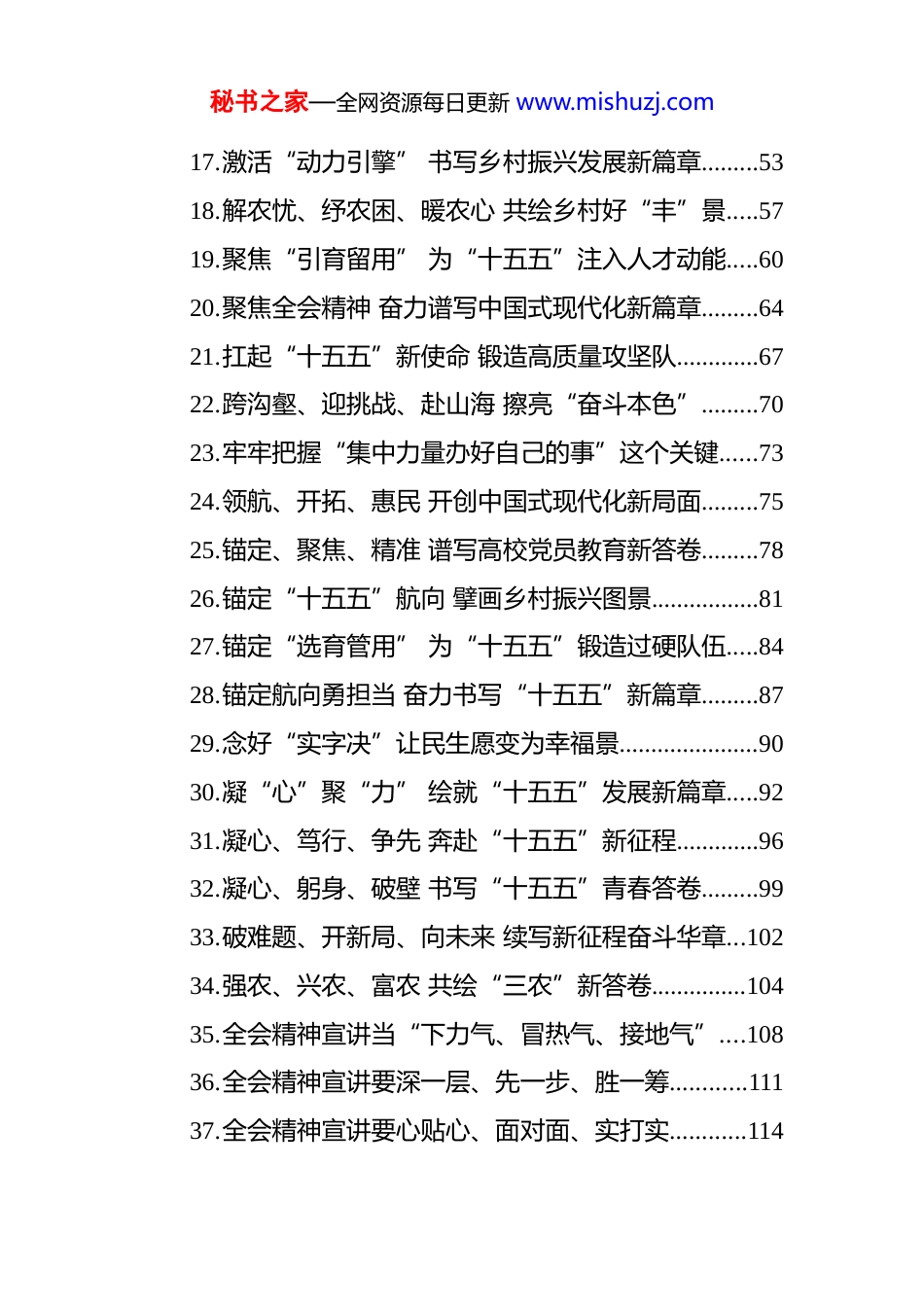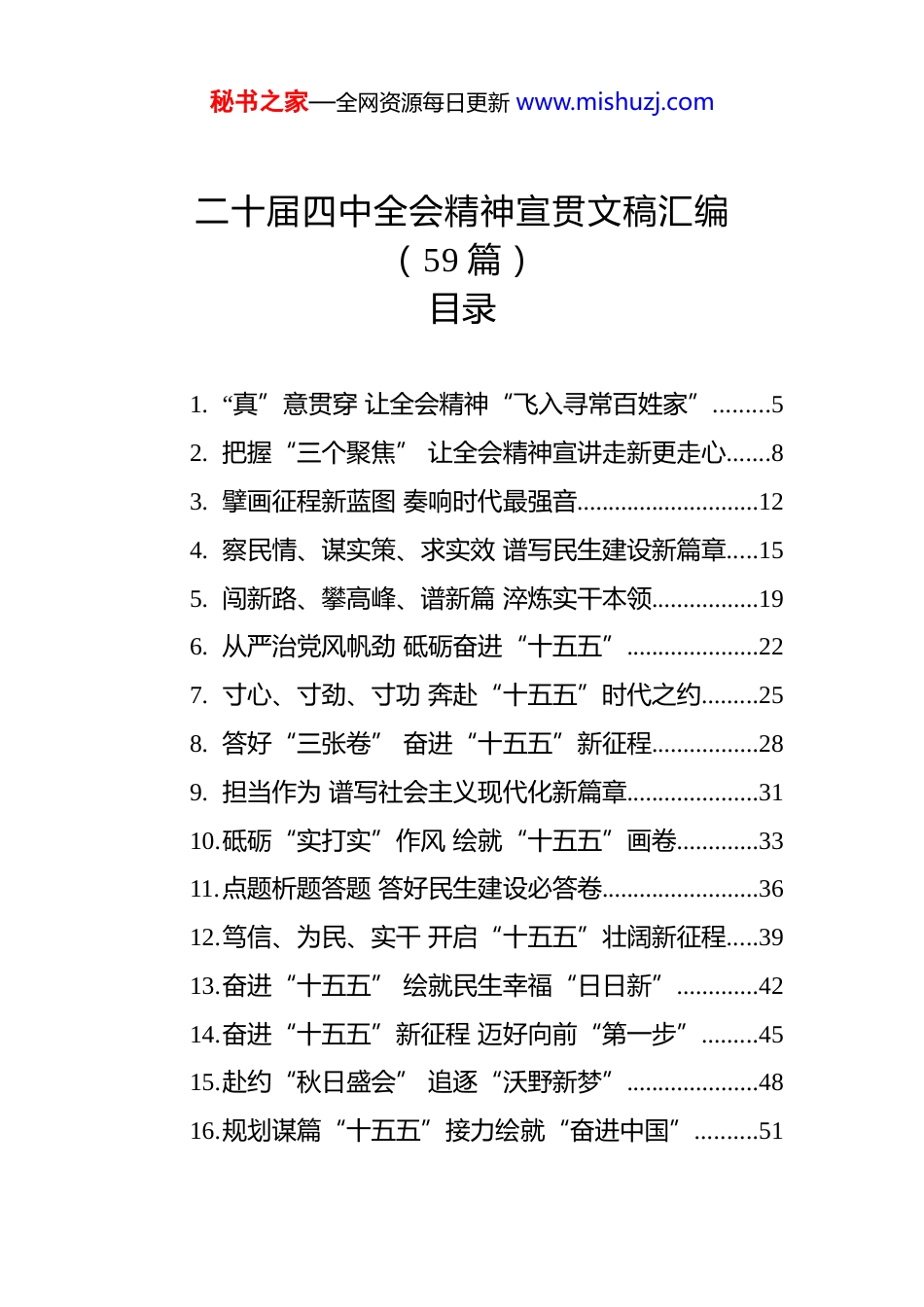 秘书之家—全网资源每日更新 www.mishuzj.com二十届四中全会精神宣贯文稿汇编(59 篇)目录1. “真”意贯穿 让全会精神“飞入寻常百姓家”.........52. 把握“三个聚焦” 让全会精神宣讲走新更走心.......83. 擘画征程新蓝图 奏响时代最强音.............................124. 察民情、谋实策、求实效 谱写民生建设新篇章.....155. 闯新路、攀高峰、谱新篇 淬炼实干本领.................196. 从严治党风帆劲 砥砺奋进“十五五”.....................227. 寸心、寸劲、寸功 奔赴“十五五”时代之约.........258. 答好“三张卷” 奋进“十五五”新征程.................289. 担当作为 谱写社会主义现代化新篇章.....................3110.砥砺“实打实”作风 绘就“十五五”画卷.............3311.点题析题答题 答好民生建设必答卷.........................3612.笃信、为民、实干 开启“十五五”壮阔新征程.....3913.奋进“十五五” 绘就民生幸福“日日新”.............4214.奋进“十五五”新征程 迈好向前“第一步”.........4515.赴约“秋日盛会” 追逐“沃野新梦”.....................4816.规划谋篇“十五五”接力绘就“奋进中国”..........51秘书之家—全网资源每日更新 www.mishuzj.com17.激活“动力引擎” 书写乡村振兴发展新篇章.........5318.解农忧、纾农困、暖农心 共绘乡村好“丰”景.....5719.聚焦“引育留用” 为“十五五”注入人才动能.....6020.聚焦全会精神 奋力谱写中国式现代化新篇章.........6421.扛起“十五五”新使命 锻造高质量攻坚队.............6722.跨沟壑、迎挑战、赴山海 擦亮“奋斗本色”.........7023.牢牢把握“集中力量办好自己的事”这个关键......7324.领航、开拓、惠民 开创中国式现代化新局面.........7525.锚定、聚焦、精准 谱写高校党员教育新答卷.........7826.锚定“十五五”航向 擘画乡村振兴图景.................8127.锚定“选育管用” 为“十五五”锻造过硬队伍.....8428.锚定航向勇担当 奋力书写“十五五”新篇章.........8729.念好“实字决”让民生愿变为幸福景......................9030.凝“心”聚“力” 绘就“十五五”发展新篇章.....9231.凝心、笃行、争先 奔赴“十五五”新征程.............9632.凝心、躬身、破壁 书写“十五五”青春答卷.........9933.破难题、开新局、向未来 续写新征程奋斗华章...10234.强农、兴农、富农 共绘“三农”新答卷...............10435.全会精神宣讲当“下力气、冒热气、接地气”....10836.全会精神宣讲要深一层、先一步、胜一筹............11137.全会精神宣讲要心贴心、面对面、实打实............114秘书之家—全网资源每日更新 www.mishuzj.com38.让全会精神“声”入人心 凝聚起奋进伟力...........11739.让全会精神入脑入心、见行见效............................12040.踏征程、逐梦想、向未来 彰显“青春底色”.......12341.同心同频同音 绘就“十五五”规划民生底色.......12642.稳舵扬帆 奋楫“十五五”现代化新征程...............12843.向下、向上、向民 让驻村更“驻心”...................13144.向阳向新向民 奔赴“十五五”规划时代之约.......13445.兴产业、净乡野、惠民生 绘就乡村新“丰”景...13746.兴农业、靓乡野、富乡亲 绘就乡村好“丰”景...14047.以“小”见“大” 让全会精神宣讲入脑入心.......14348.以全会精神为指引 在“十五五”展现青春担当...14749.以人才“活水”激荡“十五五”新浪潮................15050.以人民情怀 递进式写好“十五五”民生新篇章...15451.以实干担当答好新征程上高质量发展答卷............15752.迎风雨、立潮头、赴未来 践行初心使命...............16053.勇当时代“答卷人” 谱写“十五五”新篇章.......16354.用心用情用力书写温暖人心的“十五五”民生卷16755.在“回望”与“展望”中开好局、起好步............17056.驻村帮扶促振兴 为乡村振兴注入新动能...............17357.铸魂、夯基、扛责 筑牢新时代坚强战斗堡垒.......17658.走心 走新 走实 让全会...