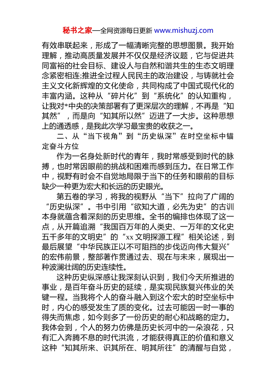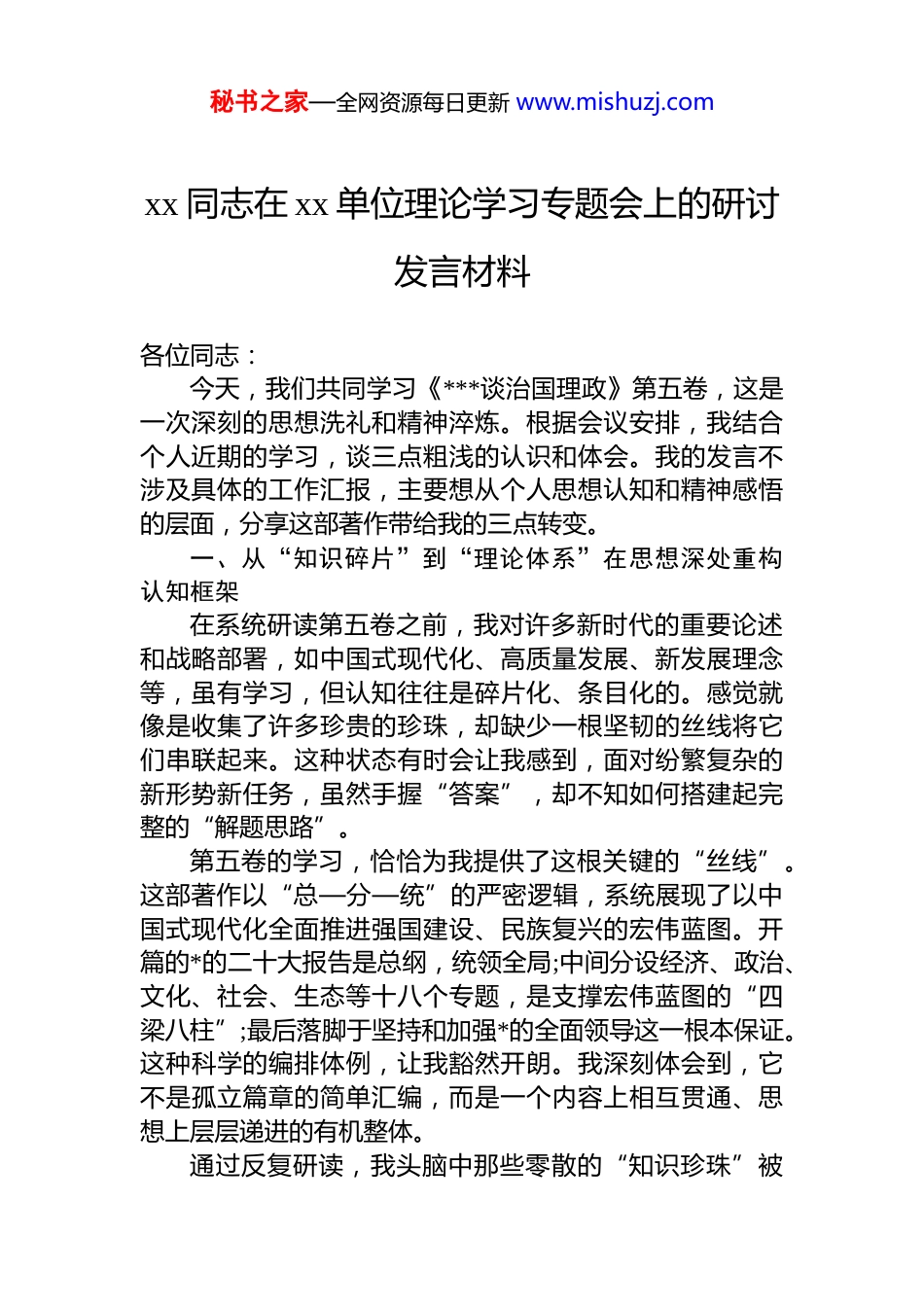 秘书之家—全网资源每日更新 www.mishuzj.comxx 同志在 xx 单位理论学习专题会上的研讨发言材料各位同志:今天,我们共同学习《***谈治国理政》第五卷,这是一次深刻的思想洗礼和精神淬炼。根据会议安排,我结合个人近期的学习,谈三点粗浅的认识和体会。我的发言不涉及具体的工作汇报,主要想从个人思想认知和精神感悟的层面,分享这部著作带给我的三点转变。一、从“知识碎片”到“理论体系”在思想深处重构认知框架在系统研读第五卷之前,我对许多新时代的重要论述和战略部署,如中国式现代化、高质量发展、新发展理念等,虽有学习,但认知往往是碎片化、条目化的。感觉就像是收集了许多珍贵的珍珠,却缺少一根坚韧的丝线将它们串联起来。这种状态有时会让我感到,面对纷繁复杂的新形势新任务,虽然手握“答案”,却不知如何搭建起完整的“解题思路”。第五卷的学习,恰恰为我提供了这根关键的“丝线”。这部著作以“总—分—统”的严密逻辑,系统展现了以中国式现代化全面推进强国建设、民族复兴的宏伟蓝图。开篇的*的二十大报告是总纲,统领全局;中间分设经济、政治、文化、社会、生态等十八个专题,是支撑宏伟蓝图的“四梁八柱”;最后落脚于坚持和加强*的全面领导这一根本保证。这种科学的编排体例,让我豁然开朗。我深刻体会到,它不是孤立篇章的简单汇编,而是一个内容上相互贯通、思想上层层递进的有机整体。通过反复研读,我头脑中那些零散的“知识珍珠”被秘书之家—全网资源每日更新 www.mishuzj.com有效串联起来,形成了一幅清晰完整的思想图景。我开始理解,推动高质量发展并不仅仅是经济议题,它与促进共同富裕的社会目标、建设人与自然和谐共生的生态文明理念紧密相连;推进全过程人民民主的政治建设,与铸就社会主义文化新辉煌的文化使命,共同构成了中国式现代化的丰富内涵。这种从“碎片化”到“系统化”的认知重构,让我对*中央的决策部署有了更深层次的理解,不再是“知其然”,而是向“知其所以然”迈进了一大步。这种思想上的通透感,是我此次学习最宝贵的收获之一。二、从“当下视角”到“历史纵深”在时空坐标中锚定奋斗方位作为一名身处新时代的青年,我时常感受到时代的脉搏,也时常因眼前的挑战和困难而感到压力。在日常工作中,视野有时会不自觉地局限于当下的任务和眼前的目标缺少一种更为宏大和长远的历史眼光。第五卷的学习,将我的视野从“当下”拉向了广阔的“历史纵深”。书中引用“欲知大道,必先为史”的古训本身就蕴含着深刻的历史思维。全书的编排也体现了这一点,从开篇追溯“我国百万年的人类史、一万年的文化史五千多年的文明史”的“xx 文明探源工程”相关论述,到最后展望“中华民族正以不可阻挡的步伐迈向伟大复兴”的宏伟前景,整部著作贯通过去、现在与未来,展现出一种波澜壮阔的历史连续性。这种历史纵深感让我深刻认识到,我们今天所推进的事业,是百年奋斗历史的延续,是实现民族复兴伟业的关键一程。当我将个人的奋斗融入到这个宏大的时空坐标中时,内心的感受发生了质的变化。过去可能因一时一事的得失而焦虑,如今则多了一份历史的耐心和战略的定力。我体会到,个人的努力仿佛是历史长河中的一朵浪花,只有汇入奔腾不息的时代洪流,才能获得真正的价值和意义这种“知其所来、识其所在、明其所往”的清醒与自觉,秘书之家—全网资源每日更新 www.mishuzj.com让我内心充满了前所未有的力量感和使命感,激励我以更开阔的胸襟和更坚定的步伐,走好我们这一代人的长征路。三、从“旁观心态”到“主人翁意识”在灵魂叩问中激发内生动力作为一名理论研究工作者,我有时会不自觉地陷入一种“旁观者”的角色,习惯于分析问题、解读理论,但在思想深处,与理论和实践之间似乎还隔着一层。这种心态使得理论学习有时会变成一种纯粹的智力活动,而未能真正触及灵魂、转化为改造主观世界的强大动力。第五卷中蕴含的深厚人民情怀和强烈担当精神,反复叩问着我的内心。书中“江山就是人民,人民就是江山”“我将无我、不负人民”等饱含深情的话语,不再是抽象的政治口号,而成为一种有温度、有力量的情感共鸣。这让我深刻反思,我的学...