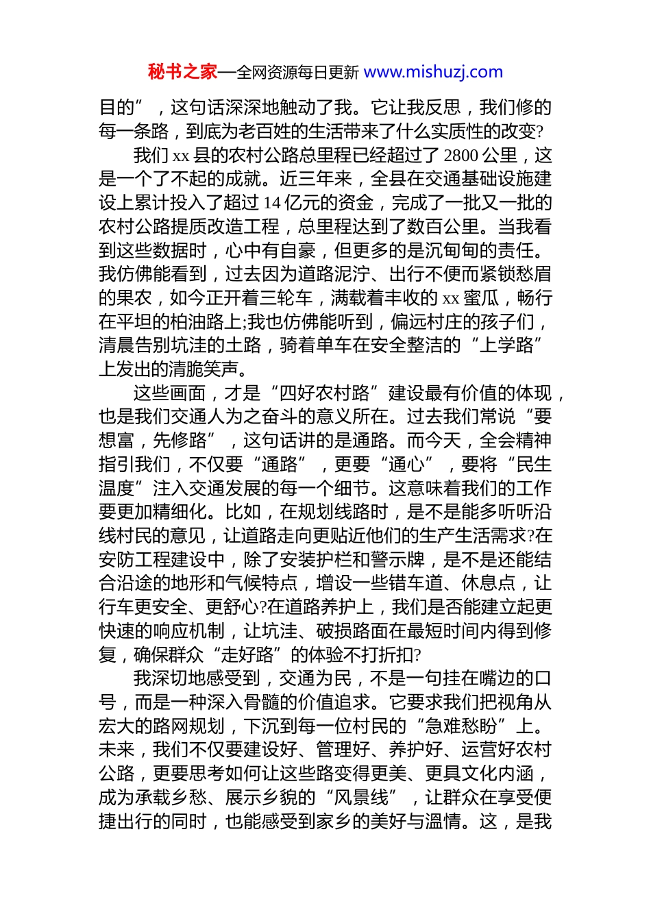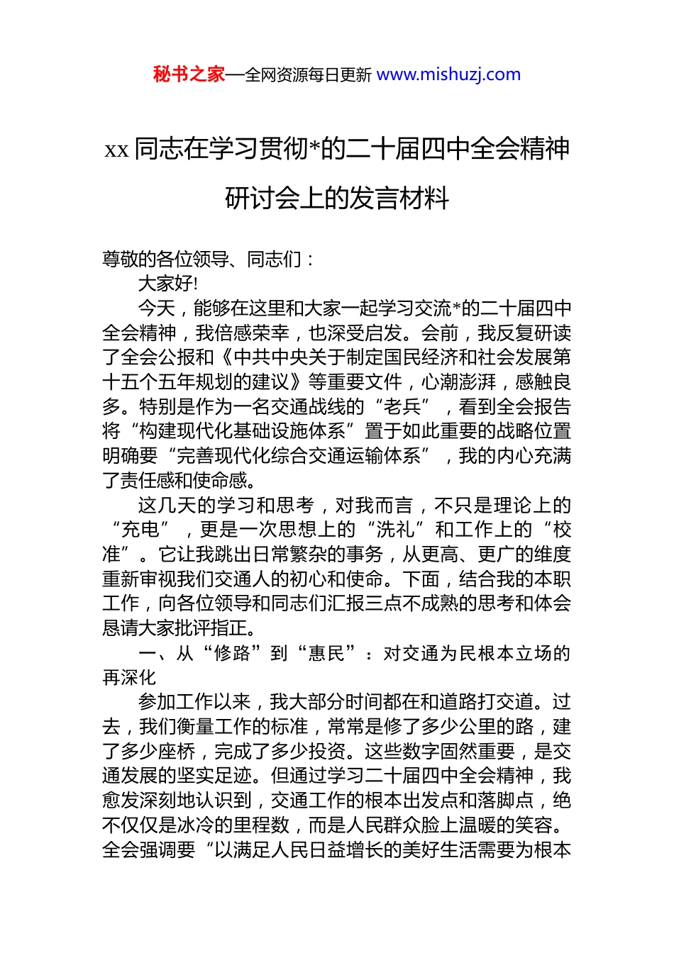 秘书之家—全网资源每日更新 www.mishuzj.comxx 同志在学习贯彻*的二十届四中全会精神研讨会上的发言材料尊敬的各位领导、同志们:大家好!今天,能够在这里和大家一起学习交流*的二十届四中全会精神,我倍感荣幸,也深受启发。会前,我反复研读了全会公报和《中共中央关于制定国民经济和社会发展第十五个五年规划的建议》等重要文件,心潮澎湃,感触良多。特别是作为一名交通战线的“老兵”,看到全会报告将“构建现代化基础设施体系”置于如此重要的战略位置明确要“完善现代化综合交通运输体系”,我的内心充满了责任感和使命感。这几天的学习和思考,对我而言,不只是理论上的“充电”,更是一次思想上的“洗礼”和工作上的“校准”。它让我跳出日常繁杂的事务,从更高、更广的维度重新审视我们交通人的初心和使命。下面,结合我的本职工作,向各位领导和同志们汇报三点不成熟的思考和体会恳请大家批评指正。一、从“修路”到“惠民”:对交通为民根本立场的再深化参加工作以来,我大部分时间都在和道路打交道。过去,我们衡量工作的标准,常常是修了多少公里的路,建了多少座桥,完成了多少投资。这些数字固然重要,是交通发展的坚实足迹。但通过学习二十届四中全会精神,我愈发深刻地认识到,交通工作的根本出发点和落脚点,绝不仅仅是冰冷的里程数,而是人民群众脸上温暖的笑容。全会强调要“以满足人民日益增长的美好生活需要为根本秘书之家—全网资源每日更新 www.mishuzj.com目的”,这句话深深地触动了我。它让我反思,我们修的每一条路,到底为老百姓的生活带来了什么实质性的改变?我们 xx 县的农村公路总里程已经超过了 2800 公里,这是一个了不起的成就。近三年来,全县在交通基础设施建设上累计投入了超过 14 亿元的资金,完成了一批又一批的农村公路提质改造工程,总里程达到了数百公里。当我看到这些数据时,心中有自豪,但更多的是沉甸甸的责任。我仿佛能看到,过去因为道路泥泞、出行不便而紧锁愁眉的果农,如今正开着三轮车,满载着丰收的 xx 蜜瓜,畅行在平坦的柏油路上;我也仿佛能听到,偏远村庄的孩子们,清晨告别坑洼的土路,骑着单车在安全整洁的“上学路”上发出的清脆笑声。这些画面,才是“四好农村路”建设最有价值的体现,也是我们交通人为之奋斗的意义所在。过去我们常说“要想富,先修路”,这句话讲的是通路。而今天,全会精神指引我们,不仅要“通路”,更要“通心”,要将“民生温度”注入交通发展的每一个细节。这意味着我们的工作要更加精细化。比如,在规划线路时,是不是能多听听沿线村民的意见,让道路走向更贴近他们的生产生活需求?在安防工程建设中,除了安装护栏和警示牌,是不是还能结合沿途的地形和气候特点,增设一些错车道、休息点,让行车更安全、更舒心?在道路养护上,我们是否能建立起更快速的响应机制,让坑洼、破损路面在最短时间内得到修复,确保群众“走好路”的体验不打折扣?我深切地感受到,交通为民,不是一句挂在嘴边的口号,而是一种深入骨髓的价值追求。它要求我们把视角从宏大的路网规划,下沉到每一位村民的“急难愁盼”上。未来,我们不仅要建设好、管理好、养护好、运营好农村公路,更要思考如何让这些路变得更美、更具文化内涵,成为承载乡愁、展示乡貌的“风景线”,让群众在享受便捷出行的同时,也能感受到家乡的美好与溫情。这,是我秘书之家—全网资源每日更新 www.mishuzj.com对交通为民立场的新认识,也是我今后努力的方向。二、从“支撑”到“赋能”:对交通强基战略作用的再思考长期以来,我们习惯将交通定位为经济社会发展的“先行官”和“基础性支撑”。这个定位没有错,但学习了全会精神后,我感到这个定位需要进一步深化。全会提出要“加快发展新质生产力”,这为我们交通工作打开了全新的想象空间。交通不应再仅仅是被动地“支撑”产业发展,而应主动地“赋能”产业升级,成为激发新质生产力、促进区域经济高质量发展的强劲引擎。这种从“支撑”到“赋能”的角色转变,要求我们必须打破“就交通论交通”的思维定式,积极拥抱“交通+”融合发展的大趋势。我们 xx 县有得天独厚的资源禀...