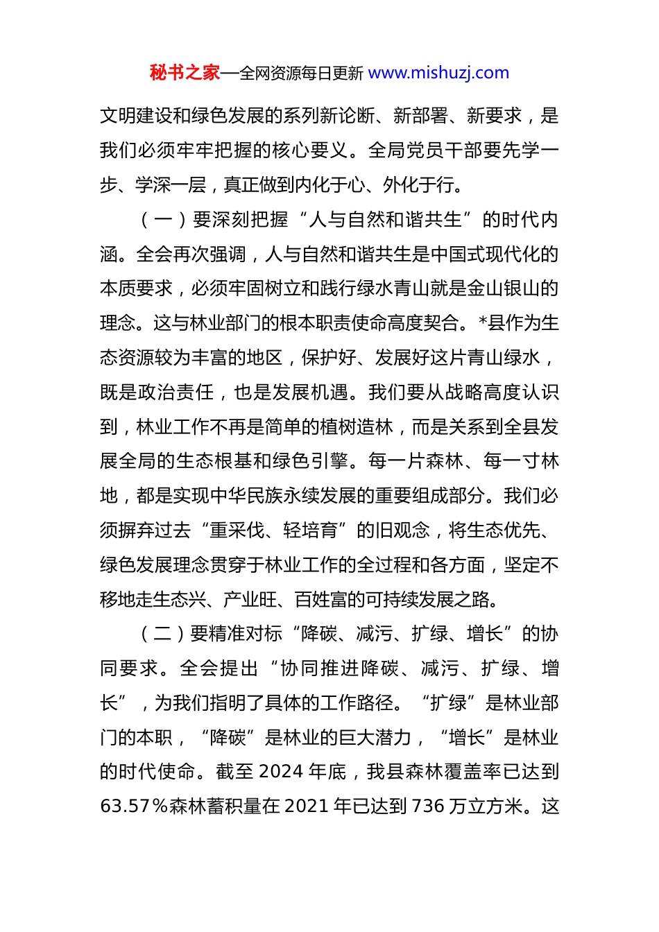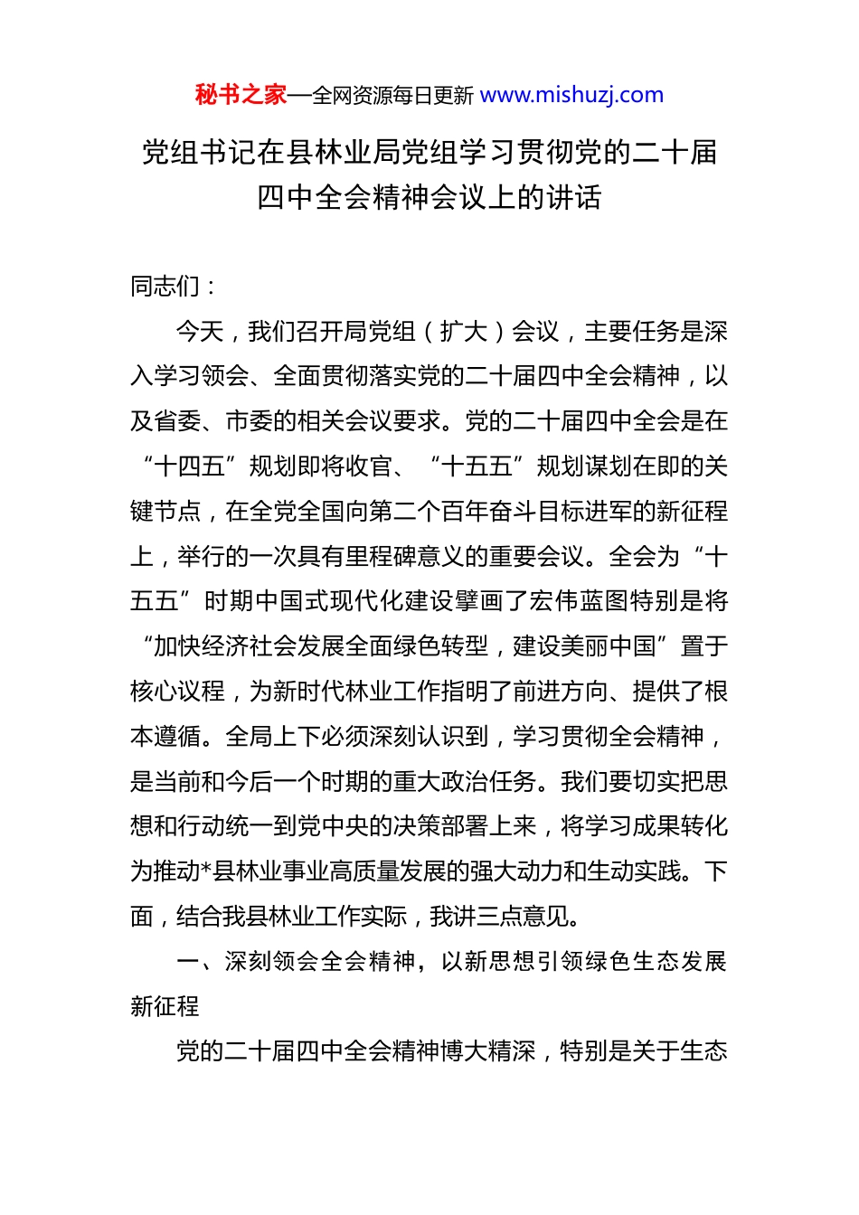 秘书之家—全网资源每日更新 www.mishuzj.com党组书记在县林业局党组学习贯彻党的二十届四中全会精神会议上的讲话 同志们:今天,我们召开局党组(扩大)会议,主要任务是深入学习领会、全面贯彻落实党的二十届四中全会精神,以及省委、市委的相关会议要求。党的二十届四中全会是在“十四五”规划即将收官、“十五五”规划谋划在即的关键节点,在全党全国向第二个百年奋斗目标进军的新征程上,举行的一次具有里程碑意义的重要会议。全会为“十五五”时期中国式现代化建设擘画了宏伟蓝图特别是将“加快经济社会发展全面绿色转型,建设美丽中国”置于核心议程,为新时代林业工作指明了前进方向、提供了根本遵循。全局上下必须深刻认识到,学习贯彻全会精神,是当前和今后一个时期的重大政治任务。我们要切实把思想和行动统一到党中央的决策部署上来,将学习成果转化为推动*县林业事业高质量发展的强大动力和生动实践。下面,结合我县林业工作实际,我讲三点意见。一、深刻领会全会精神,以新思想引领绿色生态发展新征程党的二十届四中全会精神博大精深,特别是关于生态秘书之家—全网资源每日更新 www.mishuzj.com文明建设和绿色发展的系列新论断、新部署、新要求,是我们必须牢牢把握的核心要义。全局党员干部要先学一步、学深一层,真正做到内化于心、外化于行。(一)要深刻把握“人与自然和谐共生”的时代内涵。全会再次强调,人与自然和谐共生是中国式现代化的本质要求,必须牢固树立和践行绿水青山就是金山银山的理念。这与林业部门的根本职责使命高度契合。*县作为生态资源较为丰富的地区,保护好、发展好这片青山绿水,既是政治责任,也是发展机遇。我们要从战略高度认识到,林业工作不再是简单的植树造林,而是关系到全县发展全局的生态根基和绿色引擎。每一片森林、每一寸林地,都是实现中华民族永续发展的重要组成部分。我们必须摒弃过去“重采伐、轻培育”的旧观念,将生态优先、绿色发展理念贯穿于林业工作的全过程和各方面,坚定不移地走生态兴、产业旺、百姓富的可持续发展之路。(二)要精准对标“降碳、减污、扩绿、增长”的协同要求。全会提出“协同推进降碳、减污、扩绿、增长”,为我们指明了具体的工作路径。“扩绿”是林业部门的本职,“降碳”是林业的巨大潜力,“增长”是林业的时代使命。截至 2024 年底,我县森林覆盖率已达到63.57%森林蓄积量在 2021 年已达到 736 万立方米。这秘书之家—全网资源每日更新 www.mishuzj.com些成绩来之不易,但与新时代的要求相比,仍有提升空间。我们要在巩固现有成果的基础上,持续推进国土绿化行动,特别是要注重提升森林质量,通过科学的森林抚育和结构调整,增强森林生态系统的稳定性和碳汇能力。要积极谋划林业碳汇项目,探索生态产品价值实现的有效路径,让森林“四库”功能得到更充分地发挥,真正将生态优势转化为经济发展优势。(三)要科学谋划服务“十五五”规划的林业蓝图。全会系统谋划了“十五五”时期我国发展的宏伟蓝图,强调其承前启后的关键作用。作为基层林业部门,我们必须主动融入国家和省市发展大局,高质量编制好我县的“十五五”林业发展专项规划。这个规划不能是纸上画画、墙上挂挂,必须紧密结合*县的资源禀赋、产业基础和发展短板,发扬民主、开门问策、集思广益。要在国土空间总体规划的框架下,明确未来五年我县在国家储备林建设、重点生态功能区修复、林下经济产业集群发展、生态旅游康养融合等方面的具体目标、重点项目和政策措施,确保规划既有战略高度,又有实践深度,为未来五年乃至更长时期*林业的发展立好柱、架好梁。二、聚焦重点任务突破,以新作为开创林业高质量发展新局面秘书之家—全网资源每日更新 www.mishuzj.com学习贯彻全会精神,关键在于落实。我们要将全会精神转化为推动工作的具体行动,找准切入点和着力点,集中力量在关键领域实现新突破,推动*林业工作再上新台阶。(一)要全力推动林下经济从“点上开花”向“面上结果”转变。发展林下经济是践行“绿水青山就是金山银山”理念最直接、最有效的途径之一,是实现生态保护、林农增收和乡村振兴多赢的黄金产...