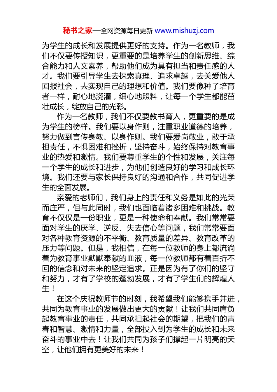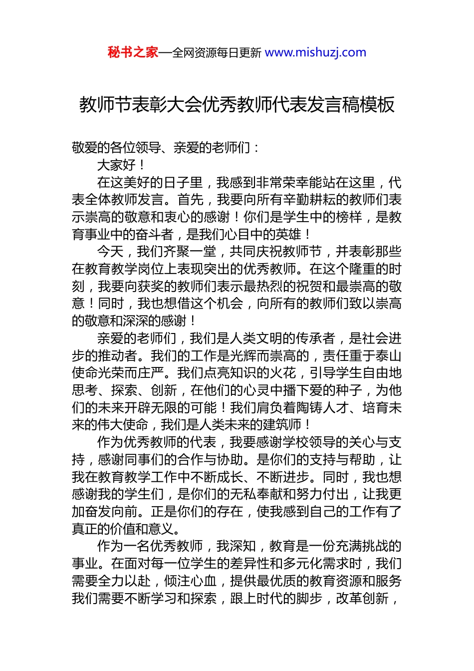 秘书之家—全网资源每日更新 www.mishuzj.com教师节表彰大会优秀教师代表发言稿模板敬爱的各位领导、亲爱的老师们:大家好!在这美好的日子里,我感到非常荣幸能站在这里,代表全体教师发言。首先,我要向所有辛勤耕耘的教师们表示崇高的敬意和衷心的感谢!你们是学生中的榜样,是教育事业中的奋斗者,是我们心目中的英雄!今天,我们齐聚一堂,共同庆祝教师节,并表彰那些在教育教学岗位上表现突出的优秀教师。在这个隆重的时刻,我要向获奖的教师们表示最热烈的祝贺和最崇高的敬意!同时,我也想借这个机会,向所有的教师们致以崇高的敬意和深深的感谢!亲爱的老师们,我们是人类文明的传承者,是社会进步的推动者。我们的工作是光辉而崇高的,责任重于泰山使命光荣而庄严。我们点亮知识的火花,引导学生自由地思考、探索、创新,在他们的心灵中播下爱的种子,为他们的未来开辟无限的可能!我们肩负着陶铸人才、培育未来的伟大使命,我们是人类未来的建筑师!作为优秀教师的代表,我要感谢学校领导的关心与支持,感谢同事们的合作与协助。是你们的支持与帮助,让我在教育教学工作中不断成长、不断进步。同时,我也想感谢我的学生们,是你们的无私奉献和努力付出,让我更加奋发向前。正是你们的存在,使我感到自己的工作有了真正的价值和意义。作为一名优秀教师,我深知,教育是一份充满挑战的事业。在面对每一位学生的差异性和多元化需求时,我们需要全力以赴,倾注心血,提供最优质的教育资源和服务我们需要不断学习和探索,跟上时代的脚步,改革创新,秘书之家—全网资源每日更新 www.mishuzj.com为学生的成长和发展提供更好的支持。作为一名教师,我们不仅要传授知识,更重要的是培养学生的创新思维、综合能力和人文素养,帮助他们成为具有担当和责任感的人才。我们要引导学生去探索真理、追求卓越,去关爱他人回报社会,去实现自己的理想和价值。我们要像种子培育者一样,耐心地浇灌,细心地照料,让每一个学生都能茁壮成长,绽放自己的光彩。作为一名教师,我们不仅要教书育人,更重要的是成为学生的榜样。我们要以身作则,注重职业道德的培养,努力做到言传身教、以身作则。我们要爱岗敬业,敢于承担责任,不惧困难和挫折,坚持奋斗,始终保持对教育事业的热爱和激情。我们要尊重学生的个性和发展,关注每一个学生的成长和进步,为他们创造良好的学习和成长环境。我们还要与家长保持良好的沟通和合作,共同促进学生的全面发展。亲爱的老师们,我们身上的责任和义务是如此的光荣而庄严,但与此同时,我们也面临着诸多困难和挑战。教育不仅仅是一份职业,更是一种使命和奉献。我们常常要面对学生的厌学、逆反、失去信心等问题,我们常常要面对各种教育资源的不平衡、教育质量的差异、教育改革的压力等问题。但是,我相信,在每一位教师的身上都流淌着为教育事业默默奉献的血液,每一位教师都有着百折不回的信念和对未来的坚定追求。正是因为有了你们的坚守和努力,才有了学校的蓬勃发展,才有了学生们的辉煌人生!在这个庆祝教师节的时刻,我希望我们能够携手并进,共同为教育事业的发展做出更大的贡献!让我们共同肩负起教育事业的责任,共同承担起社会的期望,把我们的青春和智慧、激情和力量,全部投入到为学生的成长和未来奋斗的事业中去!让我们共同为孩子们撑起一片明亮的天空,让他们拥有更美好的未来!秘书之家—全网资源每日更新 www.mishuzj.com最后,再次向全体教师表示崇高的敬意和深深的感谢!祝愿我们在教育事业中,不断进步、不断创新,为学生的成长和幸福,为教育事业的繁荣和进步,做出更大的贡献谢谢大家!
