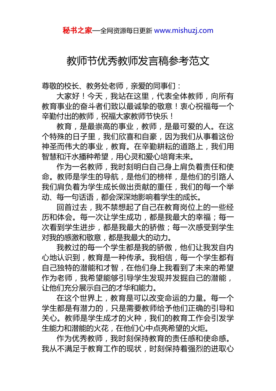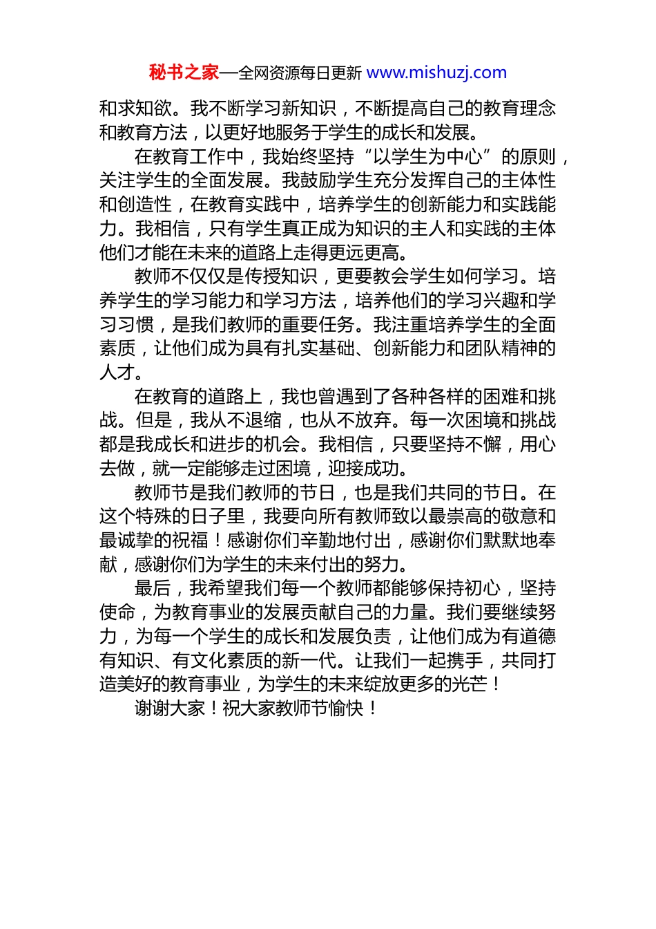 秘书之家—全网资源每日更新 www.mishuzj.com教师节优秀教师发言稿参考范文尊敬的校长、教务处老师,亲爱的同事们:大家好!今天,我站在这里,代表全体教师,向所有教育事业的奋斗者们致以最诚挚的敬意!衷心祝福每一个辛勤付出的教师,祝福大家教师节快乐!教育,是最崇高的事业,教师,是最可爱的人。在这个特殊的日子里,我们欣喜和自豪,因为我们从事着这份神圣而伟大的事业,教育。在辛勤耕耘的道路上,我们用智慧和汗水播种希望,用心灵和爱心培育未来。作为一名教师,我时刻明白自己身上肩负着责任和使命。教师是学生的导航,是他们的榜样,是他们的引路人我们肩负着为学生成长做出贡献的重任,我们的每一个举动、每一句话语,都会深深地影响着学生的成长。回首过去,我不禁想起了自己在教育岗位上的一些经历和体会。每一次让学生成功,都是我最大的幸福;每一次看到学生进步,都是我最大的骄傲;每一次感受到学生对我的感激和敬意,都是我最大的动力。我教过的每一个学生都是我的骄傲,他们让我发自内心地认识到,教育是一种传承。我相信,每一个学生都有自己独特的潜能和才智,在他们身上我看到了未来的希望作为老师,我希望能够引导学生发现并发掘自己的潜能,让他们充分展示自己的才华和能力。在这个世界上,教育是可以改变命运的力量。每一个学生都是有潜力的,只是需要教师给予他们正确的引导和关心。教师是学生成才的火种,我们的教育工作会引发学生能力和潜能的火花,在他们心中点亮希望的火炬。作为优秀教师,我时刻保持教育的责任感和使命感。我从不满足于教育工作的现状,时刻保持着强烈的进取心秘书之家—全网资源每日更新 www.mishuzj.com和求知欲。我不断学习新知识,不断提高自己的教育理念和教育方法,以更好地服务于学生的成长和发展。在教育工作中,我始终坚持“以学生为中心”的原则,关注学生的全面发展。我鼓励学生充分发挥自己的主体性和创造性,在教育实践中,培养学生的创新能力和实践能力。我相信,只有学生真正成为知识的主人和实践的主体他们才能在未来的道路上走得更远更高。教师不仅仅是传授知识,更要教会学生如何学习。培养学生的学习能力和学习方法,培养他们的学习兴趣和学习习惯,是我们教师的重要任务。我注重培养学生的全面素质,让他们成为具有扎实基础、创新能力和团队精神的人才。在教育的道路上,我也曾遇到了各种各样的困难和挑战。但是,我从不退缩,也从不放弃。每一次困境和挑战都是我成长和进步的机会。我相信,只要坚持不懈,用心去做,就一定能够走过困境,迎接成功。教师节是我们教师的节日,也是我们共同的节日。在这个特殊的日子里,我要向所有教师致以最崇高的敬意和最诚挚的祝福!感谢你们辛勤地付出,感谢你们默默地奉献,感谢你们为学生的未来付出的努力。最后,我希望我们每一个教师都能够保持初心,坚持使命,为教育事业的发展贡献自己的力量。我们要继续努力,为每一个学生的成长和发展负责,让他们成为有道德有知识、有文化素质的新一代。让我们一起携手,共同打造美好的教育事业,为学生的未来绽放更多的光芒!谢谢大家!祝大家教师节愉快!
