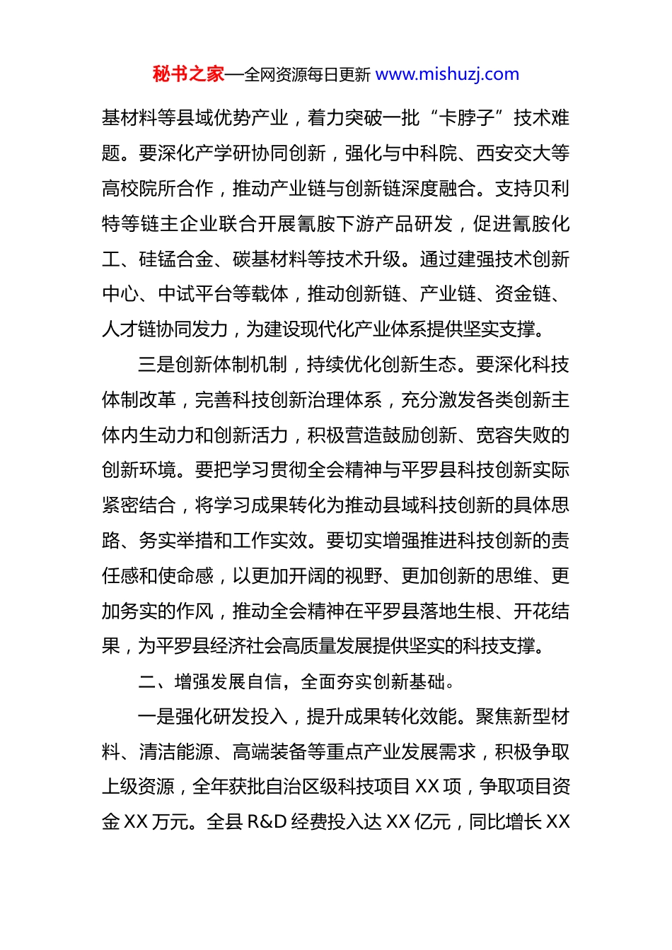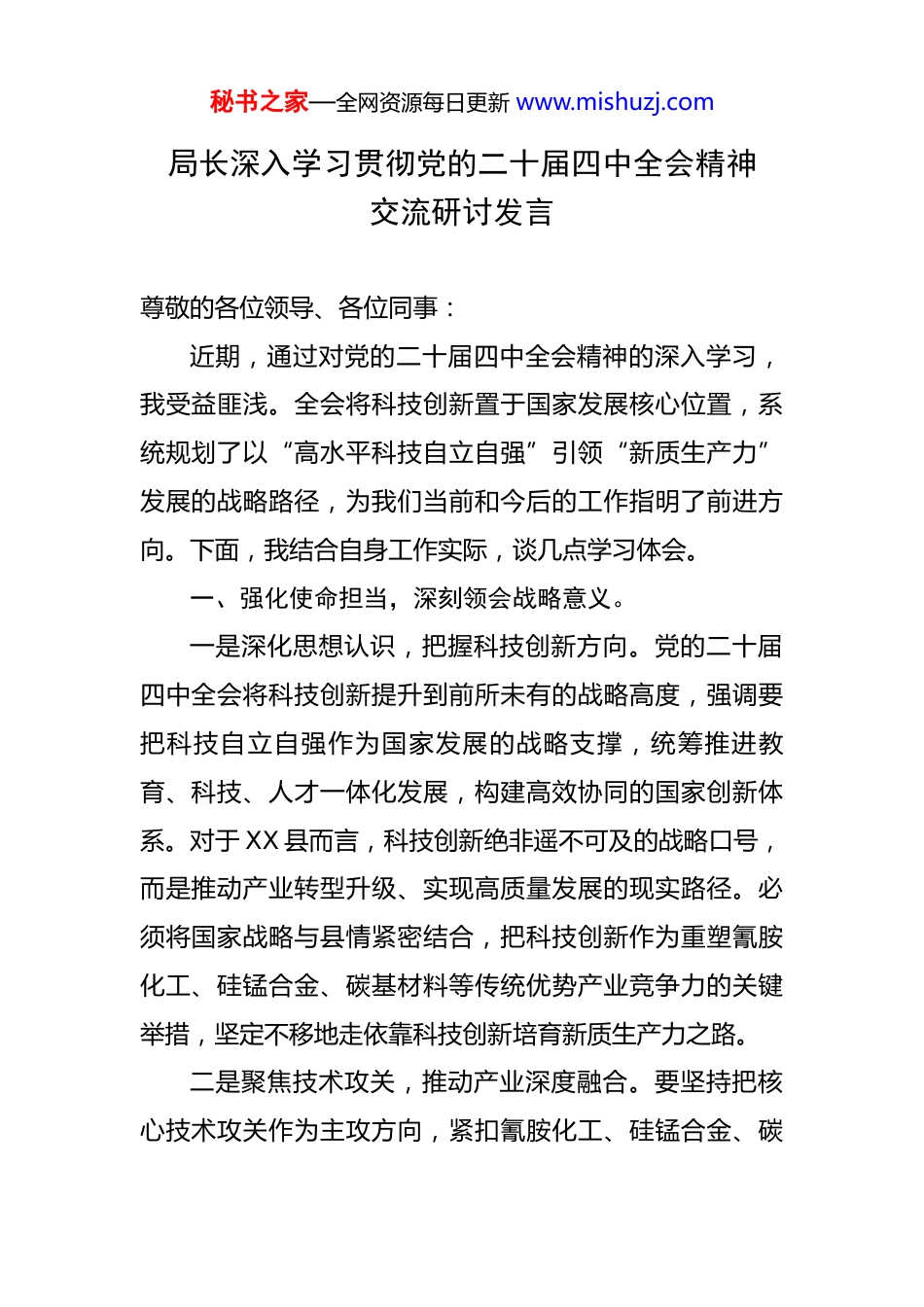 秘书之家—全网资源每日更新 www.mishuzj.com局长深入学习贯彻党的二十届四中全会精神交流研讨发言 尊敬的各位领导、各位同事:近期,通过对党的二十届四中全会精神的深入学习,我受益匪浅。全会将科技创新置于国家发展核心位置,系统规划了以“高水平科技自立自强”引领“新质生产力”发展的战略路径,为我们当前和今后的工作指明了前进方向。下面,我结合自身工作实际,谈几点学习体会。一、强化使命担当,深刻领会战略意义。一是深化思想认识,把握科技创新方向。党的二十届四中全会将科技创新提升到前所未有的战略高度,强调要把科技自立自强作为国家发展的战略支撑,统筹推进教育、科技、人才一体化发展,构建高效协同的国家创新体系。对于 XX 县而言,科技创新绝非遥不可及的战略口号,而是推动产业转型升级、实现高质量发展的现实路径。必须将国家战略与县情紧密结合,把科技创新作为重塑氰胺化工、硅锰合金、碳基材料等传统优势产业竞争力的关键举措,坚定不移地走依靠科技创新培育新质生产力之路。二是聚焦技术攻关,推动产业深度融合。要坚持把核心技术攻关作为主攻方向,紧扣氰胺化工、硅锰合金、碳秘书之家—全网资源每日更新 www.mishuzj.com基材料等县域优势产业,着力突破一批“卡脖子”技术难题。要深化产学研协同创新,强化与中科院、西安交大等高校院所合作,推动产业链与创新链深度融合。支持贝利特等链主企业联合开展氰胺下游产品研发,促进氰胺化工、硅锰合金、碳基材料等技术升级。通过建强技术创新中心、中试平台等载体,推动创新链、产业链、资金链、人才链协同发力,为建设现代化产业体系提供坚实支撑。三是创新体制机制,持续优化创新生态。要深化科技体制改革,完善科技创新治理体系,充分激发各类创新主体内生动力和创新活力,积极营造鼓励创新、宽容失败的创新环境。要把学习贯彻全会精神与平罗县科技创新实际紧密结合,将学习成果转化为推动县域科技创新的具体思路、务实举措和工作实效。要切实增强推进科技创新的责任感和使命感,以更加开阔的视野、更加创新的思维、更加务实的作风,推动全会精神在平罗县落地生根、开花结果,为平罗县经济社会高质量发展提供坚实的科技支撑。二、增强发展自信,全面夯实创新基础。一是强化研发投入,提升成果转化效能。聚焦新型材料、清洁能源、高端装备等重点产业发展需求,积极争取上级资源,全年获批自治区级科技项目 XX 项,争取项目资金 XX 万元。全县 R&D 经费投入达 XX 亿元,同比增长 XX秘书之家—全网资源每日更新 www.mishuzj.com%,投入强度提升至 XX%,较上年提升 XX 个百分点,首次超过全区平均水平,位列全区县区第六名。全县技术合同成交额突 XX 亿元,同比增长 XX%,一批科技成果在农业、畜牧、制种、卫生健康等多个重点领域落地转化,成果转化效率与效益实现显著提升。二是培育创新主体,夯实平台支撑能力。已构建起较为完整的科技企业梯次培育链条,累计培育科技型企业 XX家、高新技术企业 XX 家,其中瞪羚企业 XX 家、雏鹰企业XX 家,初步形成结构合理、梯队衔接的企业创新集群。创新平台建设取得新突破,获批“含氟精细化学品中试平台”,累计建成各类研发平台 XX 个,其中:自治区级技术创新中心 XX 个、工程技术研究中心 XX 个,覆盖氰胺化工、硅锰合金、碳基材料等关键产业链,基本形成了覆盖县域重点产业的技术创新支撑体系,为全县产业升级注入持续动能。三是深化产学研用,构建开放协同生态。深化与西安交通大学、中国科学院等高校院所合作,积极探索并实践“候鸟式专家”等柔性引才模式,成功引进人才团队 XX个、高层次人才 XX 人,有效推动 XX 项核心技术转化应用。积极为科技企业提供金融支持,已为 XX 家企业落实“宁科贷”,融资额度达 XX 万元;组织开展专业培训 XX秘书之家—全网资源每日更新 www.mishuzj.com场,覆盖 XX 余人次。持续推荐“XX 好成果”等优质科技成果 XX 期,初步构建起多元主体协同、创新要素集聚、成果转化顺畅的开放创新格局。三、聚焦重点任务,精准贯彻全会部署。一是加强顶层设计,系统谋划发展路径。...