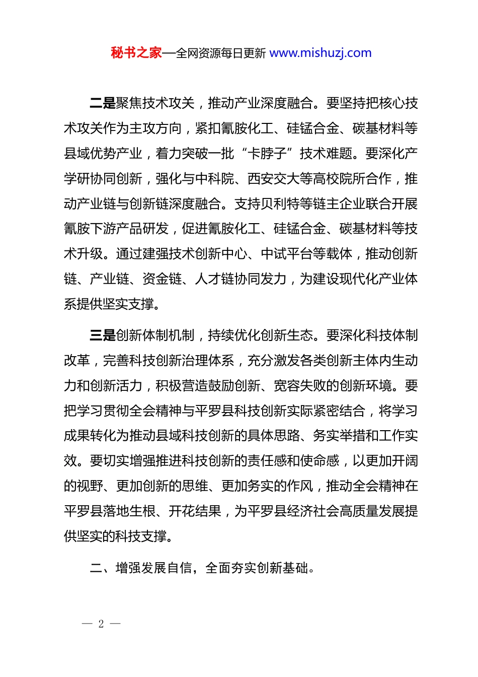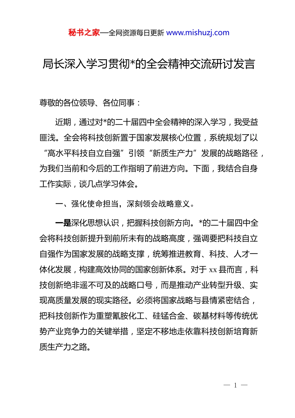 秘书之家—全网资源每日更新 www.mishuzj.com局长深入学习贯彻*的全会精神交流研讨发言尊敬的各位领导、各位同事:近期,通过对*的二十届四中全会精神的深入学习,我受益匪浅。全会将科技创新置于国家发展核心位置,系统规划了以“高水平科技自立自强”引领“新质生产力”发展的战略路径,为我们当前和今后的工作指明了前进方向。下面,我结合自身工作实际,谈几点学习体会。一、强化使命担当,深刻领会战略意义。一是深化思想认识,把握科技创新方向。*的二十届四中全会将科技创新提升到前所未有的战略高度,强调要把科技自立自强作为国家发展的战略支撑,统筹推进教育、科技、人才一体化发展,构建高效协同的国家创新体系。对于 xx 县而言,科技创新绝非遥不可及的战略口号,而是推动产业转型升级、实现高质量发展的现实路径。必须将国家战略与县情紧密结合,把科技创新作为重塑氰胺化工、硅锰合金、碳基材料等传统优势产业竞争力的关键举措,坚定不移地走依靠科技创新培育新质生产力之路。— 1 —秘书之家—全网资源每日更新 www.mishuzj.com二是聚焦技术攻关,推动产业深度融合。要坚持把核心技术攻关作为主攻方向,紧扣氰胺化工、硅锰合金、碳基材料等县域优势产业,着力突破一批“卡脖子”技术难题。要深化产学研协同创新,强化与中科院、西安交大等高校院所合作,推动产业链与创新链深度融合。支持贝利特等链主企业联合开展氰胺下游产品研发,促进氰胺化工、硅锰合金、碳基材料等技术升级。通过建强技术创新中心、中试平台等载体,推动创新链、产业链、资金链、人才链协同发力,为建设现代化产业体系提供坚实支撑。三是创新体制机制,持续优化创新生态。要深化科技体制改革,完善科技创新治理体系,充分激发各类创新主体内生动力和创新活力,积极营造鼓励创新、宽容失败的创新环境。要把学习贯彻全会精神与平罗县科技创新实际紧密结合,将学习成果转化为推动县域科技创新的具体思路、务实举措和工作实效。要切实增强推进科技创新的责任感和使命感,以更加开阔的视野、更加创新的思维、更加务实的作风,推动全会精神在平罗县落地生根、开花结果,为平罗县经济社会高质量发展提供坚实的科技支撑。二、增强发展自信,全面夯实创新基础。— 2 —秘书之家—全网资源每日更新 www.mishuzj.com一是强化研发投入,提升成果转化效能。聚焦新型材料、清洁能源、高端装备等重点产业发展需求,积极争取上级资源,全年获批自治区级科技项目 xx 项,争取项目资金 xx 万元。全县 r&d 经费投入达 xx 亿元,同比增长 xx%,投入强度提升至xx%,较上年提升 xx 个百分点,首次超过全区平均水平,位列全区县区第六名。全县技术合同成交额突 xx 亿元,同比增长 xx%,一批科技成果在农业、畜牧、制种、卫生健康等多个重点领域落地转化,成果转化效率与效益实现显著提升。二是培育创新主体,夯实平台支撑能力。已构建起较为完整的科技企业梯次培育链条,累计培育科技型企业 xx 家、高新技术企业 xx 家,其中瞪羚企业 xx 家、雏鹰企业 xx 家,初步形成结构合理、梯队衔接的企业创新集群。创新平台建设取得新突破,获批“含氟精细化学品中试平台”,累计建成各类研发平台 xx 个,其中:自治区级技术创新中心 xx 个、工程技术研究中心 xx 个,覆盖氰胺化工、硅锰合金、碳基材料等关键产业链,基本形成了覆盖县域重点产业的技术创新支撑体系,为全县产业升级注入持续动能。三是深化产学研用,构建开放协同生态。深化与西安交通大学、中国科学院等高校院所合作,积极探索并实践“候鸟式— 3 —秘书之家—全网资源每日更新 www.mishuzj.com专家”等柔性引才模式,成功引进人才团队 xx 个、高层次人才xx 人,有效推动 xx 项核心技术转化应用。积极为科技企业提供金融支持,已为 xx 家企业落实“宁科贷”,融资额度达 xx 万元;组织开展专业培训 xx 场,覆盖 xx 余人次。持续推荐“xx好成果”等优质科技成果 xx 期,初步构建起多元主体协同、创新要素集聚、成果转化顺畅的开放创新格局。三、聚焦重点任务,精准贯彻全会部署。一是加强顶层设计,系统...