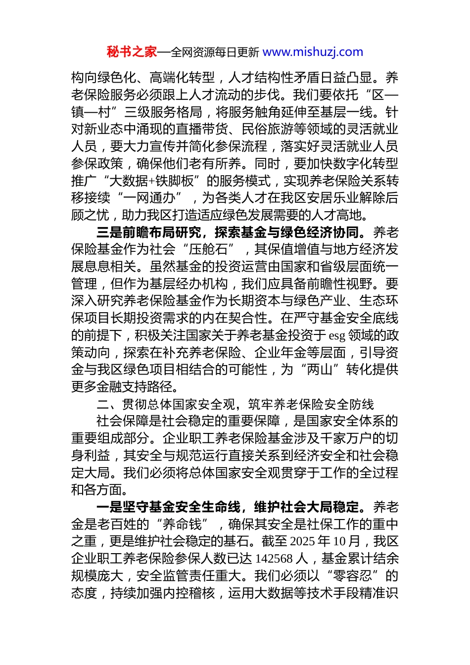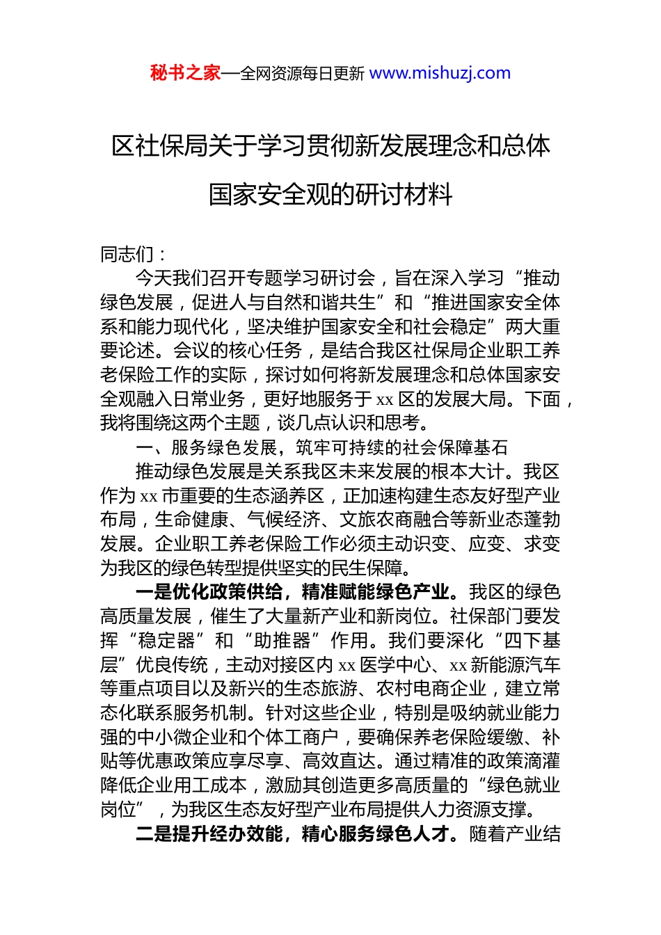 秘书之家—全网资源每日更新 www.mishuzj.com区社保局关于学习贯彻新发展理念和总体国家安全观的研讨材料同志们:今天我们召开专题学习研讨会,旨在深入学习“推动绿色发展,促进人与自然和谐共生”和“推进国家安全体系和能力现代化,坚决维护国家安全和社会稳定”两大重要论述。会议的核心任务,是结合我区社保局企业职工养老保险工作的实际,探讨如何将新发展理念和总体国家安全观融入日常业务,更好地服务于 xx 区的发展大局。下面,我将围绕这两个主题,谈几点认识和思考。一、服务绿色发展,筑牢可持续的社会保障基石推动绿色发展是关系我区未来发展的根本大计。我区作为 xx 市重要的生态涵养区,正加速构建生态友好型产业布局,生命健康、气候经济、文旅农商融合等新业态蓬勃发展。企业职工养老保险工作必须主动识变、应变、求变为我区的绿色转型提供坚实的民生保障。一是优化政策供给,精准赋能绿色产业。我区的绿色高质量发展,催生了大量新产业和新岗位。社保部门要发挥“稳定器”和“助推器”作用。我们要深化“四下基层”优良传统,主动对接区内 xx 医学中心、xx 新能源汽车等重点项目以及新兴的生态旅游、农村电商企业,建立常态化联系服务机制。针对这些企业,特别是吸纳就业能力强的中小微企业和个体工商户,要确保养老保险缓缴、补贴等优惠政策应享尽享、高效直达。通过精准的政策滴灌降低企业用工成本,激励其创造更多高质量的“绿色就业岗位”,为我区生态友好型产业布局提供人力资源支撑。二是提升经办效能,精心服务绿色人才。随着产业结秘书之家—全网资源每日更新 www.mishuzj.com构向绿色化、高端化转型,人才结构性矛盾日益凸显。养老保险服务必须跟上人才流动的步伐。我们要依托“区—镇—村”三级服务格局,将服务触角延伸至基层一线。针对新业态中涌现的直播带货、民俗旅游等领域的灵活就业人员,要大力宣传并简化参保流程,落实好灵活就业人员参保政策,确保他们老有所养。同时,要加快数字化转型推广“大数据+铁脚板”的服务模式,实现养老保险关系转移接续“一网通办”,为各类人才在我区安居乐业解除后顾之忧,助力我区打造适应绿色发展需要的人才高地。三是前瞻布局研究,探索基金与绿色经济协同。养老保险基金作为社会“压舱石”,其保值增值与地方经济发展息息相关。虽然基金的投资运营由国家和省级层面统一管理,但作为基层经办机构,我们应具备前瞻性视野。要深入研究养老保险基金作为长期资本与绿色产业、生态环保项目长期投资需求的内在契合性。在严守基金安全底线的前提下,积极关注国家关于养老基金投资于 esg 领域的政策动向,探索在补充养老保险、企业年金等层面,引导资金与我区绿色项目相结合的可能性,为“两山”转化提供更多金融支持路径。二、贯彻总体国家安全观,筑牢养老保险安全防线社会保障是社会稳定的重要保障,是国家安全体系的重要组成部分。企业职工养老保险基金涉及千家万户的切身利益,其安全与规范运行直接关系到经济安全和社会稳定大局。我们必须将总体国家安全观贯穿于工作的全过程和各方面。一是坚守基金安全生命线,维护社会大局稳定。养老金是老百姓的“养命钱”,确保其安全是社保工作的重中之重,更是维护社会稳定的基石。截至 2025 年 10 月,我区企业职工养老保险参保人数已达 142568 人,基金累计结余规模庞大,安全监管责任重大。我们必须以“零容忍”的态度,持续加强内控稽核,运用大数据等技术手段精准识秘书之家—全网资源每日更新 www.mishuzj.com别和筛查疑点数据,严厉打击虚构劳动关系、伪造证明材料等欺诈骗保行为,守护好人民群众的每一分养老钱。确保养老金按时足额发放到每一位退休人员手中,就是我们对维护社会稳定的最直接贡献。二是深化改革与系统建设,提升体系安全韧性。当前,企业职工基本养老保险全国统筹制度已稳妥实施。我们要不折不扣地落实好这项重大改革,确保我区在全国统筹信息系统中的数据准确、业务协同、运行顺畅。全国统筹增强了养老保险制度的整体抗风险能力,实现了基金在全国范围内的结构性互济,为应对人口老龄化挑战、保障区域间养老金发放提供了坚...