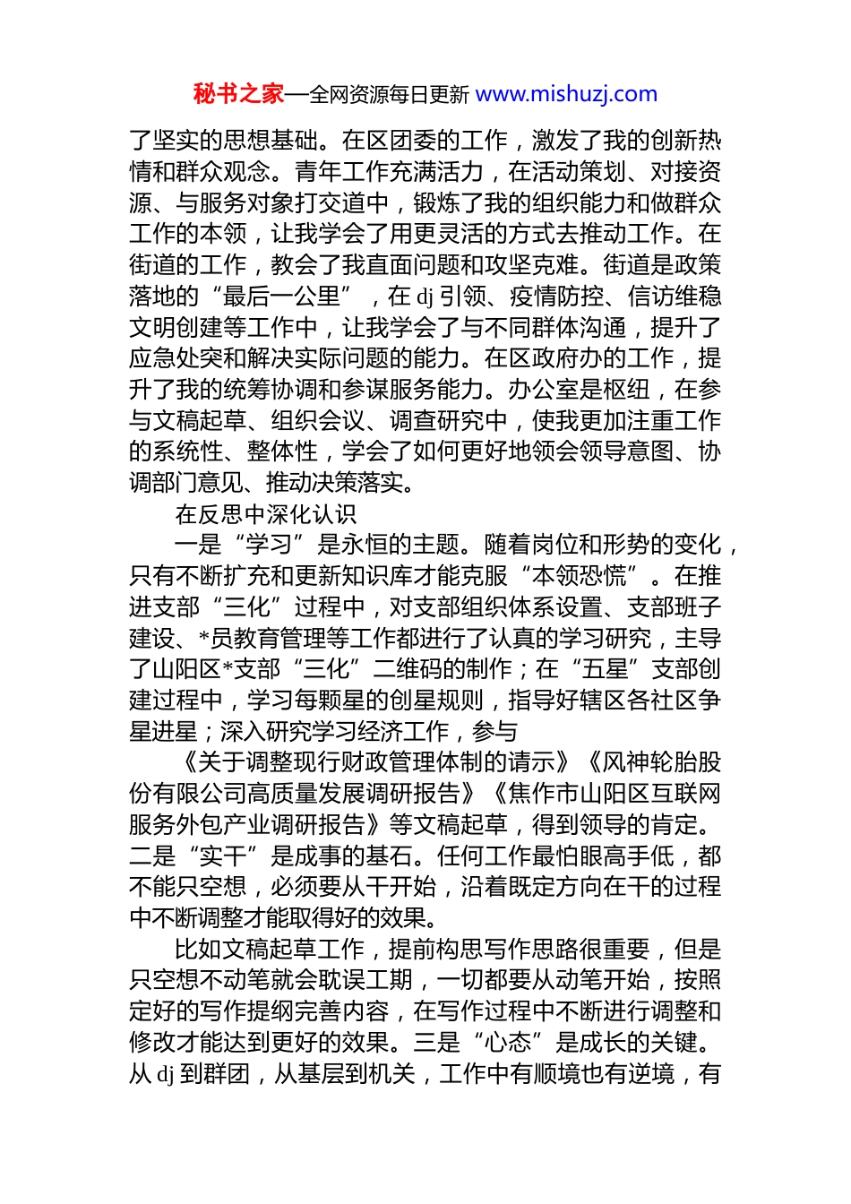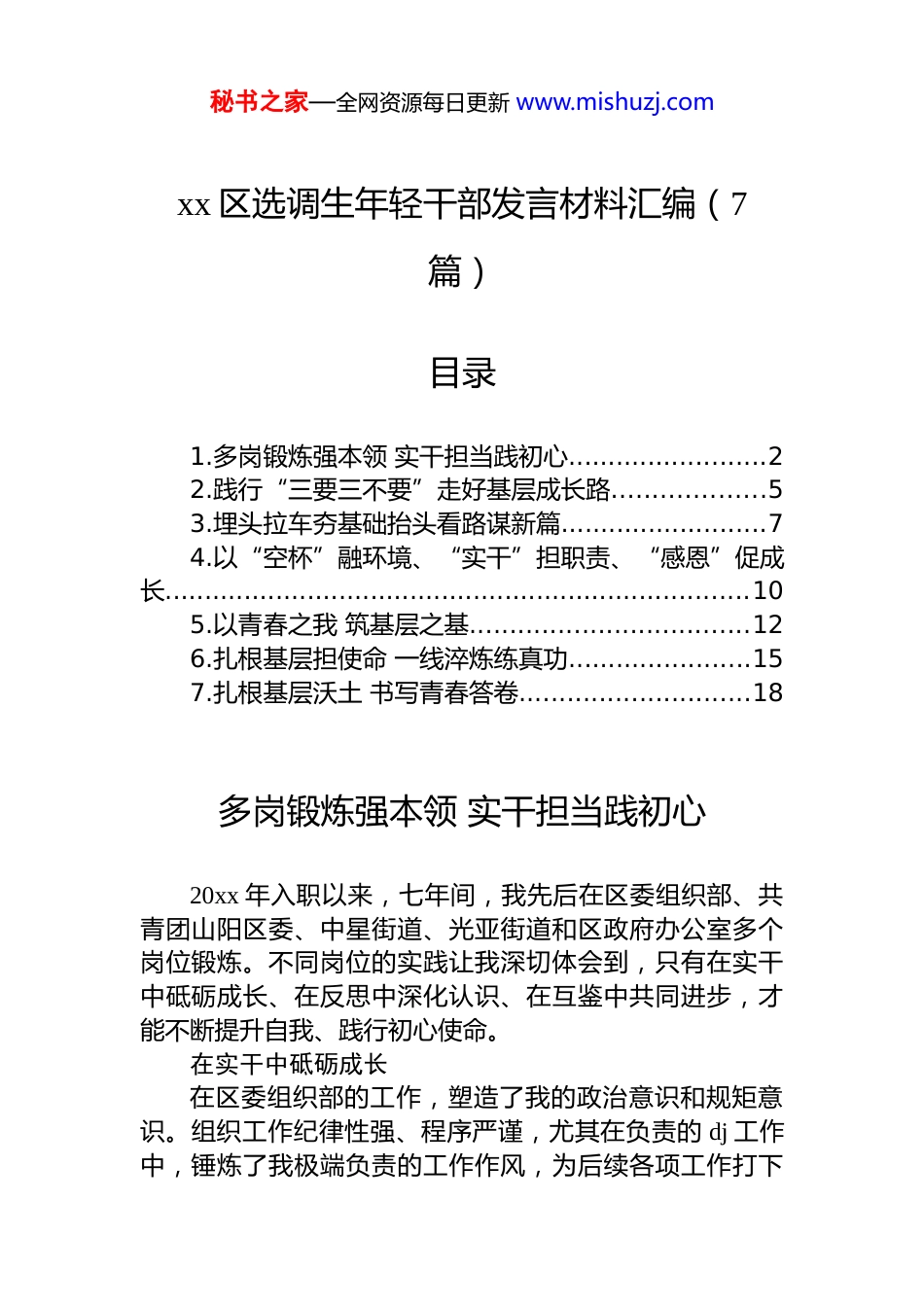 秘书之家—全网资源每日更新 www.mishuzj.comxx 区选调生年轻干部发言材料汇编(7篇)目录1.多岗锻炼强本领 实干担当践初心.........................22.践行“三要三不要”走好基层成长路...................53.埋头拉车夯基础抬头看路谋新篇..........................74.以“空杯”融环境、“实干”担职责、“感恩”促成长..........................................................................105.以青春之我 筑基层之基...................................126.扎根基层担使命 一线淬炼练真功.......................157.扎根基层沃土 书写青春答卷.............................18多岗锻炼强本领 实干担当践初心20xx 年入职以来,七年间,我先后在区委组织部、共青团山阳区委、中星街道、光亚街道和区政府办公室多个岗位锻炼。不同岗位的实践让我深切体会到,只有在实干中砥砺成长、在反思中深化认识、在互鉴中共同进步,才能不断提升自我、践行初心使命。在实干中砥砺成长在区委组织部的工作,塑造了我的政治意识和规矩意识。组织工作纪律性强、程序严谨,尤其在负责的 dj 工作中,锤炼了我极端负责的工作作风,为后续各项工作打下秘书之家—全网资源每日更新 www.mishuzj.com了坚实的思想基础。在区团委的工作,激发了我的创新热情和群众观念。青年工作充满活力,在活动策划、对接资源、与服务对象打交道中,锻炼了我的组织能力和做群众工作的本领,让我学会了用更灵活的方式去推动工作。在街道的工作,教会了我直面问题和攻坚克难。街道是政策落地的“最后一公里”,在 dj 引领、疫情防控、信访维稳文明创建等工作中,让我学会了与不同群体沟通,提升了应急处突和解决实际问题的能力。在区政府办的工作,提升了我的统筹协调和参谋服务能力。办公室是枢纽,在参与文稿起草、组织会议、调查研究中,使我更加注重工作的系统性、整体性,学会了如何更好地领会领导意图、协调部门意见、推动决策落实。在反思中深化认识一是“学习”是永恒的主题。随着岗位和形势的变化,只有不断扩充和更新知识库才能克服“本领恐慌”。在推进支部“三化”过程中,对支部组织体系设置、支部班子建设、*员教育管理等工作都进行了认真的学习研究,主导了山阳区*支部“三化”二维码的制作;在“五星”支部创建过程中,学习每颗星的创星规则,指导好辖区各社区争星进星;深入研究学习经济工作,参与《关于调整现行财政管理体制的请示》《风神轮胎股份有限公司高质量发展调研报告》《焦作市山阳区互联网服务外包产业调研报告》等文稿起草,得到领导的肯定。二是“实干”是成事的基石。任何工作最怕眼高手低,都不能只空想,必须要从干开始,沿着既定方向在干的过程中不断调整才能取得好的效果。比如文稿起草工作,提前构思写作思路很重要,但是只空想不动笔就会耽误工期,一切都要从动笔开始,按照定好的写作提纲完善内容,在写作过程中不断进行调整和修改才能达到更好的效果。三是“心态”是成长的关键。从 dj 到群团,从基层到机关,工作中有顺境也有逆境,有秘书之家—全网资源每日更新 www.mishuzj.com表扬也有批评。重要的是保持积极的心态,胜不骄、败不馁,专注于事、内省于己,才能行稳致远。在互鉴中共同进步一是善总结、多积累。无论是工作还是材料,都要定期梳理、定期总结, 只有脑中有思路、手中有素材,才能在下次工作中更得心应手。二是多走一步、深挖一层。面对工作中领导的要求和群众的诉求,要多往前一步了解情况,多往深一层挖掘实情,不要怕“麻烦”,这些“麻烦”正是成长的“阶梯”。三是守住初心、保持热情。工作难免有“疲惫期”,但请记住我们的初心——为群众办实事、为基层作贡献。组织的肯定和群众满意的笑容是我们继续前行的“不竭动力”。践行“三要三不要”走好基层成长路******勉励年轻干部要“做起而行之的行动者、不做坐而论道的清谈客,要当攻坚克难的奋斗者、不当怕见风雨的泥菩萨,在摸爬滚打中增长才干,在层层历练中积累经验”。对照这份殷切期望,结合基层实践,我有三点深刻体会。一要勇于创新求变,不做因循守旧的“保守派”。初...