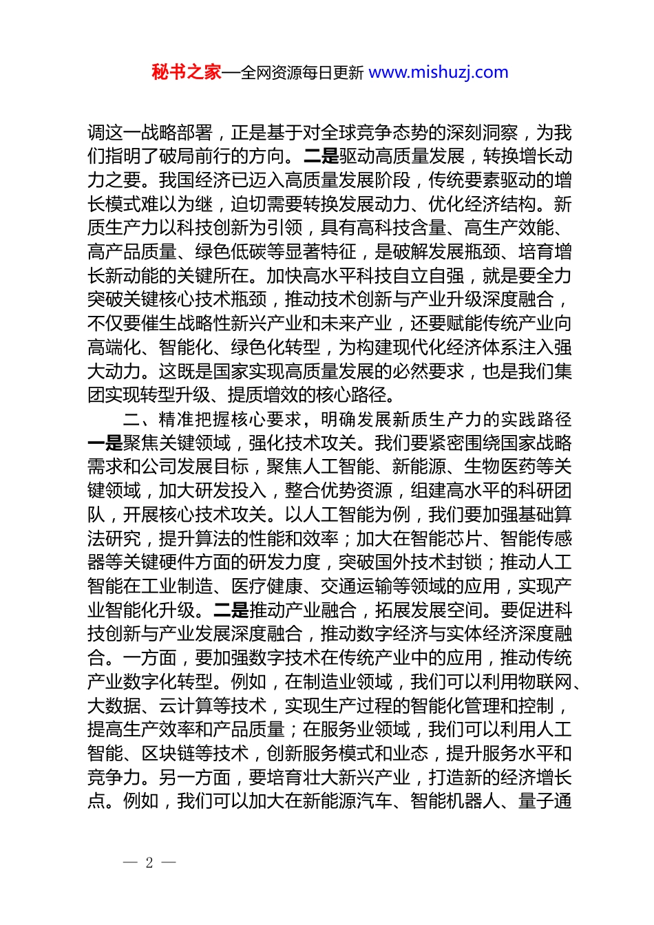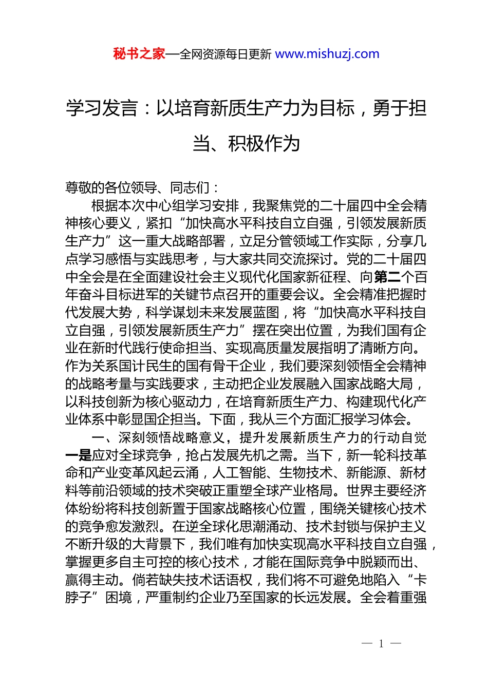 秘书之家—全网资源每日更新 www.mishuzj.com学习发言:以培育新质生产力为目标,勇于担当、积极作为尊敬的各位领导、同志们:根据本次中心组学习安排,我聚焦党的二十届四中全会精神核心要义,紧扣“加快高水平科技自立自强,引领发展新质生产力”这一重大战略部署,立足分管领域工作实际,分享几点学习感悟与实践思考,与大家共同交流探讨。党的二十届四中全会是在全面建设社会主义现代化国家新征程、向第二个百年奋斗目标进军的关键节点召开的重要会议。全会精准把握时代发展大势,科学谋划未来发展蓝图,将“加快高水平科技自立自强,引领发展新质生产力”摆在突出位置,为我们国有企业在新时代践行使命担当、实现高质量发展指明了清晰方向。作为关系国计民生的国有骨干企业,我们要深刻领悟全会精神的战略考量与实践要求,主动把企业发展融入国家战略大局,以科技创新为核心驱动力,在培育新质生产力、构建现代化产业体系中彰显国企担当。下面,我从三个方面汇报学习体会。一、深刻领悟战略意义,提升发展新质生产力的行动自觉一是应对全球竞争,抢占发展先机之需。当下,新一轮科技革命和产业变革风起云涌,人工智能、生物技术、新能源、新材料等前沿领域的技术突破正重塑全球产业格局。世界主要经济体纷纷将科技创新置于国家战略核心位置,围绕关键核心技术的竞争愈发激烈。在逆全球化思潮涌动、技术封锁与保护主义不断升级的大背景下,我们唯有加快实现高水平科技自立自强,掌握更多自主可控的核心技术,才能在国际竞争中脱颖而出、赢得主动。倘若缺失技术话语权,我们将不可避免地陷入“卡脖子”困境,严重制约企业乃至国家的长远发展。全会着重强— 1 —秘书之家—全网资源每日更新 www.mishuzj.com调这一战略部署,正是基于对全球竞争态势的深刻洞察,为我们指明了破局前行的方向。二是驱动高质量发展,转换增长动力之要。我国经济已迈入高质量发展阶段,传统要素驱动的增长模式难以为继,迫切需要转换发展动力、优化经济结构。新质生产力以科技创新为引领,具有高科技含量、高生产效能、高产品质量、绿色低碳等显著特征,是破解发展瓶颈、培育增长新动能的关键所在。加快高水平科技自立自强,就是要全力突破关键核心技术瓶颈,推动技术创新与产业升级深度融合,不仅要催生战略性新兴产业和未来产业,还要赋能传统产业向高端化、智能化、绿色化转型,为构建现代化经济体系注入强大动力。这既是国家实现高质量发展的必然要求,也是我们集团实现转型升级、提质增效的核心路径。二、精准把握核心要求,明确发展新质生产力的实践路径一是聚焦关键领域,强化技术攻关。我们要紧密围绕国家战略需求和公司发展目标,聚焦人工智能、新能源、生物医药等关键领域,加大研发投入,整合优势资源,组建高水平的科研团队,开展核心技术攻关。以人工智能为例,我们要加强基础算法研究,提升算法的性能和效率;加大在智能芯片、智能传感器等关键硬件方面的研发力度,突破国外技术封锁;推动人工智能在工业制造、医疗健康、交通运输等领域的应用,实现产业智能化升级。二是推动产业融合,拓展发展空间。要促进科技创新与产业发展深度融合,推动数字经济与实体经济深度融合。一方面,要加强数字技术在传统产业中的应用,推动传统产业数字化转型。例如,在制造业领域,我们可以利用物联网、大数据、云计算等技术,实现生产过程的智能化管理和控制,提高生产效率和产品质量;在服务业领域,我们可以利用人工智能、区块链等技术,创新服务模式和业态,提升服务水平和竞争力。另一方面,要培育壮大新兴产业,打造新的经济增长点。例如,我们可以加大在新能源汽车、智能机器人、量子通— 2 —秘书之家—全网资源每日更新 www.mishuzj.com信等新兴产业的布局和投入,推动新兴产业快速发展。三是加强人才培养,提供智力支持。人才是科技创新的第一资源。我们要加强人才培养和引进,建立健全人才激励机制,营造良好的人才发展环境。要加强与高校、科研机构的合作,建立产学研合作平台,培养一批具有创新精神和实践能力的高素质人才。要加大对高端人才的引进力度,吸引一批国内外顶尖的科学...
