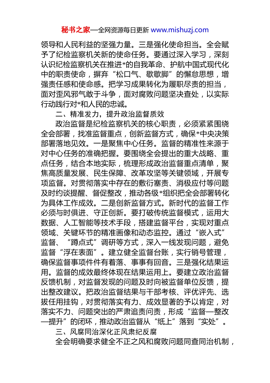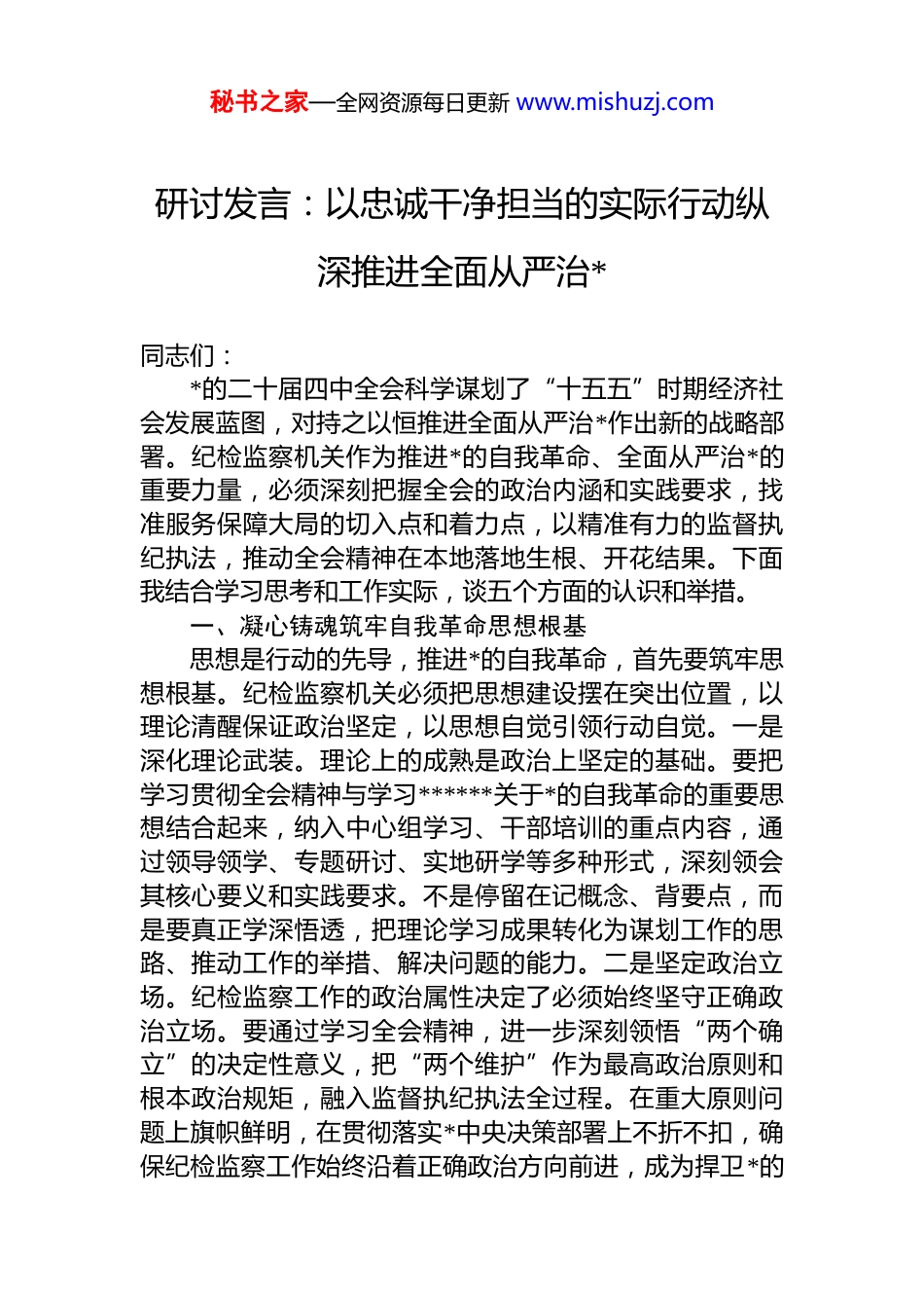 秘书之家—全网资源每日更新 www.mishuzj.com研讨发言:以忠诚干净担当的实际行动纵深推进全面从严治*同志们:*的二十届四中全会科学谋划了“十五五”时期经济社会发展蓝图,对持之以恒推进全面从严治*作出新的战略部署。纪检监察机关作为推进*的自我革命、全面从严治*的重要力量,必须深刻把握全会的政治内涵和实践要求,找准服务保障大局的切入点和着力点,以精准有力的监督执纪执法,推动全会精神在本地落地生根、开花结果。下面我结合学习思考和工作实际,谈五个方面的认识和举措。一、凝心铸魂筑牢自我革命思想根基思想是行动的先导,推进*的自我革命,首先要筑牢思想根基。纪检监察机关必须把思想建设摆在突出位置,以理论清醒保证政治坚定,以思想自觉引领行动自觉。一是深化理论武装。理论上的成熟是政治上坚定的基础。要把学习贯彻全会精神与学习******关于*的自我革命的重要思想结合起来,纳入中心组学习、干部培训的重点内容,通过领导领学、专题研讨、实地研学等多种形式,深刻领会其核心要义和实践要求。不是停留在记概念、背要点,而是要真正学深悟透,把理论学习成果转化为谋划工作的思路、推动工作的举措、解决问题的能力。二是坚定政治立场。纪检监察工作的政治属性决定了必须始终坚守正确政治立场。要通过学习全会精神,进一步深刻领悟“两个确立”的决定性意义,把“两个维护”作为最高政治原则和根本政治规矩,融入监督执纪执法全过程。在重大原则问题上旗帜鲜明,在贯彻落实*中央决策部署上不折不扣,确保纪检监察工作始终沿着正确政治方向前进,成为捍卫*的秘书之家—全网资源每日更新 www.mishuzj.com领导和人民利益的坚强力量。三是强化使命担当。全会赋予了纪检监察机关新的使命任务。要通过深入学习,深刻认识纪检监察机关在推进*的自我革命、护航中国式现代化中的职责使命,摒弃“松口气、歇歇脚”的懈怠思想,增强责任感和使命感。把学习成果转化为履职尽责的担当,面对歪风邪气敢于斗争,面对腐败问题坚决查处,以实际行动践行对*和人民的忠诚。二、精准发力,提升政治监督质效政治监督是纪检监察机关的核心职责,必须紧紧围绕全会部署,找准监督重点,创新监督方式,确保*中央决策部署落地见效。一是聚焦中心任务。监督的精准性来源于对中心任务的准确把握。要围绕全会提出的重大战略、重点任务,结合本地实际,梳理形成政治监督重点清单,聚焦高质量发展、民生保障、改革攻坚等关键领域,开展专项监督。对贯彻落实中存在的敷衍塞责、消极应付等问题及时约谈提醒、督促整改,推动各级*组织把全会部署转化为具体工作成效。二是创新监督方式。新时代的监督工作必须与时俱进、守正创新。要打破传统监督模式,运用大数据、人工智能等技术手段,搭建监督平台,实现对重点领域、关键环节的精准画像和动态监控。通过“嵌入式”监督、“蹲点式”调研等方式,深入一线发现问题,避免监督“浮在表面”。建立健全监督台账,实行销号管理,确保监督事项件件有着落、事事有回音。三是强化结果运用。监督的成效最终体现在结果运用上。要建立政治监督反馈机制,对监督发现的问题及时向被监督单位反馈,提出整改建议。把政治监督结果与干部考核、评优评先、选拔任用挂钩,对贯彻落实有力、成效显著的予以肯定,对落实不力、问题突出的严肃追责问责,形成“监督—整改—提升”的闭环,推动政治监督从“纸上”落到“实处”。三、风腐同治深化正风肃纪反腐全会明确要求健全不正之风和腐败问题同查同治机制,秘书之家—全网资源每日更新 www.mishuzj.com这为我们深化正风肃纪反腐提供了重要遵循。必须坚持风腐一体查、一体治,不断提升治理效能。一是从严纠治“四风”。作风问题关系人心向背,必须持之以恒抓下去要锲而不舍贯彻中央八项规定精神,以钉钉子精神纠治形式主义、官僚主义,严查加重基层负担、漠视群众利益等问题。紧盯节假日等重要节点,严查隐形变异的“四风”问题,对顶风违纪行为从严查处、通报曝光,持续释放越往后执纪越严的强烈信号,推动作风建设常态化长效化。二是深化腐败治理。腐败是*执政的最大风险,必须坚决铲除。聚焦权力集中、资金密集、...
