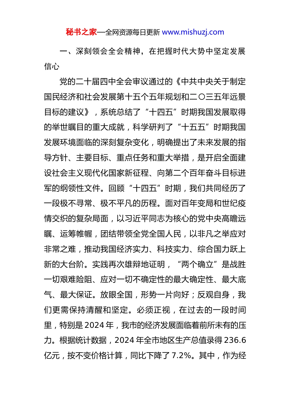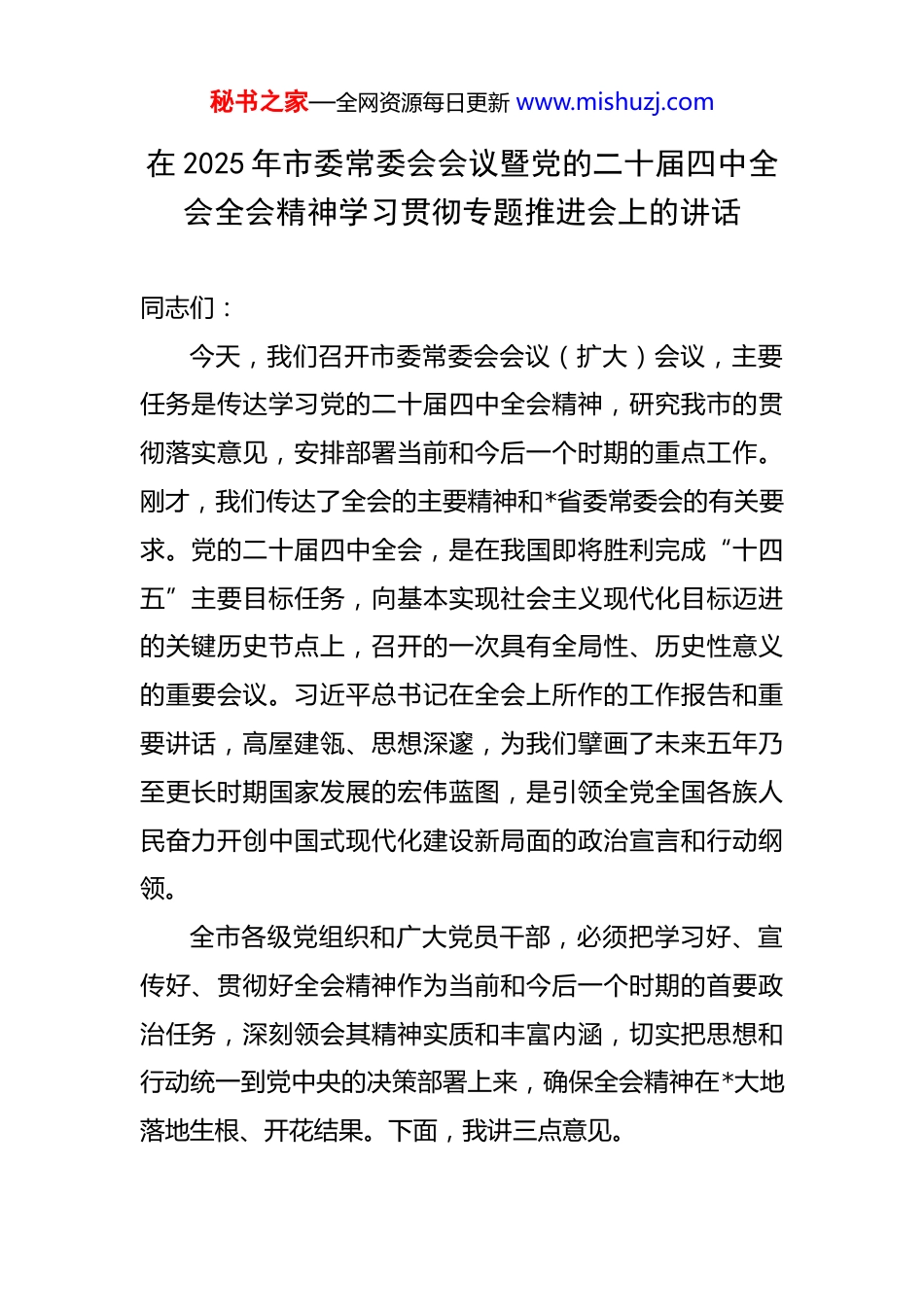 秘书之家—全网资源每日更新 www.mishuzj.com在 2025 年市委常委会会议暨党的二十届四中全会全会精神学习贯彻专题推进会上的讲话 同志们:今天,我们召开市委常委会会议(扩大)会议,主要任务是传达学习党的二十届四中全会精神,研究我市的贯彻落实意见,安排部署当前和今后一个时期的重点工作。刚才,我们传达了全会的主要精神和*省委常委会的有关要求。党的二十届四中全会,是在我国即将胜利完成“十四五”主要目标任务,向基本实现社会主义现代化目标迈进的关键历史节点上,召开的一次具有全局性、历史性意义的重要会议。习近平总书记在全会上所作的工作报告和重要讲话,高屋建瓴、思想深邃,为我们擘画了未来五年乃至更长时期国家发展的宏伟蓝图,是引领全党全国各族人民奋力开创中国式现代化建设新局面的政治宣言和行动纲领。全市各级党组织和广大党员干部,必须把学习好、宣传好、贯彻好全会精神作为当前和今后一个时期的首要政治任务,深刻领会其精神实质和丰富内涵,切实把思想和行动统一到党中央的决策部署上来,确保全会精神在*大地落地生根、开花结果。下面,我讲三点意见。秘书之家—全网资源每日更新 www.mishuzj.com一、深刻领会全会精神,在把握时代大势中坚定发展信心党的二十届四中全会审议通过的《中共中央关于制定国民经济和社会发展第十五个五年规划和二〇三五年远景目标的建议》,系统总结了“十四五”时期我国发展取得的举世瞩目的重大成就,科学研判了“十五五”时期我国发展环境面临的深刻复杂变化,明确提出了未来发展的指导方针、主要目标、重点任务和重大举措,是开启全面建设社会主义现代化国家新征程、向第二个百年奋斗目标进军的纲领性文件。回顾“十四五”时期,我们共同经历了一段极不寻常、极不平凡的历程。面对百年变局和世纪疫情交织的复杂局面,以习近平同志为核心的党中央高瞻远瞩、运筹帷幄,团结带领全党全国人民,以非凡之举应对非常之难,推动我国经济实力、科技实力、综合国力跃上新的大台阶。实践再次雄辩地证明,“两个确立”是战胜一切艰难险阻、应对一切不确定性的最大确定性、最大底气、最大保证。放眼全国,形势一片向好;反观自身,我们更需保持清醒和坚定。必须正视,在过去的一段时间里,特别是 2024 年,我市的经济发展面临着前所未有的压力。根据统计数据,2024 年全市地区生产总值录得 236.6亿元,按不变价格计算,同比下降了 7.2%。其中,作为经秘书之家—全网资源每日更新 www.mishuzj.com济支柱的第二产业增加值下降了 29.7%规上工业利润大幅减少,固定资产投资和财政收入也出现了不同程度的下滑。这些数据是沉甸甸的,是摆在我们面前最现实的课题。它警示我们,传统的发展路径依赖越来越难以为继,产业结构转型的阵痛正在集中显现,推动高质量发展的任务比以往任何时候都更加艰巨和紧迫。然而,挑战与机遇并存。我们既要看到困难,更要看到光明。全会精神的传来,如同思想的灯塔,照亮了我们前行的航程。全会提出的新发展理念、新发展格局以及一系列具有前瞻性、全局性、战略性的举措,为我们破解发展难题、厚植发展优势提供了根本遵循和科学指引。同时,我们也要看到自身发展的韧性和潜力。在 2024 年如此困难的情况下,我市的第一产业增加值依然实现了 2.4%的增长,第三产业增加值增长了 3.4%城乡居民人均可支配收入分别达到了 31595 元和 20119 元,保持了稳定增长。这说明,我市的经济基本盘是稳固的,特别是农业的“压舱石”作用和民生领域的持续改善,为我们应对风险挑战提供了坚实基础。因此,全市上下必须摒弃悲观情绪,提振必胜信心,从全会精神中汲取智慧和力量,辩证看待“危”与“机”,在准确识变、科学应变、主动求变中,奋力开创*高质量发展、可持续振兴的新局面。秘书之家—全网资源每日更新 www.mishuzj.com二、聚焦高质量发展首要任务,在对标对表中谋划*实践新篇章学习贯彻全会精神,关键在于落实。必须紧密结合*市的实际,找准贯彻落实的切入点和着力点,将全会擘画的宏伟蓝图转化为*市“十五五”发展的“施工图”和“实景画”。(一)以动能转换为核心,重塑现代化产业体系...