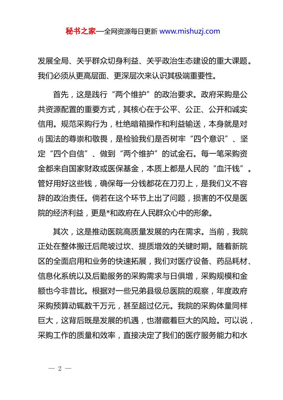 秘书之家—全网资源每日更新 www.mishuzj.com在 2025 年县总医院“规范政府采购与廉政风险防控培训会议”上的讲话同志们:大家下午好!今天,我们在这里隆重召开全院“规范政府采购与廉政风险防控培训会议”,意义非凡,也十分必要。院领导班子成员、各科室负责人、采购相关岗位的同志们以及各分院的代表齐聚一堂,体现了我们对这项工作的高度重视。在此,我代表医院*委,对各位的到来表示欢迎,并对即将为我们授课的省财政厅政府采购咨询专家**老师,表示诚挚的感谢!召开这次会议,主要目的是深入贯彻落实中央、省、市、县关于全面从严治*和加强*风廉政建设的决策部署,进一步规范我院的政府采购行为,提升采购工作的专业化、法治化水平,从源头上预防和遏制腐败问题的发生。这既是一次业务培训会,更是一次思想动员会和廉政警示会。下面,我讲三点意见。一、提高政治站位,深刻认识规范政府采购与廉政风险防控的极端重要性政府采购工作,看似是日常的经济活动,实则是关乎医院— 1 —秘书之家—全网资源每日更新 www.mishuzj.com发展全局、关乎群众切身利益、关乎政治生态建设的重大课题。我们必须从更高层面、更深层次来认识其极端重要性。首先,这是践行“两个维护”的政治要求。政府采购是公共资源配置的重要方式,其核心在于公平、公正、公开和诚实信用。规范采购行为,杜绝暗箱操作和利益输送,本身就是对dj 国法的尊崇和敬畏,是检验我们是否树牢“四个意识”、坚定“四个自信”、做到“两个维护”的试金石。每一笔采购资金都来自国家财政或医保基金,本质上都是人民的“血汗钱”。管好用好这些钱,确保每一分钱都花在刀刃上,是我们义不容辞的政治责任。倘若在这个环节上出了问题,损害的不仅是医院的经济利益,更是*和政府在人民群众心中的形象。其次,这是推动医院高质量发展的内在需求。当前,我院正处在整体搬迁后爬坡过坎、提质增效的关键时期。随着新院区的全面启用和业务的快速拓展,我们对医疗设备、药品耗材、信息化系统以及后勤服务的采购需求与日俱增,采购规模和金额也今非昔比。根据对一些兄弟县级总医院的观察,年度政府采购预算动辄数千万元,甚至超过亿元。我院的采购体量同样巨大,这背后既是发展的机遇,也潜藏着巨大的风险。可以说,采购工作的质量和效率,直接决定了我们的医疗服务能力和水— 2 —秘书之家—全网资源每日更新 www.mishuzj.com平;采购工作的廉洁与否,直接关系到医院的发展环境和声誉。一个科学、规范、高效、廉洁的采购体系,是医院高质量发展的坚强基石和重要保障。我们必须确保采购来的设备是最适用的,药品是最高效的,服务是最优质的,从而为临床一线提供最强有力的支持,为患者提供最安全可靠的医疗保障。最后,这是适应法治建设新形势的必然选择。近年来,国家不断完善政府采购法律法规体系。《政府采购法》的修订工作也在稳步推进,其修订草案征求意见稿明确释放出强化采购人主体责任、推广全流程电子化、支持科技创新、简化采购流程等强烈信号。这意味着对我们采购工作的监管将越来越严、标准将越来越高、程序将越来越规范。我们必须主动适应这种新常态,摒弃过去那些不合规矩的“老办法”“旧习惯”,加快知识更新,主动学习新政策、掌握新要求,确保我们的各项采购活动都在法治的轨道上运行。任何心存侥幸、试图游离于制度之外的行为,都将在日趋严密的法网面前无所遁形。二、正视风险挑战,清醒把握政府采购领域面临的严峻复杂形势在肯定我们工作主流的同时,也必须清醒地看到,医疗卫生领域是腐败问题的高发区,而政府采购环节又是重中之重。*— 3 —秘书之家—全网资源每日更新 www.mishuzj.com中央、中央纪委国家监委以前所未有的决心和力度,持续深化医药领域腐败问题集中整治,释放了“无禁区、全覆盖、零容忍”的强烈信号。从近期**省、**省等地纪委监委通报的一系列典型案例来看,形势不容乐观,教训极其深刻。有的医院院长或分管领导,利用审批权,与供应商内外勾结,在招标项目中“量身定制”参数,为特定企业“开绿灯”,从中收受巨额贿赂;有的设备科、药剂科负责人,利用职务便利,向供应商泄露...