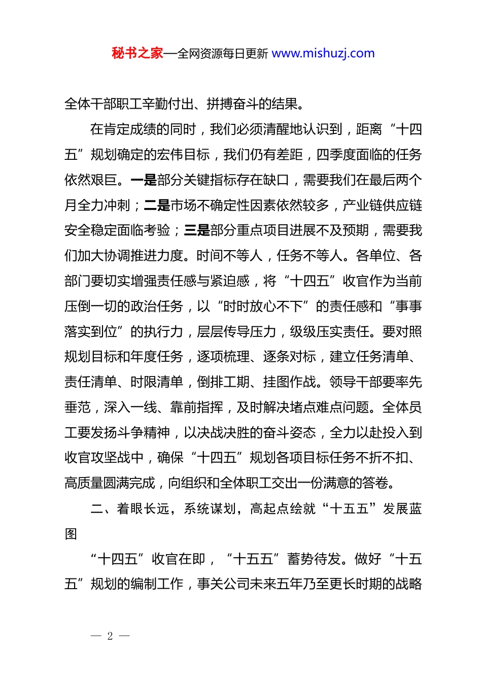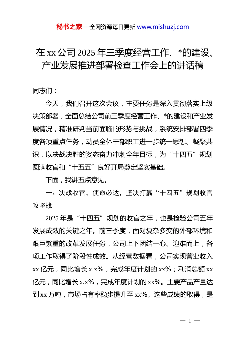 秘书之家—全网资源每日更新 www.mishuzj.com在 xx 公司 2025 年三季度经营工作、*的建设、产业发展推进部署检查工作会上的讲话稿同志们:今天,我们召开这次会议,主要任务是深入贯彻落实上级决策部署,全面总结公司前三季度经营工作、*的建设和产业发展情况,精准研判当前面临的形势与挑战,系统安排部署四季度各项重点任务,动员全体干部职工进一步统一思想、凝聚共识,以决战决胜的姿态奋力冲刺全年目标,为“十四五”规划圆满收官和“十五五”良好开局奠定坚实基础。下面,我讲五点意见。一、决战收官,使命必达,坚决打赢“十四五”规划收官攻坚战2025 年是“十四五”规划的收官之年,也是检验公司五年发展成效的关键之年。前三季度,面对复杂多变的外部环境和艰巨繁重的改革发展任务,公司上下团结一心、迎难而上,各项工作取得了阶段性成效。从经营数据看,公司实现营业收入xx 亿元,同比增长 x.x%,完成年度计划的 xx%;利润总额 xx亿元,同比增长 x.x%,完成年度计划的 xx%。主要产品产量达到 xx 万吨,市场占有率稳步提升至 xx%。这些成绩的取得,是— 1 —秘书之家—全网资源每日更新 www.mishuzj.com全体干部职工辛勤付出、拼搏奋斗的结果。在肯定成绩的同时,我们必须清醒地认识到,距离“十四五”规划确定的宏伟目标,我们仍有差距,四季度面临的任务依然艰巨。一是部分关键指标存在缺口,需要我们在最后两个月全力冲刺;二是市场不确定性因素依然较多,产业链供应链安全稳定面临考验;三是部分重点项目进展不及预期,需要我们加大协调推进力度。时间不等人,任务不等人。各单位、各部门要切实增强责任感与紧迫感,将“十四五”收官作为当前压倒一切的政治任务,以“时时放心不下”的责任感和“事事落实到位”的执行力,层层传导压力,级级压实责任。要对照规划目标和年度任务,逐项梳理、逐条对标,建立任务清单、责任清单、时限清单,倒排工期、挂图作战。领导干部要率先垂范,深入一线、靠前指挥,及时解决堵点难点问题。全体员工要发扬斗争精神,以决战决胜的奋斗姿态,全力以赴投入到收官攻坚战中,确保“十四五”规划各项目标任务不折不扣、高质量圆满完成,向组织和全体职工交出一份满意的答卷。二、着眼长远,系统谋划,高起点绘就“十五五”发展蓝图“十四五”收官在即,“十五五”蓄势待发。做好“十五五”规划的编制工作,事关公司未来五年乃至更长时期的战略— 2 —秘书之家—全网资源每日更新 www.mishuzj.com方向和发展全局,意义重大,影响深远。我们必须立足当前、着眼长远,以高度的战略眼光和系统思维,科学谋划、精心布局。谋划“十五五”发展,首先要深刻理解和把握国家宏观政策导向与产业发展趋势。要深入研究国家关于构建现代化产业体系、发展新质生产力、推进新型工业化等重大战略部署,找准公司在国家发展大局中的定位和切入点。其次,要全面总结“十四五”期间的经验与教训。这五年,我们在哪些方面取得了突破,形成了哪些核心优势?又在哪些方面存在短板,遇到了哪些瓶颈?这些都需要进行系统复盘,为“十五五”规划提供宝贵借鉴。再次,要立足公司产业基础和专业能力。我们的核心业务是什么?我们的比较优势在哪里?未来,我们要聚焦主责主业,持续深耕 xx、xx 等核心业务领域,巩固提升行业领先地位。同时,要前瞻布局未来业务场景,密切关注人工智能、绿色低碳、生物制造等前沿技术领域,探索培育新的增长点,形成“巩固现有、发展新兴、布局未来”的梯次发展格局。规划编制工作是一项系统工程,必须坚持开门问策、集思广益。公司领导班子要带头开展专题调研,各单位要组织高质量研讨,鼓励广大干部职工建言献策。要通过广泛的研讨和思想的碰撞,进一步统一思想、凝聚共识,确保规划目标既鼓舞— 3 —秘书之家—全网资源每日更新 www.mishuzj.com人心、又切实可行,实施路径既清晰明确、又重点突出。要科学制定发展指标体系,统筹考虑规模、速度、质量、效益、安全等多维度要求,确保规划的科学性、前瞻性和可操作性,真正成为引领公司未来五年高质量发展的行动纲领。三、改革创新,提质增效,全力推动经营质量...