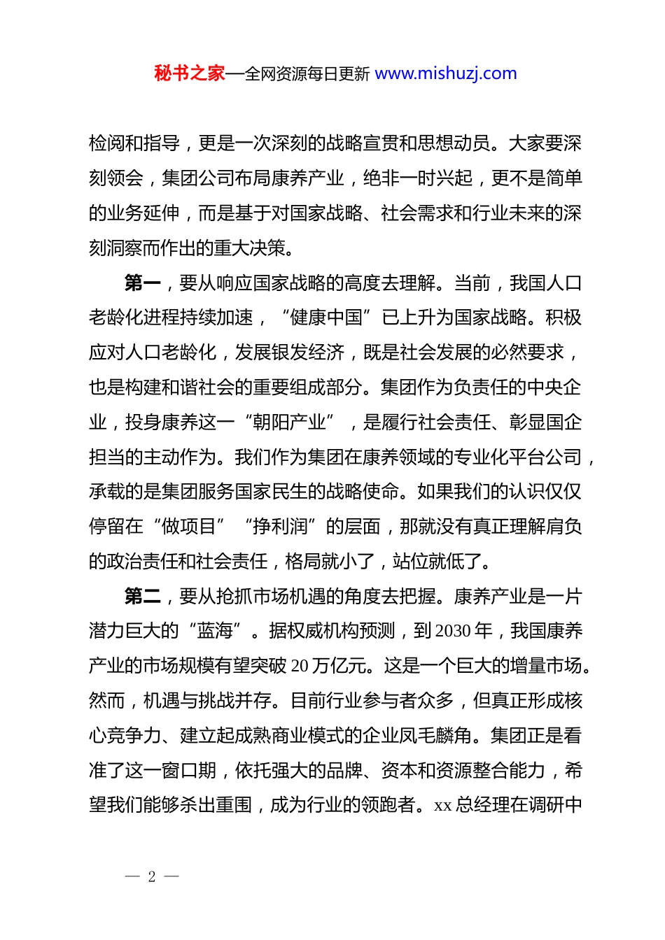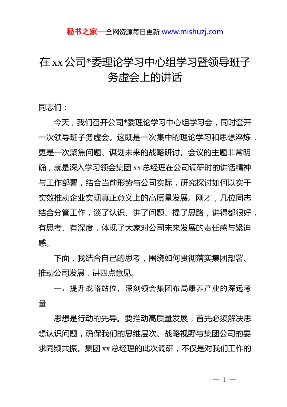 秘书之家—全网资源每日更新 www.mishuzj.com在 xx 公司*委理论学习中心组学习暨领导班子务虚会上的讲话同志们:今天,我们召开公司*委理论学习中心组学习会,同时套开一次领导班子务虚会。这既是一次集中的理论学习和思想淬炼,更是一次聚焦问题、谋划未来的战略研讨。会议的主题非常明确,就是深入学习领会集团 xx 总经理在公司调研时的讲话精神与工作部署,结合当前形势与公司实际,研究探讨如何以实干实效推动企业实现真正意义上的高质量发展。刚才,几位同志结合分管工作,谈了认识、讲了问题、提了思路,讲得都很好,有思考、有深度,体现了大家对公司未来发展的责任感与紧迫感。下面,我结合自己的思考,围绕如何贯彻落实集团部署、推动公司发展,讲四点意见。一、提升战略站位,深刻领会集团布局康养产业的深远考量思想是行动的先导。要推动高质量发展,首先必须解决思想认识问题,确保我们的思维层次、战略视野与集团公司的要求同频共振。集团 xx 总经理的此次调研,不仅是对我们工作的— 1 —秘书之家—全网资源每日更新 www.mishuzj.com检阅和指导,更是一次深刻的战略宣贯和思想动员。大家要深刻领会,集团公司布局康养产业,绝非一时兴起,更不是简单的业务延伸,而是基于对国家战略、社会需求和行业未来的深刻洞察而作出的重大决策。第一,要从响应国家战略的高度去理解。当前,我国人口老龄化进程持续加速,“健康中国”已上升为国家战略。积极应对人口老龄化,发展银发经济,既是社会发展的必然要求,也是构建和谐社会的重要组成部分。集团作为负责任的中央企业,投身康养这一“朝阳产业”,是履行社会责任、彰显国企担当的主动作为。我们作为集团在康养领域的专业化平台公司,承载的是集团服务国家民生的战略使命。如果我们的认识仅仅停留在“做项目”“挣利润”的层面,那就没有真正理解肩负的政治责任和社会责任,格局就小了,站位就低了。第二,要从抢抓市场机遇的角度去把握。康养产业是一片潜力巨大的“蓝海”。据权威机构预测,到 2030 年,我国康养产业的市场规模有望突破 20 万亿元。这是一个巨大的增量市场。然而,机遇与挑战并存。目前行业参与者众多,但真正形成核心竞争力、建立起成熟商业模式的企业凤毛麟角。集团正是看准了这一窗口期,依托强大的品牌、资本和资源整合能力,希望我们能够杀出重围,成为行业的领跑者。xx 总经理在调研中— 2 —秘书之家—全网资源每日更新 www.mishuzj.com提出的各项要求,实际上就是为我们指明了主攻方向和突围路径。我们必须牢牢抓住这个战略机遇期,把集团的信任和支持,转化为开拓市场、创造价值的实际行动。第三,要从推动自身转型的维度去审视。康养产业具有投资周期长、运营要求高、服务属性强的特点,这与我们所熟悉的传统基建业务逻辑有本质区别。集团之所以选择我们来承担这项任务,既是信任,也是考验。这是在倒逼我们跳出舒适区,从思维模式、管理方式到能力结构进行一次彻底的自我革命。xx 总经理调研时指出的问题,很多都触及了我们从“建造商”向“运营商+服务商”转型过程中的痛点和难点。我们必须正视这些问题,把解决问题的过程,当作推动公司转型升级、实现高质量发展的过程,真正锻造出适应新赛道的核心能力。因此,公司各级领导干部,特别是班子成员,必须把思想和行动迅速统一到集团的决策部署上来。二、聚焦主责主业,以体系化思维破解高质量发展难题领会了战略意图,接下来就是如何“干”的问题。高质量发展不是一句口号,它需要实实在在的业绩来支撑,需要一个个具体的项目来落地。xx 总经理在调研中为我们点出了问题、开出了“药方”。我们要做的,就是对照这些要求,逐条梳理、逐项分解,制定出详细的“施工图”,以体系化的作战方式,— 3 —秘书之家—全网资源每日更新 www.mishuzj.com打好这场攻坚战。首先,回顾成绩与不足,保持清醒认知。公司成立以来,我们背靠集团这棵大树,在市场开拓、资产布局上取得了一定进展。集团在康养板块的投资已初具规模,运营资产规模累计超过数百亿元。我们先后中标了 xx 市健康养老项目,并在 xx地区、xx 地区等地成功...