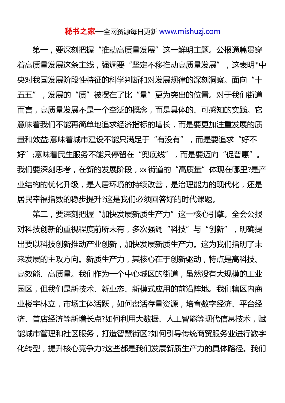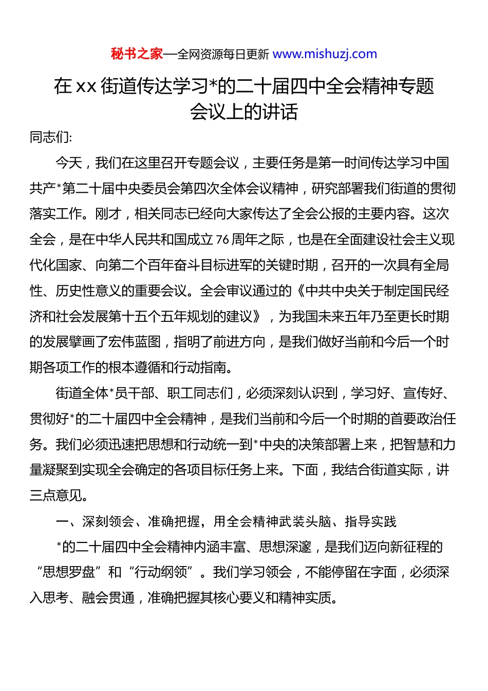 秘书之家—全网资源每日更新 www.mishuzj.com在 xx 街道传达学习*的二十届四中全会精神专题会议上的讲话同志们:今天,我们在这里召开专题会议,主要任务是第一时间传达学习中国共产*第二十届中央委员会第四次全体会议精神,研究部署我们街道的贯彻落实工作。刚才,相关同志已经向大家传达了全会公报的主要内容。这次全会,是在中华人民共和国成立 76 周年之际,也是在全面建设社会主义现代化国家、向第二个百年奋斗目标进军的关键时期,召开的一次具有全局性、历史性意义的重要会议。全会审议通过的《中共中央关于制定国民经济和社会发展第十五个五年规划的建议》,为我国未来五年乃至更长时期的发展擘画了宏伟蓝图,指明了前进方向,是我们做好当前和今后一个时期各项工作的根本遵循和行动指南。街道全体*员干部、职工同志们,必须深刻认识到,学习好、宣传好、贯彻好*的二十届四中全会精神,是我们当前和今后一个时期的首要政治任务。我们必须迅速把思想和行动统一到*中央的决策部署上来,把智慧和力量凝聚到实现全会确定的各项目标任务上来。下面,我结合街道实际,讲三点意见。一、深刻领会、准确把握,用全会精神武装头脑、指导实践*的二十届四中全会精神内涵丰富、思想深邃,是我们迈向新征程的“思想罗盘”和“行动纲领”。我们学习领会,不能停留在字面,必须深入思考、融会贯通,准确把握其核心要义和精神实质。秘书之家—全网资源每日更新 www.mishuzj.com第一,要深刻把握“推动高质量发展”这一鲜明主题。公报通篇贯穿着高质量发展这条主线,强调要“坚定不移推动高质量发展”,这表明*中央对我国发展阶段性特征的科学判断和对发展规律的深刻洞察。面向“十五五”,发展的“质”被摆在了比“量”更为突出的位置。对于我们街道而言,高质量发展不是一个空泛的概念,而是具体的、可感知的实践。它意味着我们不能再简单地追求经济指标的增长,而是要更加注重发展的质量和效益;意味着城市建设不能只满足于“有没有”,而是要追求“好不好”;意味着民生服务不能只停留在“兜底线”,而是要迈向“促普惠”。我们要深刻思考,在新的发展阶段,xx 街道的“高质量”体现在哪里?是产业结构的优化升级,是人居环境的持续改善,是治理能力的现代化,还是居民幸福指数的稳步提升?这是我们必须回答好的时代课题。第二,要深刻把握“加快发展新质生产力”这一核心引擎。全会公报对科技创新的重视程度前所未有,多次强调“科技”与“创新”,明确提出要以科技创新推动产业创新,加快发展新质生产力。这为我们指明了未来发展的主攻方向。新质生产力,其核心在于创新驱动,特点是高科技、高效能、高质量。我们作为一个中心城区的街道,虽然没有大规模的工业园区,但我们是新技术、新业态、新模式应用的前沿阵地。我们辖区内商业楼宇林立,市场主体活跃,如何盘活存量资源,培育数字经济、平台经济、首店经济等新增长点?如何利用大数据、人工智能等现代信息技术,赋能城市管理和社区服务,打造智慧街区?如何引导传统商贸服务业进行数字化转型,提升核心竞争力?这些都是我们发展新质生产力的具体路径。我们秘书之家—全网资源每日更新 www.mishuzj.com必须破除“街道抓不了大产业”的思维定势,在“微创新”“微改造”中寻找突破口,为区域经济发展注入新动能。第三,要深刻把握“坚持以人民为中心”这一根本立场。全会强调,要“在高质量发展中增进民生福祉”,并将“扩大内需”和“保障和改善民生”紧密结合,充分体现了我们*“江山就是人民,人民就是江山”的执政理念。发展的最终目的是为了人民幸福。过去几年,我们街道在老旧小区改造、公共设施完善、困难群体帮扶等方面做了大量工作,取得了一定成效。但我们必须清醒地看到,与人民群众对美好生活的新期待相比,我们的工作还有不少差距。比如,普惠性养老托育服务供给是否充足?“15 分钟社区生活圈”的功能是否完备?群众反映强烈的物业管理、停车难、环境卫生等问题是否得到根本性解决?全会精神为我们指明了方向,就是要坚持问题导向,把群众的“表情包”作为我们工作的“风向标”,把群众的“需求单”变成我们的“任务书”...