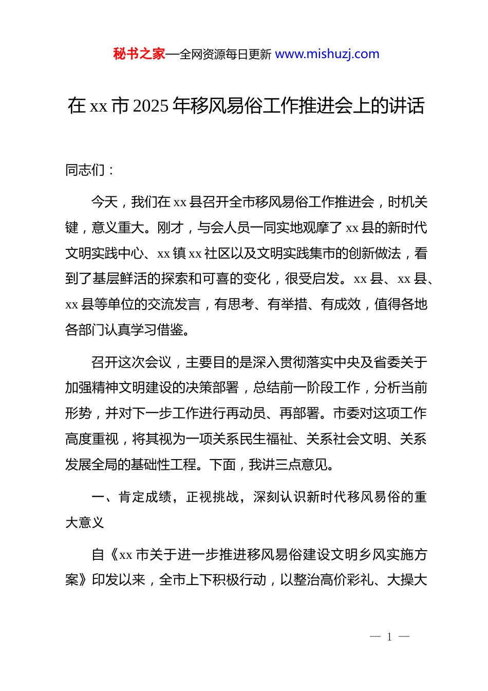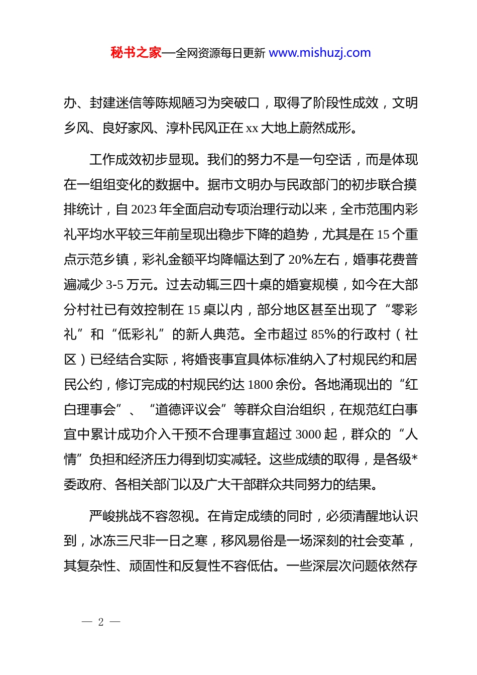 秘书之家—全网资源每日更新 www.mishuzj.com在 xx 市 2025 年移风易俗工作推进会上的讲话同志们:今天,我们在 xx 县召开全市移风易俗工作推进会,时机关键,意义重大。刚才,与会人员一同实地观摩了 xx 县的新时代文明实践中心、xx 镇 xx 社区以及文明实践集市的创新做法,看到了基层鲜活的探索和可喜的变化,很受启发。xx 县、xx 县、xx 县等单位的交流发言,有思考、有举措、有成效,值得各地各部门认真学习借鉴。召开这次会议,主要目的是深入贯彻落实中央及省委关于加强精神文明建设的决策部署,总结前一阶段工作,分析当前形势,并对下一步工作进行再动员、再部署。市委对这项工作高度重视,将其视为一项关系民生福祉、关系社会文明、关系发展全局的基础性工程。下面,我讲三点意见。一、肯定成绩,正视挑战,深刻认识新时代移风易俗的重大意义自《xx 市关于进一步推进移风易俗建设文明乡风实施方案》印发以来,全市上下积极行动,以整治高价彩礼、大操大— 1 —秘书之家—全网资源每日更新 www.mishuzj.com办、封建迷信等陈规陋习为突破口,取得了阶段性成效,文明乡风、良好家风、淳朴民风正在 xx 大地上蔚然成形。工作成效初步显现。我们的努力不是一句空话,而是体现在一组组变化的数据中。据市文明办与民政部门的初步联合摸排统计,自 2023 年全面启动专项治理行动以来,全市范围内彩礼平均水平较三年前呈现出稳步下降的趋势,尤其是在 15 个重点示范乡镇,彩礼金额平均降幅达到了 20%左右,婚事花费普遍减少 3-5 万元。过去动辄三四十桌的婚宴规模,如今在大部分村社已有效控制在 15 桌以内,部分地区甚至出现了“零彩礼”和“低彩礼”的新人典范。全市超过 85%的行政村(社区)已经结合实际,将婚丧事宜具体标准纳入了村规民约和居民公约,修订完成的村规民约达 1800 余份。各地涌现出的“红白理事会”、“道德评议会”等群众自治组织,在规范红白事宜中累计成功介入干预不合理事宜超过 3000 起,群众的“人情”负担和经济压力得到切实减轻。这些成绩的取得,是各级*委政府、各相关部门以及广大干部群众共同努力的结果。严峻挑战不容忽视。在肯定成绩的同时,必须清醒地认识到,冰冻三尺非一日之寒,移风易俗是一场深刻的社会变革,其复杂性、顽固性和反复性不容低估。一些深层次问题依然存— 2 —秘书之家—全网资源每日更新 www.mishuzj.com在。一是高价彩礼问题根深蒂固。在部分地区,受“面子”文化、性别结构失衡等因素影响,彩礼价格依然在高位徘徊,甚至出现“明降暗升”的变异现象,成为许多家庭“不能承受之重”,是群众反映最强烈、治理难度最大的问题之一。二是攀比浪费之风屡禁不止。婚丧嫁娶中的讲排场、比阔气现象时有反弹,宴席规模、车辆配置、随礼金额等仍在暗中较劲,不仅造成巨大浪费,更败坏了社会风气。三是封建迷信思想依然有市场。“厚葬薄养”的观念在一些地方仍有影响,丧事大操大办、修建豪华墓地等现象尚未根除,占用了宝贵的土地资源,与现代文明理念格格不入。四是长效机制尚不健全。一些地方的工作存在“运动式”倾向,检查时紧、过后则松,制度的刚性约束力不足,群众的内生动力和行动自觉尚未完全形成。重大意义必须深化认识。推进移风易俗,绝非一时一地的权宜之计,而是事关长远的战略任务。这是实现乡村全面振兴的必然要求。乡村振兴,既要塑形,也要铸魂。如果乡村的“面子”上去了,但“里子”还是陈规陋习盛行,那乡村振兴就是不全面、不可持续的。只有革除陋习、涵养新风,才能为乡村振兴注入强大的精神动力,让广大农民群众既富“口袋”,也富“脑袋”。这是满足人民群众美好生活向往的迫切需要。— 3 —秘书之家—全网资源每日更新 www.mishuzj.com“一场婚礼掏空家底”、“一份人情不堪重负”,这些都是群众的痛点、难点。推进移风易俗,就是要直面群众关切,帮助他们从沉重的人情债、面子观中解脱出来,把更多的精力、财力投入到发展生产、改善生活、孝亲敬老上来,提升群众的获得感和幸福感。这是加强和创新基层社会治理的有效途径。移风易俗的过程,本身就是重塑乡村社会规...