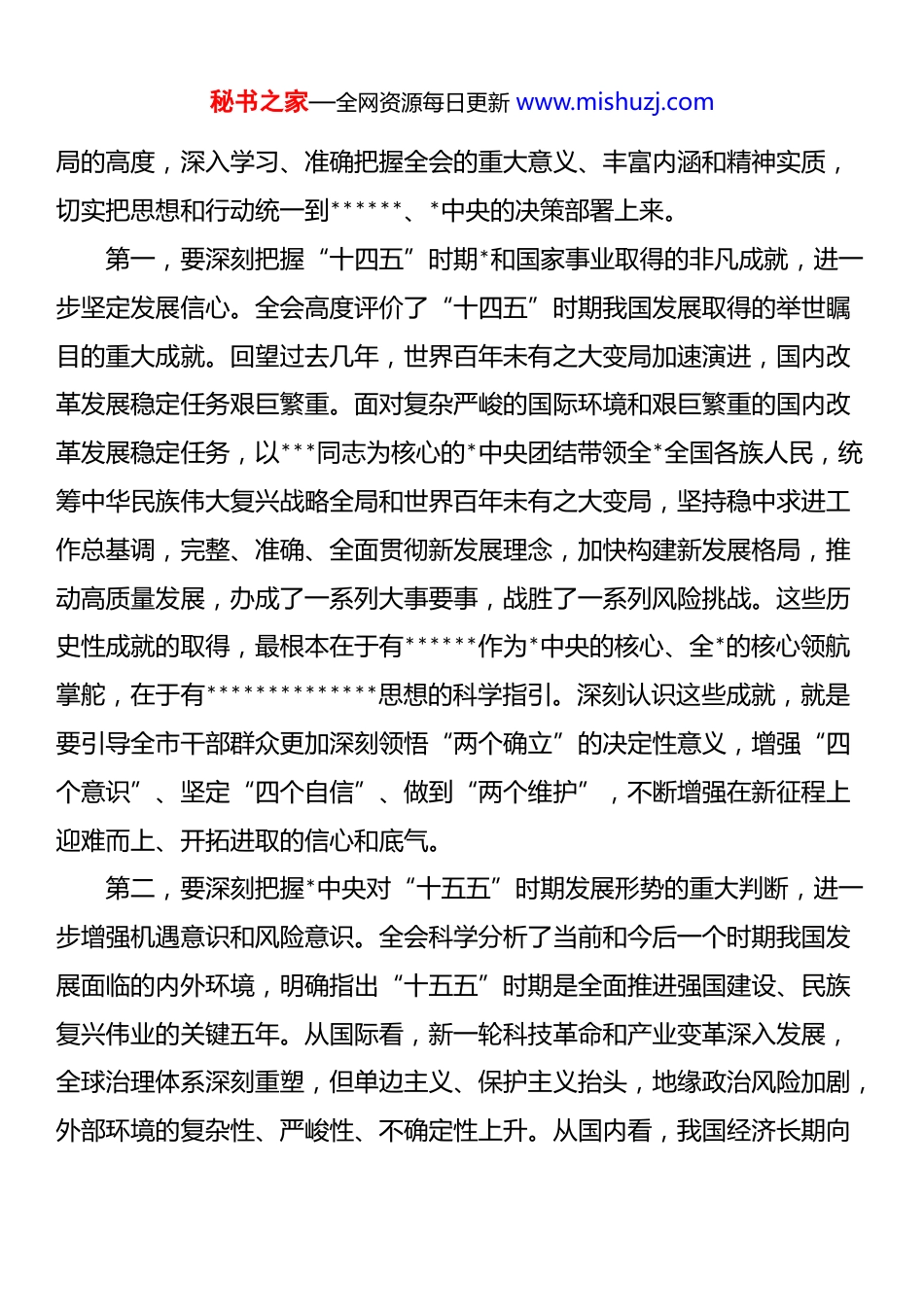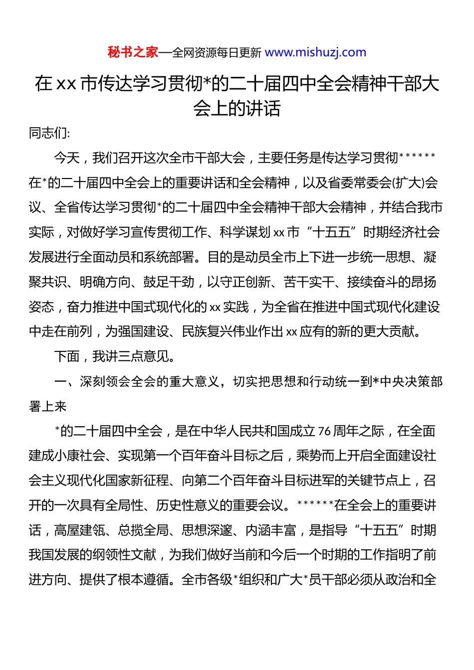 秘书之家—全网资源每日更新 www.mishuzj.com在 xx 市传达学习贯彻*的二十届四中全会精神干部大会上的讲话同志们:今天,我们召开这次全市干部大会,主要任务是传达学习贯彻******在*的二十届四中全会上的重要讲话和全会精神,以及省委常委会(扩大)会议、全省传达学习贯彻*的二十届四中全会精神干部大会精神,并结合我市实际,对做好学习宣传贯彻工作、科学谋划 xx 市“十五五”时期经济社会发展进行全面动员和系统部署。目的是动员全市上下进一步统一思想、凝聚共识、明确方向、鼓足干劲,以守正创新、苦干实干、接续奋斗的昂扬姿态,奋力推进中国式现代化的 xx 实践,为全省在推进中国式现代化建设中走在前列,为强国建设、民族复兴伟业作出 xx 应有的新的更大贡献。下面,我讲三点意见。一、深刻领会全会的重大意义,切实把思想和行动统一到*中央决策部署上来*的二十届四中全会,是在中华人民共和国成立 76 周年之际,在全面建成小康社会、实现第一个百年奋斗目标之后,乘势而上开启全面建设社会主义现代化国家新征程、向第二个百年奋斗目标进军的关键节点上,召开的一次具有全局性、历史性意义的重要会议。******在全会上的重要讲话,高屋建瓴、总揽全局、思想深邃、内涵丰富,是指导“十五五”时期我国发展的纲领性文献,为我们做好当前和今后一个时期的工作指明了前进方向、提供了根本遵循。全市各级*组织和广大*员干部必须从政治和全秘书之家—全网资源每日更新 www.mishuzj.com局的高度,深入学习、准确把握全会的重大意义、丰富内涵和精神实质,切实把思想和行动统一到******、*中央的决策部署上来。第一,要深刻把握“十四五”时期*和国家事业取得的非凡成就,进一步坚定发展信心。全会高度评价了“十四五”时期我国发展取得的举世瞩目的重大成就。回望过去几年,世界百年未有之大变局加速演进,国内改革发展稳定任务艰巨繁重。面对复杂严峻的国际环境和艰巨繁重的国内改革发展稳定任务,以***同志为核心的*中央团结带领全*全国各族人民,统筹中华民族伟大复兴战略全局和世界百年未有之大变局,坚持稳中求进工作总基调,完整、准确、全面贯彻新发展理念,加快构建新发展格局,推动高质量发展,办成了一系列大事要事,战胜了一系列风险挑战。这些历史性成就的取得,最根本在于有******作为*中央的核心、全*的核心领航掌舵,在于有**************思想的科学指引。深刻认识这些成就,就是要引导全市干部群众更加深刻领悟“两个确立”的决定性意义,增强“四个意识”、坚定“四个自信”、做到“两个维护”,不断增强在新征程上迎难而上、开拓进取的信心和底气。第二,要深刻把握*中央对“十五五”时期发展形势的重大判断,进一步增强机遇意识和风险意识。全会科学分析了当前和今后一个时期我国发展面临的内外环境,明确指出“十五五”时期是全面推进强国建设、民族复兴伟业的关键五年。从国际看,新一轮科技革命和产业变革深入发展,全球治理体系深刻重塑,但单边主义、保护主义抬头,地缘政治风险加剧,外部环境的复杂性、严峻性、不确定性上升。从国内看,我国经济长期向秘书之家—全网资源每日更新 www.mishuzj.com好的基本面没有改变,制度优势显著、市场空间广阔、产业体系完备、人力资源丰富,但也面临有效需求不足、部分行业产能过剩、社会预期偏弱、风险隐患仍然较多等挑战。准确把握这些重大判断,要求我们必须坚持底线思维和极限思维,既要看到有利条件、抢抓发展机遇,也要正视困难挑战、有效防范化解风险,牢牢把握发展主动权,在危机中育先机、于变局中开新局。第三,要深刻把握“十五五”时期经济社会发展的宏伟蓝图,进一步明确奋斗方向。全会系统擘画了“十五五”时期经济社会发展的指导方针、基本原则、主要目标和战略安排。全会提出的指导方针,强调了坚持和加强*的全面领导、坚持以人民为中心、坚持新发展理念等一系列根本要求。全会确定的发展目标,聚焦经济高质量发展、改革开放迈出新步伐、社会文明程度得到新提高、生态文明建设取得新进步、民生福祉达到新水平、国家治理效能得到新提升等关键领域,体现了发展质量、结构、规模、速度、效...