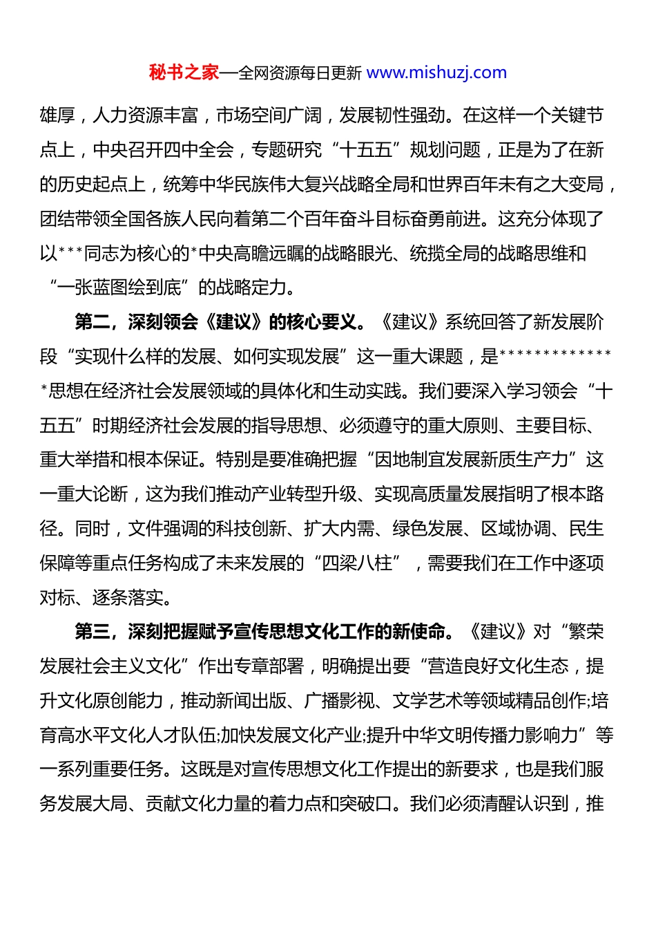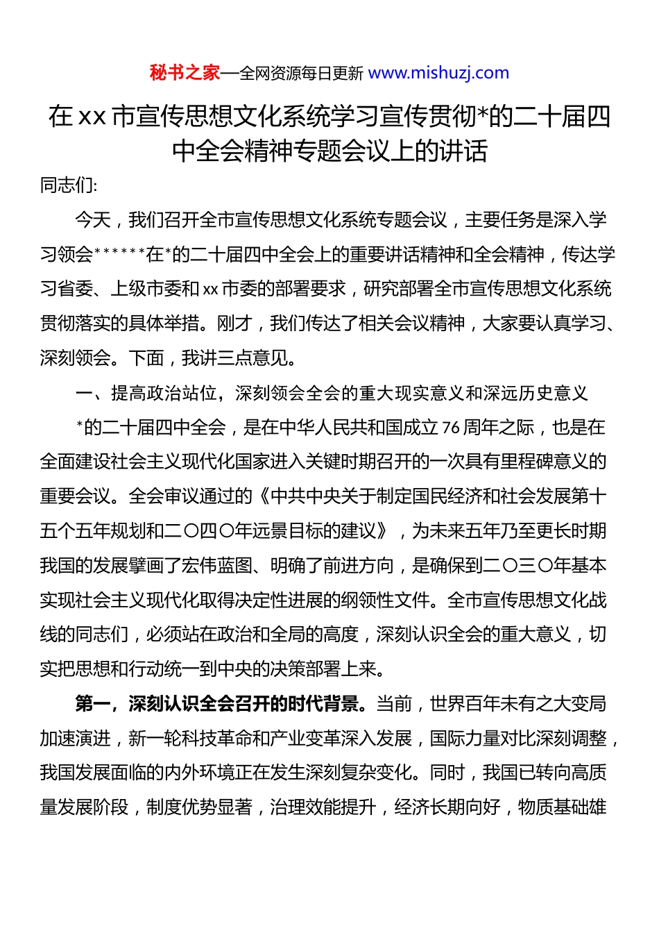 秘书之家—全网资源每日更新 www.mishuzj.com在 xx 市宣传思想文化系统学习宣传贯彻*的二十届四中全会精神专题会议上的讲话同志们:今天,我们召开全市宣传思想文化系统专题会议,主要任务是深入学习领会******在*的二十届四中全会上的重要讲话精神和全会精神,传达学习省委、上级市委和 xx 市委的部署要求,研究部署全市宣传思想文化系统贯彻落实的具体举措。刚才,我们传达了相关会议精神,大家要认真学习、深刻领会。下面,我讲三点意见。一、提高政治站位,深刻领会全会的重大现实意义和深远历史意义*的二十届四中全会,是在中华人民共和国成立 76 周年之际,也是在全面建设社会主义现代化国家进入关键时期召开的一次具有里程碑意义的重要会议。全会审议通过的《中共中央关于制定国民经济和社会发展第十五个五年规划和二〇四〇年远景目标的建议》,为未来五年乃至更长时期我国的发展擘画了宏伟蓝图、明确了前进方向,是确保到二〇三〇年基本实现社会主义现代化取得决定性进展的纲领性文件。全市宣传思想文化战线的同志们,必须站在政治和全局的高度,深刻认识全会的重大意义,切实把思想和行动统一到中央的决策部署上来。第一,深刻认识全会召开的时代背景。当前,世界百年未有之大变局加速演进,新一轮科技革命和产业变革深入发展,国际力量对比深刻调整,我国发展面临的内外环境正在发生深刻复杂变化。同时,我国已转向高质量发展阶段,制度优势显著,治理效能提升,经济长期向好,物质基础雄秘书之家—全网资源每日更新 www.mishuzj.com雄厚,人力资源丰富,市场空间广阔,发展韧性强劲。在这样一个关键节点上,中央召开四中全会,专题研究“十五五”规划问题,正是为了在新的历史起点上,统筹中华民族伟大复兴战略全局和世界百年未有之大变局,团结带领全国各族人民向着第二个百年奋斗目标奋勇前进。这充分体现了以***同志为核心的*中央高瞻远瞩的战略眼光、统揽全局的战略思维和“一张蓝图绘到底”的战略定力。第二,深刻领会《建议》的核心要义。《建议》系统回答了新发展阶段“实现什么样的发展、如何实现发展”这一重大课题,是**************思想在经济社会发展领域的具体化和生动实践。我们要深入学习领会“十五五”时期经济社会发展的指导思想、必须遵守的重大原则、主要目标、重大举措和根本保证。特别是要准确把握“因地制宜发展新质生产力”这一重大论断,这为我们推动产业转型升级、实现高质量发展指明了根本路径。同时,文件强调的科技创新、扩大内需、绿色发展、区域协调、民生保障等重点任务构成了未来发展的“四梁八柱”,需要我们在工作中逐项对标、逐条落实。第三,深刻把握赋予宣传思想文化工作的新使命。《建议》对“繁荣发展社会主义文化”作出专章部署,明确提出要“营造良好文化生态,提升文化原创能力,推动新闻出版、广播影视、文学艺术等领域精品创作;培育高水平文化人才队伍;加快发展文化产业;提升中华文明传播力影响力”等一系列重要任务。这既是对宣传思想文化工作提出的新要求,也是我们服务发展大局、贡献文化力量的着力点和突破口。我们必须清醒认识到,推秘书之家—全网资源每日更新 www.mishuzj.com动高质量发展,不仅需要强大的物质力量,更需要强大的精神力量。宣传思想文化战线肩负着举旗帜、聚民心、育新人、兴文化、展形象的使命任务,在贯彻落实全会精神的进程中,地位特殊、责任重大,必须先行一步、学深一层,主动担当、积极作为。二、聚焦使命任务,迅速掀起学习宣传贯彻全会精神的热潮学习好、宣传好、贯彻好*的二十届四中全会精神,是当前和今后一个时期全市上下的重大政治任务,更是宣传思想文化战线必须扛起的政治责任。全市宣传思想文化系统要树立“一盘棋”思想,坚持系统安排和统筹推进,精心组织、周密部署,迅速在 xx 大地掀起学习宣传贯彻热潮,让全会精神家喻户晓、深入人心。(一)坚持学深悟透,在理论武装上走在前列。理论上的清醒是政治上坚定的基础。宣传思想文化系统的干部作为*的“喉舌”和理论武装的组织者、推动者,自身首先要学懂弄通。各级*委(*组)理论学习中心组要把学习全会精神作为重中之重,...