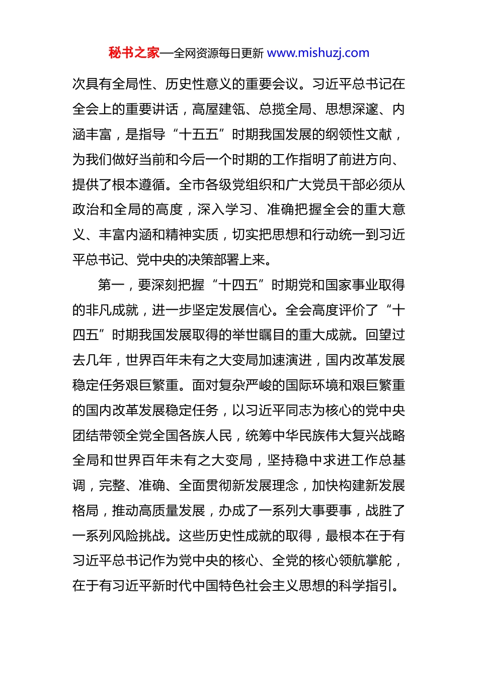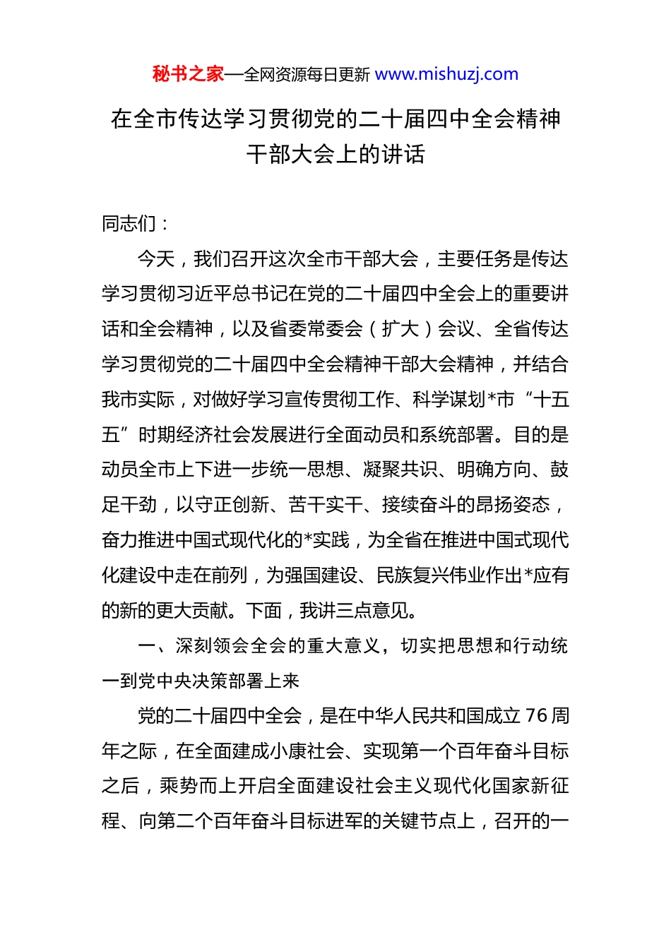 秘书之家—全网资源每日更新 www.mishuzj.com在全市传达学习贯彻党的二十届四中全会精神干部大会上的讲话 同志们:今天,我们召开这次全市干部大会,主要任务是传达学习贯彻习近平总书记在党的二十届四中全会上的重要讲话和全会精神,以及省委常委会(扩大)会议、全省传达学习贯彻党的二十届四中全会精神干部大会精神,并结合我市实际,对做好学习宣传贯彻工作、科学谋划*市“十五五”时期经济社会发展进行全面动员和系统部署。目的是动员全市上下进一步统一思想、凝聚共识、明确方向、鼓足干劲,以守正创新、苦干实干、接续奋斗的昂扬姿态,奋力推进中国式现代化的*实践,为全省在推进中国式现代化建设中走在前列,为强国建设、民族复兴伟业作出*应有的新的更大贡献。下面,我讲三点意见。一、深刻领会全会的重大意义,切实把思想和行动统一到党中央决策部署上来党的二十届四中全会,是在中华人民共和国成立 76 周年之际,在全面建成小康社会、实现第一个百年奋斗目标之后,乘势而上开启全面建设社会主义现代化国家新征程、向第二个百年奋斗目标进军的关键节点上,召开的一秘书之家—全网资源每日更新 www.mishuzj.com次具有全局性、历史性意义的重要会议。习近平总书记在全会上的重要讲话,高屋建瓴、总揽全局、思想深邃、内涵丰富,是指导“十五五”时期我国发展的纲领性文献,为我们做好当前和今后一个时期的工作指明了前进方向、提供了根本遵循。全市各级党组织和广大党员干部必须从政治和全局的高度,深入学习、准确把握全会的重大意义、丰富内涵和精神实质,切实把思想和行动统一到习近平总书记、党中央的决策部署上来。第一,要深刻把握“十四五”时期党和国家事业取得的非凡成就,进一步坚定发展信心。全会高度评价了“十四五”时期我国发展取得的举世瞩目的重大成就。回望过去几年,世界百年未有之大变局加速演进,国内改革发展稳定任务艰巨繁重。面对复杂严峻的国际环境和艰巨繁重的国内改革发展稳定任务,以习近平同志为核心的党中央团结带领全党全国各族人民,统筹中华民族伟大复兴战略全局和世界百年未有之大变局,坚持稳中求进工作总基调,完整、准确、全面贯彻新发展理念,加快构建新发展格局,推动高质量发展,办成了一系列大事要事,战胜了一系列风险挑战。这些历史性成就的取得,最根本在于有习近平总书记作为党中央的核心、全党的核心领航掌舵,在于有习近平新时代中国特色社会主义思想的科学指引。秘书之家—全网资源每日更新 www.mishuzj.com深刻认识这些成就,就是要引导全市干部群众更加深刻领悟“两个确立”的决定性意义,增强“四个意识”、坚定“四个自信”、做到“两个维护”,不断增强在新征程上迎难而上、开拓进取的信心和底气。第二,要深刻把握党中央对“十五五”时期发展形势的重大判断,进一步增强机遇意识和风险意识。全会科学分析了当前和今后一个时期我国发展面临的内外环境,明确指出“十五五”时期是全面推进强国建设、民族复兴伟业的关键五年。从国际看,新一轮科技革命和产业变革深入发展,全球治理体系深刻重塑,但单边主义、保护主义抬头,地缘政治风险加剧,外部环境的复杂性、严峻性、不确定性上升。从国内看,我国经济长期向好的基本面没有改变,制度优势显著、市场空间广阔、产业体系完备、人力资源丰富,但也面临有效需求不足、部分行业产能过剩、社会预期偏弱、风险隐患仍然较多等挑战。准确把握这些重大判断,要求我们必须坚持底线思维和极限思维,既要看到有利条件、抢抓发展机遇,也要正视困难挑战、有效防范化解风险,牢牢把握发展主动权,在危机中育先机、于变局中开新局。第三,要深刻把握“十五五”时期经济社会发展的宏伟蓝图,进一步明确奋斗方向。全会系统擘画了“十五秘书之家—全网资源每日更新 www.mishuzj.com五”时期经济社会发展的指导方针、基本原则、主要目标和战略安排。全会提出的指导方针,强调了坚持和加强党的全面领导、坚持以人民为中心、坚持新发展理念等一系列根本要求。全会确定的发展目标,聚焦经济高质量发展、改革开放迈出新步伐、社会文明程度得到新提高、生态文明建设取得新进步、民生...