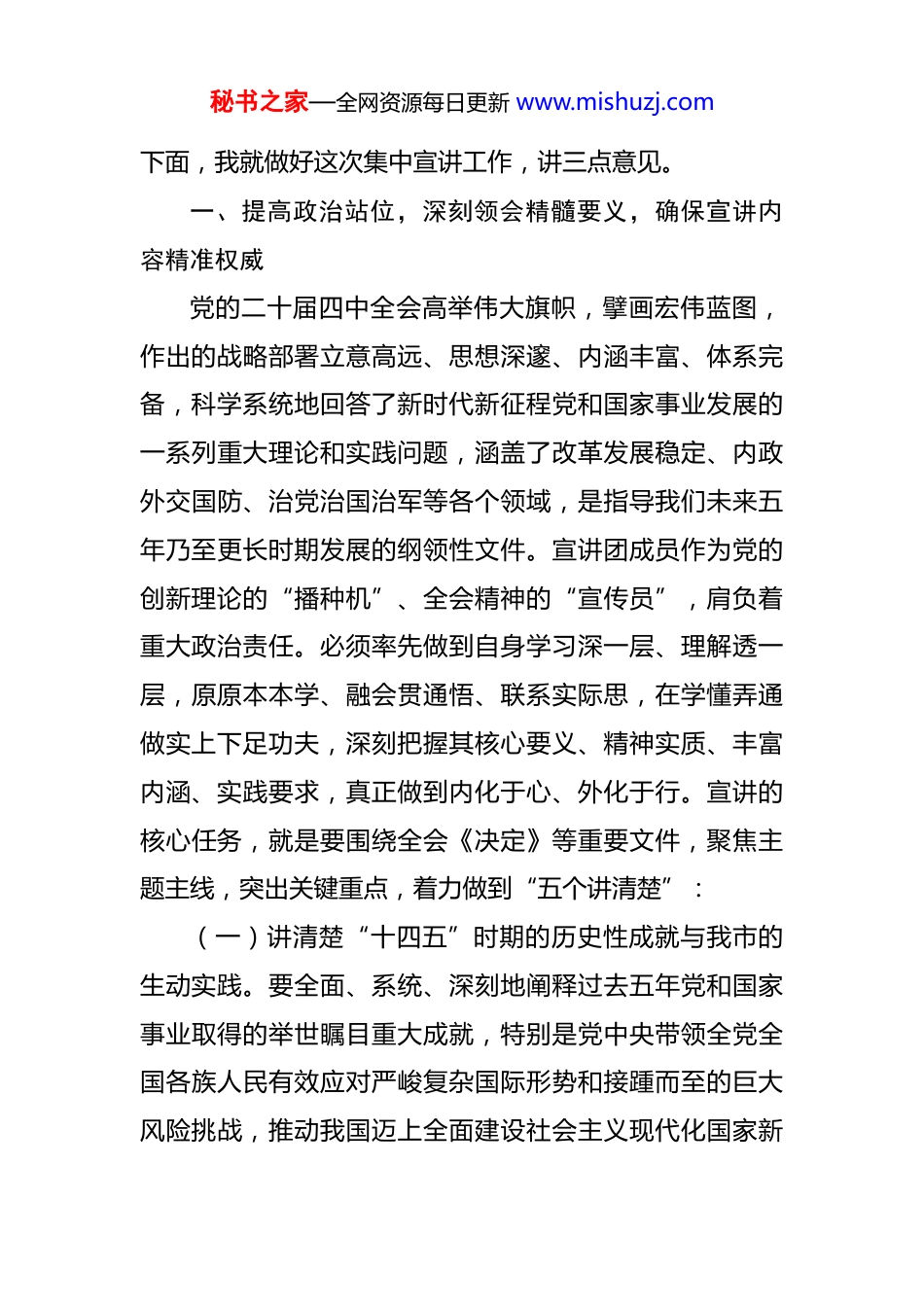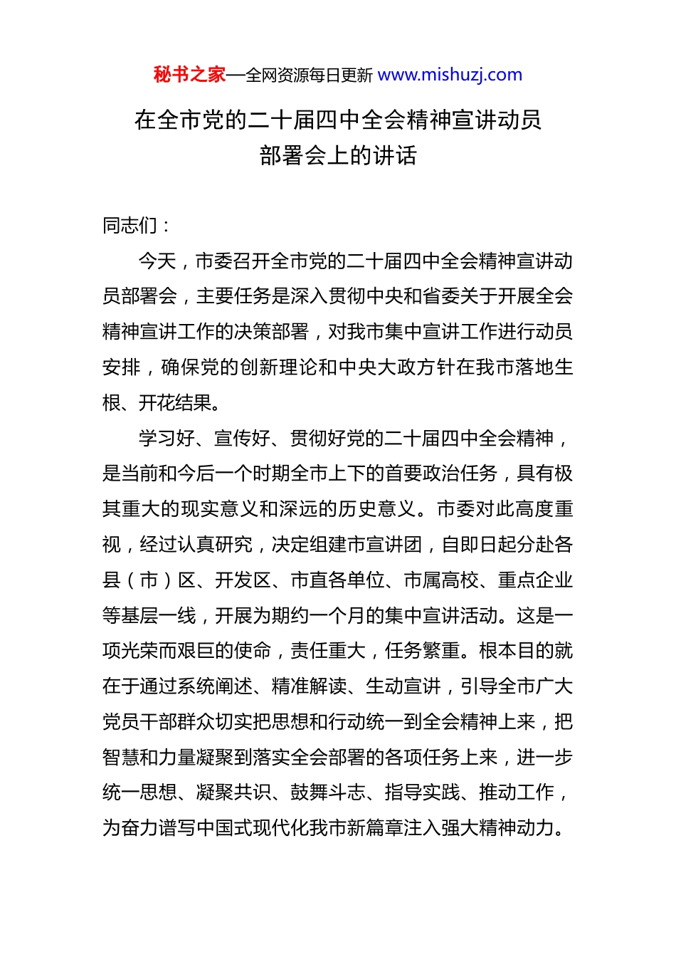 秘书之家—全网资源每日更新 www.mishuzj.com在全市党的二十届四中全会精神宣讲动员部署会上的讲话 同志们:今天,市委召开全市党的二十届四中全会精神宣讲动员部署会,主要任务是深入贯彻中央和省委关于开展全会精神宣讲工作的决策部署,对我市集中宣讲工作进行动员安排,确保党的创新理论和中央大政方针在我市落地生根、开花结果。学习好、宣传好、贯彻好党的二十届四中全会精神,是当前和今后一个时期全市上下的首要政治任务,具有极其重大的现实意义和深远的历史意义。市委对此高度重视,经过认真研究,决定组建市宣讲团,自即日起分赴各县(市)区、开发区、市直各单位、市属高校、重点企业等基层一线,开展为期约一个月的集中宣讲活动。这是一项光荣而艰巨的使命,责任重大,任务繁重。根本目的就在于通过系统阐述、精准解读、生动宣讲,引导全市广大党员干部群众切实把思想和行动统一到全会精神上来,把智慧和力量凝聚到落实全会部署的各项任务上来,进一步统一思想、凝聚共识、鼓舞斗志、指导实践、推动工作,为奋力谱写中国式现代化我市新篇章注入强大精神动力。秘书之家—全网资源每日更新 www.mishuzj.com下面,我就做好这次集中宣讲工作,讲三点意见。一、提高政治站位,深刻领会精髓要义,确保宣讲内容精准权威党的二十届四中全会高举伟大旗帜,擘画宏伟蓝图,作出的战略部署立意高远、思想深邃、内涵丰富、体系完备,科学系统地回答了新时代新征程党和国家事业发展的一系列重大理论和实践问题,涵盖了改革发展稳定、内政外交国防、治党治国治军等各个领域,是指导我们未来五年乃至更长时期发展的纲领性文件。宣讲团成员作为党的创新理论的“播种机”、全会精神的“宣传员”,肩负着重大政治责任。必须率先做到自身学习深一层、理解透一层,原原本本学、融会贯通悟、联系实际思,在学懂弄通做实上下足功夫,深刻把握其核心要义、精神实质、丰富内涵、实践要求,真正做到内化于心、外化于行。宣讲的核心任务,就是要围绕全会《决定》等重要文件,聚焦主题主线,突出关键重点,着力做到“五个讲清楚”:(一)讲清楚“十四五”时期的历史性成就与我市的生动实践。要全面、系统、深刻地阐释过去五年党和国家事业取得的举世瞩目重大成就,特别是党中央带领全党全国各族人民有效应对严峻复杂国际形势和接踵而至的巨大风险挑战,推动我国迈上全面建设社会主义现代化国家新秘书之家—全网资源每日更新 www.mishuzj.com征程的光辉历程。紧密联系我市实际,重点讲好我市在“十四五”期间,坚决贯彻落实党中央及省委决策部署,抢抓长三角一体化发展、长江经济带发展、中部崛起等国家战略机遇,在科技创新领域取得量子通信、核聚变等领域的世界级突破性进展,高标准建设运行大科学装置集中区,打造综合性国家科学中心“金字招牌”;在战新产业发展方面,“芯屏汽合”、“急终生智”产业地标加速隆起,新型显示、集成电路、人工智能产业集群实力跻身全国前列,新能源汽车产业异军突起;在城市能级跃升上,现代化都市区框架全面拉开,城市功能品质显著提升,全国性综合交通枢纽地位巩固;在民生福祉改善方面,民生投入持续加大,居民收入稳步增长,“一老一小”、教育医疗、住房保障等公共服务体系更加健全优质。要用大量我市案例、我市数据、我市故事,全面生动展现国家发展伟力在我市大地的具体实践、丰硕成果和人民群众实实在在的获得感幸福感安全感。(二)讲清楚“十五五”时期的重大意义与我市的战略机遇。要深刻阐释“十五五”时期是我国全面建设社会主义现代化国家开局起步的关键五年,是承前启后、继往开来,奠定未来长远发展基础的战略窗口期。对于我市而言,这五年更是我们乘势而上、跨越赶超,勇当科技和产秘书之家—全网资源每日更新 www.mishuzj.com业创新开路先锋、打造全省高质量发展核心增长极的关键五年。要讲透我市在国家和区域发展格局中的坐标方位、使命任务:我们正处于多重国家战略叠加赋能的历史机遇期,科教资源富集、创新动能强劲的比较优势期,产业基础雄厚、转型升级加速的攻坚突破期。要引导全市上下深刻认识到肩负的时代重任,切实增强抢抓机遇...