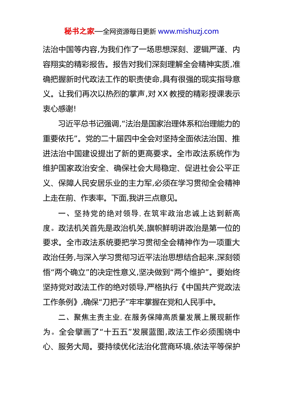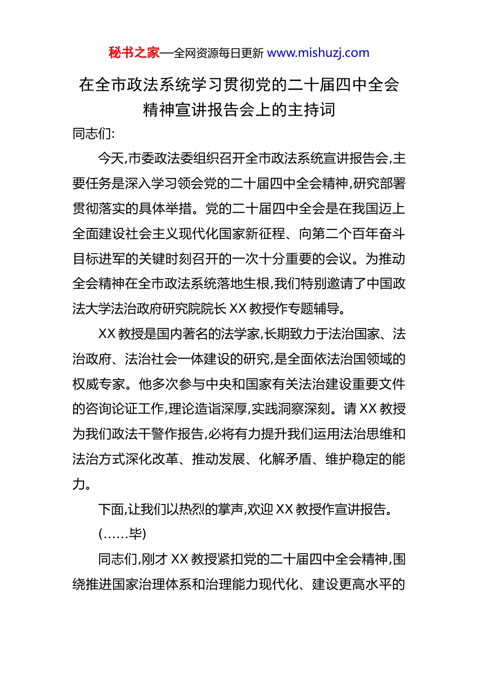 秘书之家—全网资源每日更新 www.mishuzj.com在全市政法系统学习贯彻党的二十届四中全会精神宣讲报告会上的主持词 同志们:今天,市委政法委组织召开全市政法系统宣讲报告会,主要任务是深入学习领会党的二十届四中全会精神,研究部署贯彻落实的具体举措。党的二十届四中全会是在我国迈上全面建设社会主义现代化国家新征程、向第二个百年奋斗目标进军的关键时刻召开的一次十分重要的会议。为推动全会精神在全市政法系统落地生根,我们特别邀请了中国政法大学法治政府研究院院长 XX 教授作专题辅导。XX 教授是国内著名的法学家,长期致力于法治国家、法治政府、法治社会一体建设的研究,是全面依法治国领域的权威专家。他多次参与中央和国家有关法治建设重要文件的咨询论证工作,理论造诣深厚,实践洞察深刻。请 XX 教授为我们政法干警作报告,必将有力提升我们运用法治思维和法治方式深化改革、推动发展、化解矛盾、维护稳定的能力。下面,让我们以热烈的掌声,欢迎 XX 教授作宣讲报告。(……毕)同志们,刚才 XX 教授紧扣党的二十届四中全会精神,围绕推进国家治理体系和治理能力现代化、建设更高水平的秘书之家—全网资源每日更新 www.mishuzj.com法治中国等内容,为我们作了一场思想深刻、逻辑严谨、内容翔实的精彩报告。报告对我们深刻理解全会精神实质,准确把握新时代政法工作的职责使命,具有很强的现实指导意义。让我们再次以热烈的掌声,对 XX 教授的精彩授课表示衷心感谢!习近平总书记强调,“法治是国家治理体系和治理能力的”重要依托 。党的二十届四中全会对坚持全面依法治国、推进法治中国建设提出了新的更高要求。全市政法系统作为维护国家政治安全、确保社会大局稳定、促进社会公平正义、保障人民安居乐业的主力军,必须在学习贯彻全会精神上走在前、作表率。下面,我讲三点意见。一、坚持党的绝对领导,在筑牢政治忠诚上达到新高度。政法机关首先是政治机关,旗帜鲜明讲政治是第一位的要求。全市政法系统要把学习贯彻全会精神作为一项重大政治任务,与深入学习贯彻习近平法治思想结合起来,深刻领“”悟 两个确立 的决定性意义,“”坚决做到 两个维护 。要始终坚持党对政法工作的绝对领导,严格执行《中国共产党政法工作条例》,“”确保 刀把子 牢牢掌握在党和人民手中。二、聚焦主责主业,在服务保障高质量发展上展现新作为。“”全会擘画了 十五五 发展蓝图,政法工作必须围绕中心、服务大局。要持续优化法治化营商环境,依法平等保护秘书之家—全网资源每日更新 www.mishuzj.com各类市场主体合法权益,对破坏市场经济秩序的违法犯罪行为,要依法严厉打击。要主动对接我市 XX 新区建设、XX 产业集群发展等重大战略,提供全周期、全链条的法律服务和“法治保障。要坚持和发展新时代 XX”经验 ,深入开展矛盾纠纷排查化解,严防发生重大群体性事件和个人极端案事件,建设更高水平的平安 XX。三、深化改革创新,在推进政法工作现代化上迈出新步伐。要以贯彻全会精神为动力,坚定不移深化政法领域改革。要全面准确落实司法责任制,深化以审判为中心的刑事诉讼制度改革,让人民群众在每一个司法案件中感受到公平正义。要加快推进政法智能化建设,深化大数据、人工智能等现代科技在安防预警、案件办理、诉讼服务等领域的应用,向科技要警力、要战斗力。要巩固深化政法队伍教育整顿成果,着力锻造一支忠诚干净担当的新时代政法铁军,为奋力谱写中国式现代化 XX 新篇章保驾护航。今天的报告会到此结束。散会。