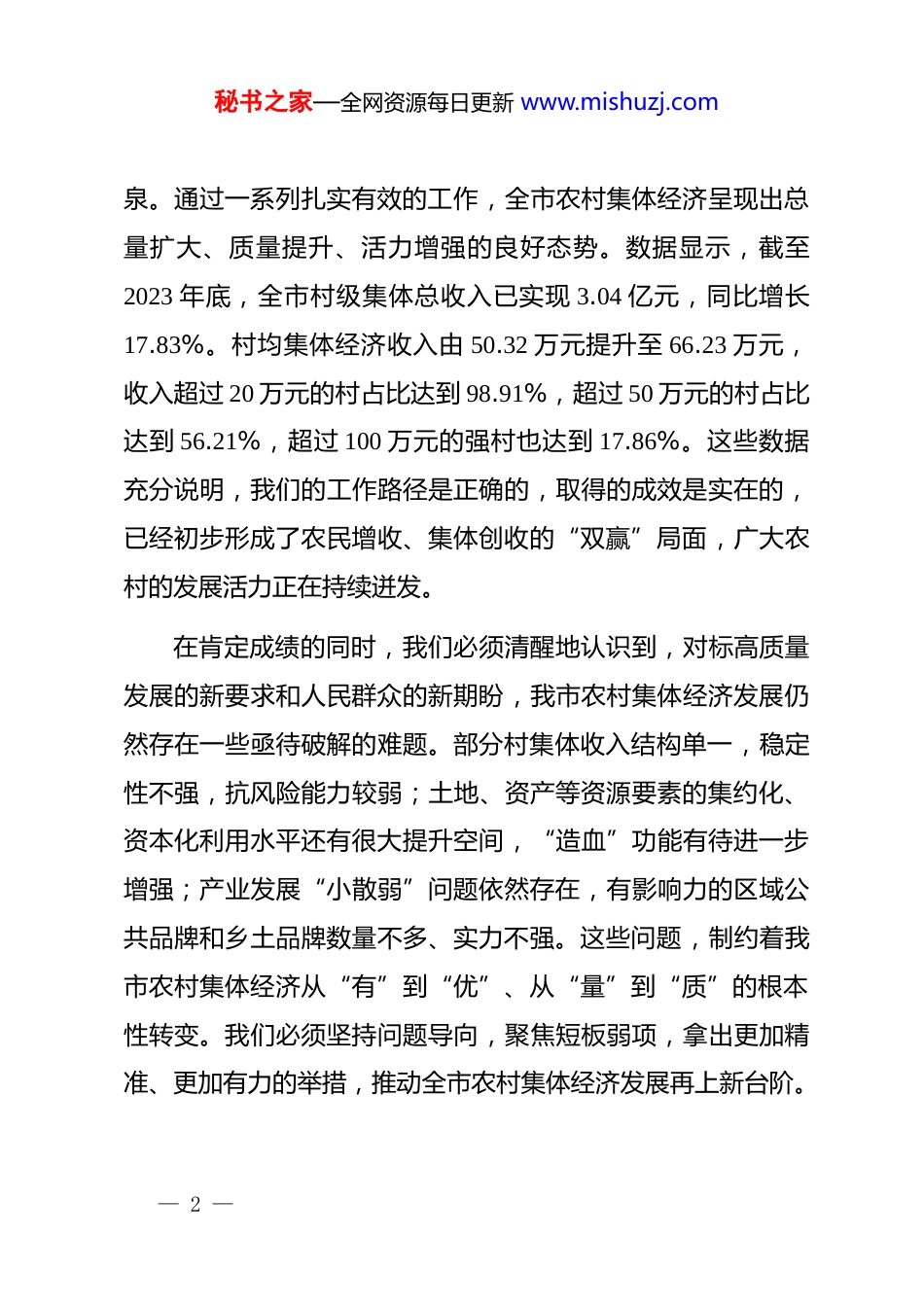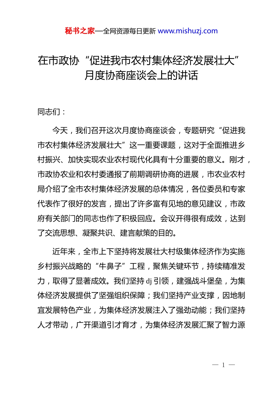 秘书之家—全网资源每日更新 www.mishuzj.com在市政协“促进我市农村集体经济发展壮大”月度协商座谈会上的讲话同志们:今天,我们召开这次月度协商座谈会,专题研究“促进我市农村集体经济发展壮大”这一重要课题,这对于全面推进乡村振兴、加快实现农业农村现代化具有十分重要的意义。刚才,市政协农业和农村委通报了前期调研协商的进展,市农业农村局介绍了全市农村集体经济发展的总体情况,各位委员和专家代表作了很好的发言,提出了许多富有见地的意见建议,市政府有关部门的同志也作了积极回应。会议开得很有成效,达到了交流思想、凝聚共识、建言献策的目的。近年来,全市上下坚持将发展壮大村级集体经济作为实施乡村振兴战略的“牛鼻子”工程,聚焦关键环节,持续精准发力,取得了显著成效。我们坚持 dj 引领,建强战斗堡垒,为集体经济发展提供了坚强组织保障;我们坚持产业支撑,因地制宜发展特色产业,为集体经济发展注入了强劲动能;我们坚持人才带动,广开渠道引才育才,为集体经济发展汇聚了智力源— 1 —秘书之家—全网资源每日更新 www.mishuzj.com泉。通过一系列扎实有效的工作,全市农村集体经济呈现出总量扩大、质量提升、活力增强的良好态势。数据显示,截至2023 年底,全市村级集体总收入已实现 3.04 亿元,同比增长17.83%。村均集体经济收入由 50.32 万元提升至 66.23 万元,收入超过 20 万元的村占比达到 98.91%,超过 50 万元的村占比达到 56.21%,超过 100 万元的强村也达到 17.86%。这些数据充分说明,我们的工作路径是正确的,取得的成效是实在的,已经初步形成了农民增收、集体创收的“双赢”局面,广大农村的发展活力正在持续迸发。在肯定成绩的同时,我们必须清醒地认识到,对标高质量发展的新要求和人民群众的新期盼,我市农村集体经济发展仍然存在一些亟待破解的难题。部分村集体收入结构单一,稳定性不强,抗风险能力较弱;土地、资产等资源要素的集约化、资本化利用水平还有很大提升空间,“造血”功能有待进一步增强;产业发展“小散弱”问题依然存在,有影响力的区域公共品牌和乡土品牌数量不多、实力不强。这些问题,制约着我市农村集体经济从“有”到“优”、从“量”到“质”的根本性转变。我们必须坚持问题导向,聚焦短板弱项,拿出更加精准、更加有力的举措,推动全市农村集体经济发展再上新台阶。— 2 —秘书之家—全网资源每日更新 www.mishuzj.com下面,我讲三点意见。一、聚焦产业升级,在打造核心竞争力上实现新突破发展壮大农村集体经济,根基在产业,核心在竞争力。必须把推动产业高质量发展作为主攻方向,加快实现从“卖资源”向“卖产品”“卖品牌”转变。要大力发展特色优势产业。各地要立足资源禀赋,深度挖掘自身潜力,走好“一村一品”发展之路。要巩固提升传统种养业,积极推广先进技术,发展绿色有机农业,提高土地产出效益。要大力培育新兴产业,对已经显现出良好势头的产业,要加大扶持力度,形成规模化、集群化效应。例如,我市中药材种植面积在 2022 年已突破 39 万亩,种植农户年均增收达 1.5万元,这样的特色产业要持续做大做强。再如,密山市等地蓬勃发展的民宿经济,通过打造“琴海小筑”“乐山居”等一批特色民宿,仅在 2022 年就接待游客 10 万人次,新增收入 79.91万元,成功将生态优势转化为了经济优势。这些成功实践充分证明,只要找准路子,就能把资源优势转化为发展优势。要精心培育壮大乡土品牌。品牌是农业竞争力的核心标志要改变过去“重生产、轻品牌”的观念,将品牌建设贯穿于产— 3 —秘书之家—全网资源每日更新 www.mishuzj.com业发展全过程。要整合区域资源,集中力量打造一批叫得响、记得住、传得开的区域公共品牌。要鼓励村集体、合作社、龙头企业等主体,开发具有鲜明地域特色和文化内涵的产品品牌、企业品牌。要加强品牌宣传推介,利用各类平台讲好品牌故事,提升品牌附加值和影响力。通过开发产品类、区域类、企业类等多类型乡土品牌,以品牌效应带动产业升级,实现溢价增收,真正让好产品卖出好价钱。要着力延伸产业链条。要围绕主导产业,推动产业...
