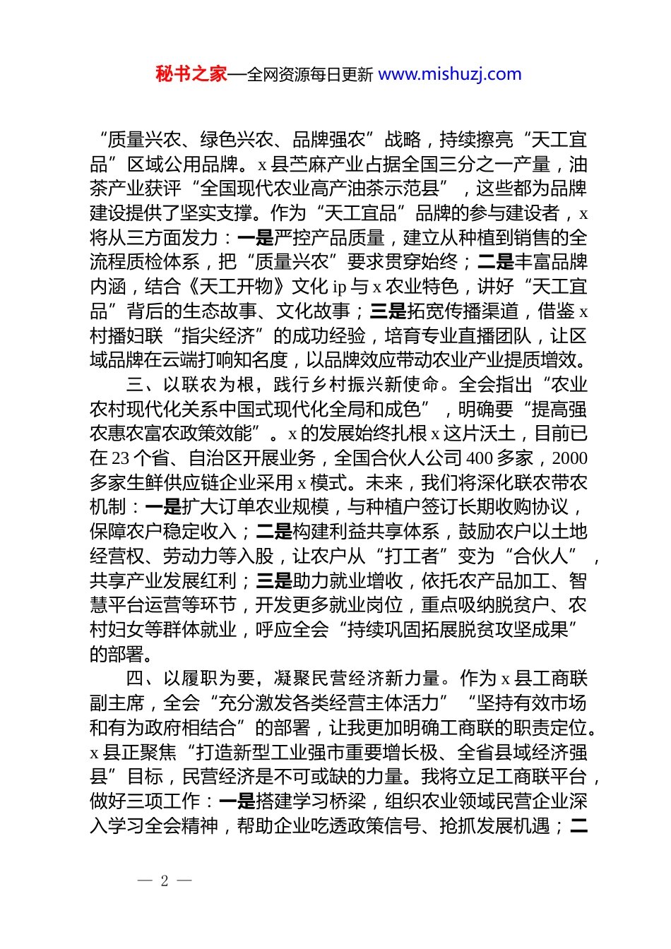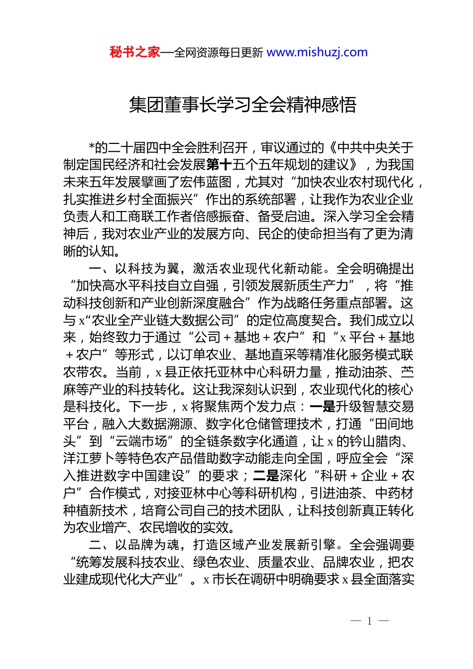 秘书之家—全网资源每日更新 www.mishuzj.com集团董事长学习全会精神感悟*的二十届四中全会胜利召开,审议通过的《中共中央关于制定国民经济和社会发展第十五个五年规划的建议》,为我国未来五年发展擘画了宏伟蓝图,尤其对“加快农业农村现代化,扎实推进乡村全面振兴”作出的系统部署,让我作为农业企业负责人和工商联工作者倍感振奋、备受启迪。深入学习全会精神后,我对农业产业的发展方向、民企的使命担当有了更为清晰的认知。一、以科技为翼,激活农业现代化新动能。全会明确提出“加快高水平科技自立自强,引领发展新质生产力”,将“推动科技创新和产业创新深度融合”作为战略任务重点部署。这与 x“农业全产业链大数据公司”的定位高度契合。我们成立以来,始终致力于通过“公司+基地+农户”和“x 平台+基地+农户”等形式,以订单农业、基地直采等精准化服务模式联农带农。当前,x 县正依托亚林中心科研力量,推动油茶、苎麻等产业的科技转化。这让我深刻认识到,农业现代化的核心是科技化。下一步,x 将聚焦两个发力点:一是升级智慧交易平台,融入大数据溯源、数字化仓储管理技术,打通“田间地头”到“云端市场”的全链条数字化通道,让 x 的钤山腊肉、洋江萝卜等特色农产品借助数字动能走向全国,呼应全会“深入推进数字中国建设”的要求;二是深化“科研+企业+农户”合作模式,对接亚林中心等科研机构,引进油茶、中药材种植新技术,培育公司自己的技术团队,让科技创新真正转化为农业增产、农民增收的实效。二、以品牌为魂,打造区域产业发展新引擎。全会强调要“统筹发展科技农业、绿色农业、质量农业、品牌农业,把农业建成现代化大产业”。x 市长在调研中明确要求 x 县全面落实— 1 —秘书之家—全网资源每日更新 www.mishuzj.com“质量兴农、绿色兴农、品牌强农”战略,持续擦亮“天工宜品”区域公用品牌。x 县苎麻产业占据全国三分之一产量,油茶产业获评“全国现代农业高产油茶示范县”,这些都为品牌建设提供了坚实支撑。作为“天工宜品”品牌的参与建设者,x将从三方面发力:一是严控产品质量,建立从种植到销售的全流程质检体系,把“质量兴农”要求贯穿始终;二是丰富品牌内涵,结合《天工开物》文化 ip 与 x 农业特色,讲好“天工宜品”背后的生态故事、文化故事;三是拓宽传播渠道,借鉴 x村播妇联“指尖经济”的成功经验,培育专业直播团队,让区域品牌在云端打响知名度,以品牌效应带动农业产业提质增效。三、以联农为根,践行乡村振兴新使命。全会指出“农业农村现代化关系中国式现代化全局和成色”,明确要“提高强农惠农富农政策效能”。x 的发展始终扎根 x 这片沃土,目前已在 23 个省、自治区开展业务,全国合伙人公司 400 多家,2000多家生鲜供应链企业采用 x 模式。未来,我们将深化联农带农机制:一是扩大订单农业规模,与种植户签订长期收购协议,保障农户稳定收入;二是构建利益共享体系,鼓励农户以土地经营权、劳动力等入股,让农户从“打工者”变为“合伙人”,共享产业发展红利;三是助力就业增收,依托农产品加工、智慧平台运营等环节,开发更多就业岗位,重点吸纳脱贫户、农村妇女等群体就业,呼应全会“持续巩固拓展脱贫攻坚成果”的部署。四、以履职为要,凝聚民营经济新力量。作为 x 县工商联副主席,全会“充分激发各类经营主体活力”“坚持有效市场和有为政府相结合”的部署,让我更加明确工商联的职责定位。x 县正聚焦“打造新型工业强市重要增长极、全省县域经济强县”目标,民营经济是不可或缺的力量。我将立足工商联平台,做好三项工作:一是搭建学习桥梁,组织农业领域民营企业深入学习全会精神,帮助企业吃透政策信号、抢抓发展机遇;二— 2 —秘书之家—全网资源每日更新 www.mishuzj.com是构建协作网络,推动农业企业与工业、文旅企业跨界合作,借鉴 x 镇“黄茶种植+文旅”的融合模式,拓展农业产业价值空间;三是强化服务对接,反映企业诉求,协助落实要素保障政策,让民营企业在高质量发展道路上轻装上阵。*的二十届四中全会为农业发展指明了方向,也为民营经济赋予了新...