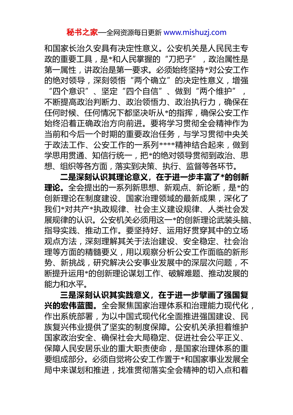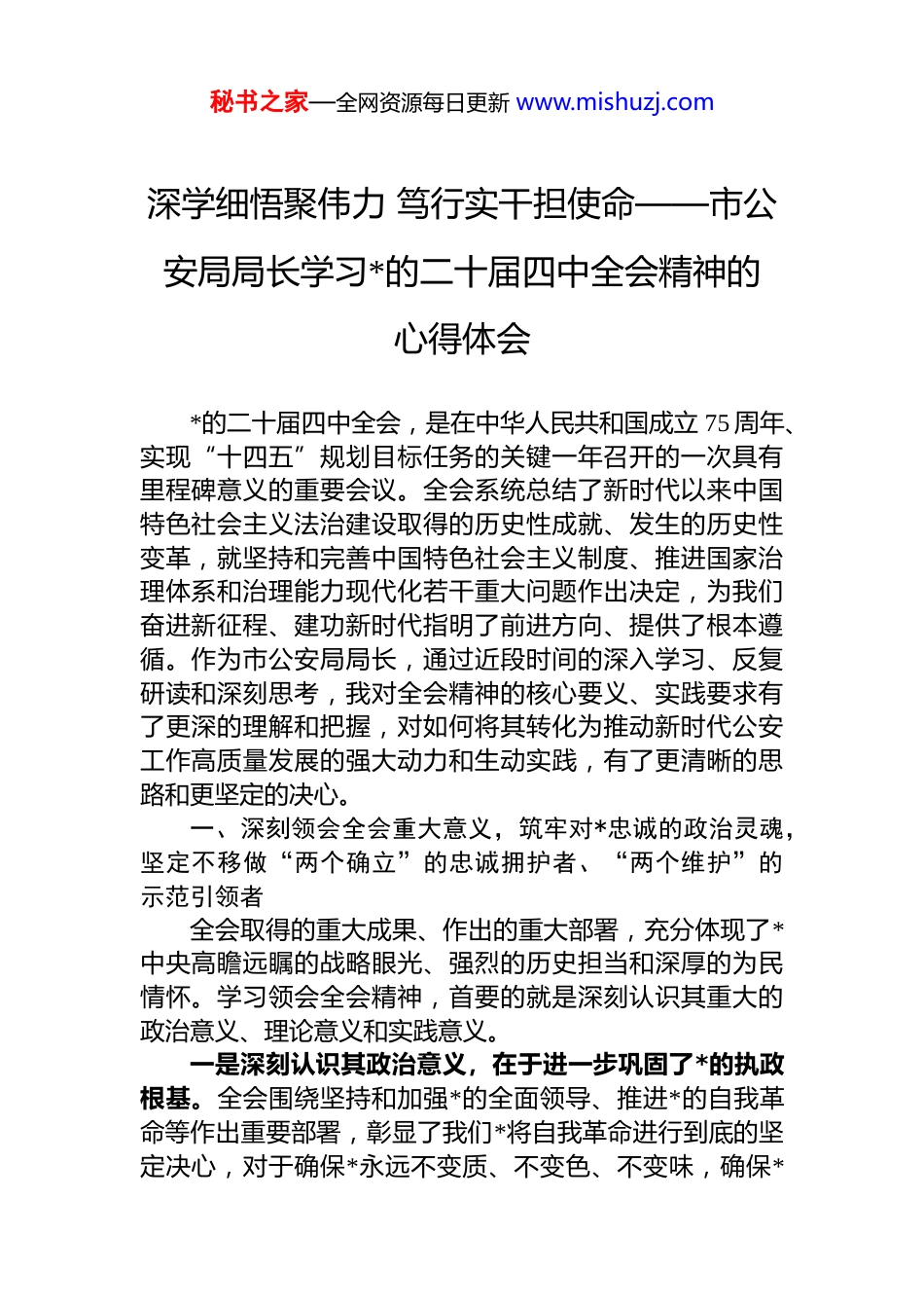 秘书之家—全网资源每日更新 www.mishuzj.com深学细悟聚伟力 笃行实干担使命——市公安局局长学习*的二十届四中全会精神的心得体会*的二十届四中全会,是在中华人民共和国成立 75 周年、实现“十四五”规划目标任务的关键一年召开的一次具有里程碑意义的重要会议。全会系统总结了新时代以来中国特色社会主义法治建设取得的历史性成就、发生的历史性变革,就坚持和完善中国特色社会主义制度、推进国家治理体系和治理能力现代化若干重大问题作出决定,为我们奋进新征程、建功新时代指明了前进方向、提供了根本遵循。作为市公安局局长,通过近段时间的深入学习、反复研读和深刻思考,我对全会精神的核心要义、实践要求有了更深的理解和把握,对如何将其转化为推动新时代公安工作高质量发展的强大动力和生动实践,有了更清晰的思路和更坚定的决心。一、深刻领会全会重大意义,筑牢对*忠诚的政治灵魂,坚定不移做“两个确立”的忠诚拥护者、“两个维护”的示范引领者全会取得的重大成果、作出的重大部署,充分体现了*中央高瞻远瞩的战略眼光、强烈的历史担当和深厚的为民情怀。学习领会全会精神,首要的就是深刻认识其重大的政治意义、理论意义和实践意义。一是深刻认识其政治意义,在于进一步巩固了*的执政根基。全会围绕坚持和加强*的全面领导、推进*的自我革命等作出重要部署,彰显了我们*将自我革命进行到底的坚定决心,对于确保*永远不变质、不变色、不变味,确保*秘书之家—全网资源每日更新 www.mishuzj.com和国家长治久安具有决定性意义。公安机关是人民民主专政的重要工具,是*和人民掌握的“刀把子”,政治属性是第一属性,讲政治是第一要求。必须始终坚持*对公安工作的绝对领导,深刻领悟“两个确立”的决定性意义,增强“四个意识”、坚定“四个自信”、做到“两个维护”,不断提高政治判断力、政治领悟力、政治执行力,确保在任何时候、任何情况下都坚决听从*的指挥,确保公安工作始终沿着正确政治方向前进。要将学习贯彻全会精神作为当前和今后一个时期的重要政治任务,与学习贯彻中央关于政法工作、公安工作的一系列****精神结合起来,做到学思用贯通、知信行统一,把*的绝对领导贯彻到政治、思想、组织等各方面,落实到决策、执行、监督等各环节。二是深刻认识其理论意义,在于进一步丰富了*的创新理论。全会提出的一系列新思想、新观点、新论断,是*的创新理论在制度建设、国家治理领域的最新成果,深化了我们*对共产*执政规律、社会主义建设规律、人类社会发展规律的认识。公安机关必须用这一*的创新理论武装头脑、指导实践、推动工作。要坚持好、运用好贯穿其中的立场观点方法,深刻理解其关于法治建设、安全稳定、社会治理等方面的精髓要义,用以观察分析公安工作面临的新形势、新挑战,研究解决公安事业发展中的深层次问题,不断提升运用*的创新理论谋划工作、破解难题、推动发展的能力和水平。三是深刻认识其实践意义,在于进一步擘画了强国复兴的宏伟蓝图。全会聚焦国家治理体系和治理能力现代化,作出系统部署,为以中国式现代化全面推进强国建设、民族复兴伟业提供了坚实的制度保障。公安机关承担着维护国家政治安全、确保社会大局稳定、促进社会公平正义、保障人民安居乐业的重大职责使命,是国家治理体系的重要组成部分。必须自觉将公安工作置于*和国家事业发展全局中来谋划和推进,找准贯彻落实全会精神的切入点和着秘书之家—全网资源每日更新 www.mishuzj.com力点,将制度优势更好地转化为治理效能,为建设更高水平的平安中国、法治中国贡献公安力量。二、准确把握全会核心要义,聚焦法治公安建设目标,全力维护社会公平正义全会对坚持全面依法治国、推进法治中国建设作出了重点部署,强调要“更好发挥法治固根本、稳预期、利长远的保障作用”。公安机关作为执法司法机关,在推进全面依法治国、建设社会主义法治国家中肩负着重大责任。必须紧紧围绕法治公安建设目标,持续深化执法规范化建设,努力让人民群众在每一起案件办理、每一件事情处理中都能感受到公平正义。一是必须牢固树立法治思维,恪守执法公正的生命线。法治是治国理政的基本方式,也...