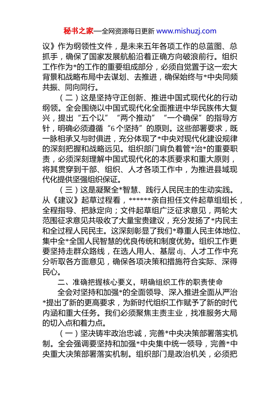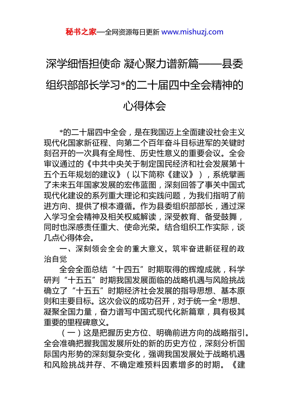 秘书之家—全网资源每日更新 www.mishuzj.com深学细悟担使命 凝心聚力谱新篇——县委组织部部长学习*的二十届四中全会精神的心得体会*的二十届四中全会,是在我国迈上全面建设社会主义现代化国家新征程、向第二个百年奋斗目标进军的关键时刻召开的一次具有全局性、历史性意义的重要会议。全会审议通过的《中共中央关于制定国民经济和社会发展第十五个五年规划的建议》(以下简称《建议》),系统擘画了未来五年国家发展的宏伟蓝图,深刻回答了事关中国式现代化建设的系列重大理论和实践问题,为我们指明了前进方向、提供了根本遵循。作为县委组织部部长,通过深入学习全会精神及相关权威解读,深受教育、备受鼓舞,同时也深感责任重大、使命光荣。结合组织工作实际,谈几点心得体会。一、深刻领会全会的重大意义,筑牢奋进新征程的政治自觉全会全面总结“十四五”时期取得的辉煌成就,科学研判“十五五”时期我国发展面临的战略机遇与风险挑战确立了“十五五”时期经济社会发展的指导思想、基本原则和主要目标。这次会议的成功召开,对于统一全*思想、凝聚全国力量,奋力谱写中国式现代化新篇章,具有极其重要的里程碑意义。(一)这是把握历史方位、明确前进方向的战略指引。全会准确把握我国发展所处的新的历史方位,深刻分析国际国内形势的深刻复杂变化,强调我国发展处于战略机遇和风险挑战并存、不确定难预料因素增多的时期。《建秘书之家—全网资源每日更新 www.mishuzj.com议》作为纲领性文件,是未来五年各项工作的总蓝图、总抓手,确保了国家发展航船沿着正确方向破浪前行。组织工作作为*的工作的重要组成部分,必须自觉置于这一宏大背景和战略布局中去谋划、去推进,确保始终与*中央同频共振、同向同行。(二)这是坚持守正创新、推进中国式现代化的行动纲领。全会围绕以中国式现代化全面推进中华民族伟大复兴,提出“五个以”“两个推动”“一个确保”的指导方针,明确必须遵循“6 个坚持”的原则。这些部署要求,既一脉相承又与时俱进,充分体现了*中央对现代化建设规律的深刻把握和战略远见。组织部门肩负着管*治*的重要职责,必须深刻理解中国式现代化的本质要求和重大原则,将其贯穿到干部、组织、人才各项工作中,为推进县域现代化提供坚强组织保证。(三)这是凝聚全*智慧、践行人民民主的生动实践。从《建议》起草过程看,******亲自担任文件起草组组长,全程指导、把脉定向;文件起草组广泛征求意见,两轮大范围征求意见共吸收了大量宝贵建议,充分发扬了*内民主和全过程人民民主。这深刻彰显了我们*尊重人民主体地位、集中全*全国人民智慧的优良传统和制度优势。组织工作更要坚持走群众路线,在选人用人、基层 dj、人才工作中充分听取各方面意见,确保各项决策和措施符合实际、深得民心。二、准确把握核心要义,明确组织工作的职责使命全会对坚持和加强*的全面领导、深入推进全面从严治*提出了新的更高要求,为新时代组织工作赋予了新的时代内涵和重大任务。我们必须聚焦主责主业,找准服务大局的切入点和着力点。(一)坚决铸牢政治忠诚,完善*中央决策部署落实机制。全会强调要坚持和加强*中央集中统一领导,完善*中央重大决策部署落实机制。组织部门是政治机关,必须把秘书之家—全网资源每日更新 www.mishuzj.com讲政治摆在首位,带头深刻领悟“两个确立”的决定性意义,坚决做到“两个维护”。要健全保障“两个维护”的制度机制,推动全县各级*组织和广大*员干部不折不扣贯彻落实*中央决策部署和省委、市委、县委工作要求,确保政令畅通、令行禁止。要加强对*员干部的政治训练和政治考察,不断提高政治判断力、政治领悟力、政治执行力。(二)树立鲜明用人导向,建设堪当民族复兴重任的高素质干部队伍。全会要求坚持正确用人导向,坚持把政治标准放在首位,树立和践行正确政绩观,完善干部考核评价机制。我们要紧紧围绕“十五五”发展需要,坚持新时代好干部标准,把那些政治上靠得住、工作上有本事、作风上过得硬、人民群众信得过的干部选拔到领导岗位上来。要优化干部育选管用工作,加强思想淬炼、政治历练实践锻炼、专业训练,注重在重大任务、...