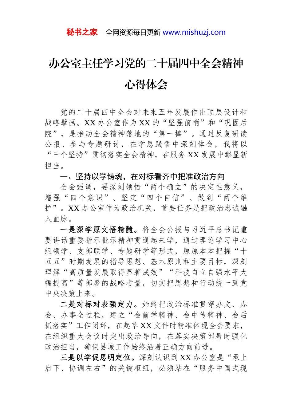 秘书之家—全网资源每日更新 www.mishuzj.com办公室主任学习党的二十届四中全会精神心得体会党的二十届四中全会对未来五年发展作出顶层设计和战略擘画。XX 办公室作为 XX 的“坚强前哨”和“巩固后院”,是推动全会精神落地的“第一棒”。通过反复研读公报、参与专题研讨,在学思践悟中深刻体会,我将以“三个坚持”贯彻落实全会精神,在服务 XX 发展中彰显新担当。一、坚持以学铸魂,在对标看齐中把准政治方向全会强调,要深刻领悟“两个确立”的决定性意义,增强“四个意识”、坚定“四个自信”、做到“两个维护”。XX 办公室作为政治机关,首要任务是把政治忠诚融入血脉。一是深学原文悟精髓。将全会公报与习近平总书记重要讲话重要指示批示精神贯通起来学,通过理论学习中心组领学、支部联学、专题研学等形式,原原本本把握“十五五”时期发展的指导思想、基本原则和主要目标,深刻理解“高质量发展取得显著成效”“科技自立自强水平大幅提高”等部署的战略考量,切实把思想和行动统一到党中央决策上来。二是对标对表强定力。始终把政治标准贯穿办文、办会、办事全过程,建立“会前学精神、会中传精神、会后抓落实”工作闭环,在起草 XX 文件时精准体现全会要求,在组织重大会议时突出政治导向,在落实决策部署时强化政治担当,确保县域工作始终沿着正确方向前进。三是以学促思明定位。深刻认识到 XX 办公室是“承上启下、协调左右”的关键枢纽,必须站在“服务中国式现秘书之家—全网资源每日更新 www.mishuzj.com代化建设”的高度谋划工作,把全会提出的“统筹发展和安全”“推进农业农村现代化”等任务,转化为服务 XX 决策的具体思路,当好贯彻全会精神的“第一方阵”。二、坚持以干践行,在服务大局中彰显担当作为全会提出,“十五五”时期要以推动高质量发展为主题,以改革创新为根本动力。XX 办公室作为 XX 治理的“中枢神经”,必须主动对接大局、服务大局。一是当好决策“参谋助手”。聚焦全会部署的“建设现代化产业体系”“加快构建高水平社会主义市场经济体制”等任务,牵头开展“XX 实体经济发展”“城乡融合体制创新”等专题调研,深入企业、乡村收集一手资料,梳理制约发展的体制机制障碍,形成针对性强的调研报告,为 XX 科学决策提供支撑。建立“政策解读+基层问需”机制,组织职能部门拆解全会政策要点,结合 XX 实际细化落实举措,确保上级部署精准落地。二是抓好落实“统筹协调”。针对全会提出的“进一步全面深化改革取得新突破”要求,建立 XX 重大决策落实台账,实行“清单化管理、项目化推进、常态化督办”。对“巩固拓展脱贫攻坚成果”“美丽中国建设”等重点工作,牵头协调农业农村、生态环境等部门建立联动机制,破解跨领域、跨部门协作难题。创新督查方式,变“事后检查”为“全程跟踪”,及时发现落实中的堵点,推动问题在一线解决。三是做好服务“保障支撑”。践行“以人民为中心”的发展思想,把全会“满足人民日益增长的美好生活需要”的要求融入日常服务。优化 XX 信访接待流程,建立“群众诉求—办公室转办—部门办理—跟踪反馈”闭环,推动解决教育、医疗等群众急难愁盼问题。深化基层减负严格控制会议文件数量,统筹规范督查考核,让基层干部有更多时间抓落实,把全会精神转化为群众可感的民生实效。秘书之家—全网资源每日更新 www.mishuzj.com三、坚持以严立身,在固本强基中锤炼过硬作风全会强调,必须以永远在路上的坚韧和执着,持之以恒推进全面从严治党,坚决把党的自我革命要求落实到位推进党的作风建设常态化长效化。XX 办公室必须以更高标准抓好自身建设。一是锤炼务实作风。传承“马上就办、真抓实干”的优良传统,对 XX 部署的全会精神落实任务,做到“今日事今日毕”;对基层反映的困难问题,第一时间协调回应。力戒形式主义,在文稿起草中突出“短实新”,在督查工作中注重“深准实”,以务实作风提升服务质效。二是强化能力建设。针对全会提出的“科技自立自强”“数字中国建设”等新任务,组织干部开展“数字技能”“改革政策”等专题培训,鼓励干部在实践中学习新知识、掌握新本领。建立“...