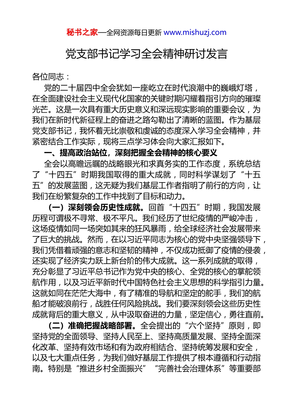 秘书之家—全网资源每日更新 www.mishuzj.com党支部书记学习全会精神研讨发言各位同志:党的二十届四中全会犹如一座屹立在时代浪潮中的巍峨灯塔,在全面建设社会主义现代化国家的关键时期闪耀着指引方向的璀璨光芒。这是一次具有重大历史意义和深远现实影响的重要会议,为我们在新时代新征程上的奋进之路勾勒出了清晰的蓝图。作为基层党支部书记,我怀着无比崇敬和虔诚的态度深入学习全会精神,并紧密结合工作实际,现将三点学习体会向大家汇报如下。一、提高政治站位,深刻把握全会精神的核心要义全会以高瞻远瞩的战略眼光和求真务实的工作态度,系统总结了“十四五”时期我国取得的重大成就,同时科学谋划了“十五五”的发展蓝图,这无疑为我们基层工作者指明了前行的方向,让我们在纷繁复杂的工作中找到了目标和动力。(一)深刻领会历史性成就。回首“十四五”时期,我国发展历程可谓极不寻常、极不平凡。我们经历了世纪疫情的严峻冲击,这场疫情如同一场突如其来的狂风暴雨,给全球经济社会发展带来了巨大的挑战。然而,在以习近平同志为核心的党中央坚强领导下,我们凭借着顽强的意志和坚韧的精神,不仅成功抵御了疫情的侵袭,还实现了经济实力跃上新台阶的伟大成就。这一系列成就的取得,充分彰显了习近平总书记作为党中央的核心、全党的核心的掌舵领航作用,以及习近平新时代中国特色社会主义思想的科学指引力量。这就如同在茫茫大海中,有了精准的导航和坚定的舵手,我们的航船才能破浪前行,战胜任何风险挑战。我们要深刻领会这些历史性成就背后的重大意义,从中汲取奋进的力量,坚定信心,勇往直前。(二)准确把握战略部署。全会提出的“六个坚持”原则,即坚持党的全面领导、坚持人民至上、坚持高质量发展、坚持全面深化改革、坚持有效市场和有为政府相结合、坚持统筹发展和安全,以及七大重点任务,为我们做好基层工作提供了根本遵循和行动指南。特别是“推进乡村全面振兴”“完善社会治理体系”等重要部秘书之家—全网资源每日更新 www.mishuzj.com署,与我们基层工作息息相关。乡村振兴是实现中华民族伟大复兴的一项重大任务,我们基层党支部要积极响应号召,充分发挥战斗堡垒作用,带领广大党员群众投身到乡村振兴的伟大事业中。完善社会治理体系则是维护社会稳定、促进社会和谐的重要保障,我们要结合基层实际,探索创新社会治理的方式方法,提高基层社会治理水平。(三)坚决扛起政治责任。“十五五”时期,我国面临着“战略机遇与风险挑战并存”的复杂形势,这就如同一场充满挑战与机遇的棋局,我们必须保持清醒的头脑,准确把握形势。“两个确立”是党在新时代取得的重大政治成果,是推动党和国家事业取得历史性成就、发生历史性变革的决定性因素。我们要深刻认识“两个确立”的决定性意义,将其转化为“两个维护”的实际行动。作为基层党支部书记,我要以身作则,带领全体党员干部坚决贯彻党中央的决策部署,在思想上、行动上与党中央保持高度一致,以高度的政治责任感和使命感,为实现“十五五”规划目标贡献力量。二、聚焦主责主业,推动全会精神在基层落地生根作为基层党建的“第一责任人”,我深知肩负的责任重大。我必须将全会的各项部署转化为具体的实践行动,让全会精神在基层这片土地上落地生根、开花结果。(一)筑牢战斗堡垒。一是开展“党建+民生服务”行动我们将组建党员志愿服务队,这就如同组建了一支为群众排忧解难的“先锋队”。党员志愿服务队要深入群众,了解他们的需求和困难,年内解决群众急难愁盼问题不少于 20 件。通过实实在在的行动,让群众感受到党的关怀和温暖,增强群众对党的信任和支持。二是实施“头雁培育”工程。党小组长是基层党组织的重要骨干力量,我们要实施“头雁培育”工程,培养 3-5 名政治强、业务精的党小组长。通过定期培训、实践锻炼等方式,提高他们的综合素质和领导能力,让他们成为基层党建工作的中坚力量。三是打造“智慧党建”平台。利用现代信息技术,打造“智慧党建”平台,实现组秘书之家—全网资源每日更新 www.mishuzj.com织生活 100%线上留痕。这不仅提高了党建工作的效率和透明度,还方便...