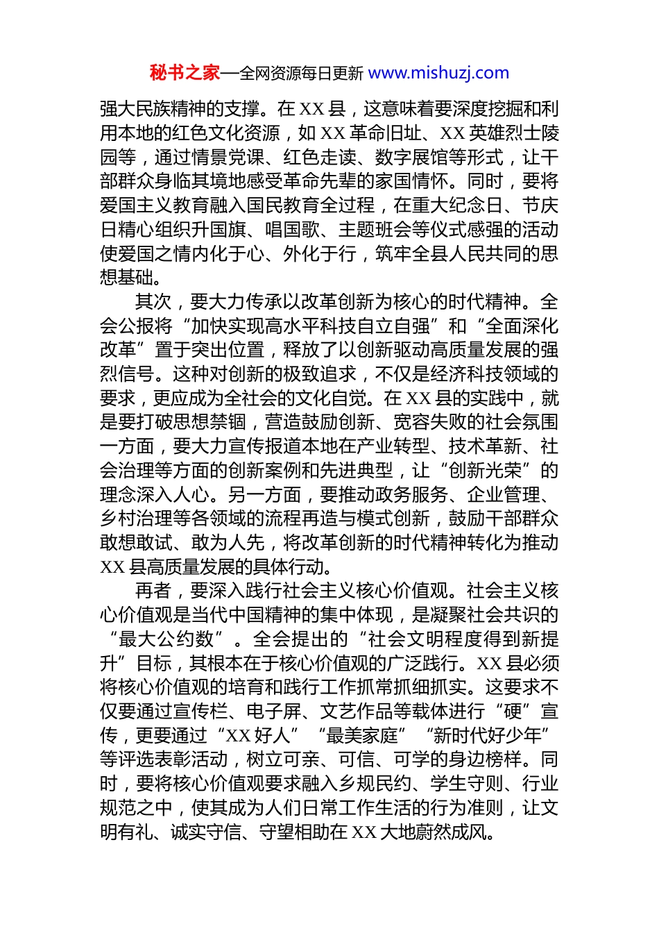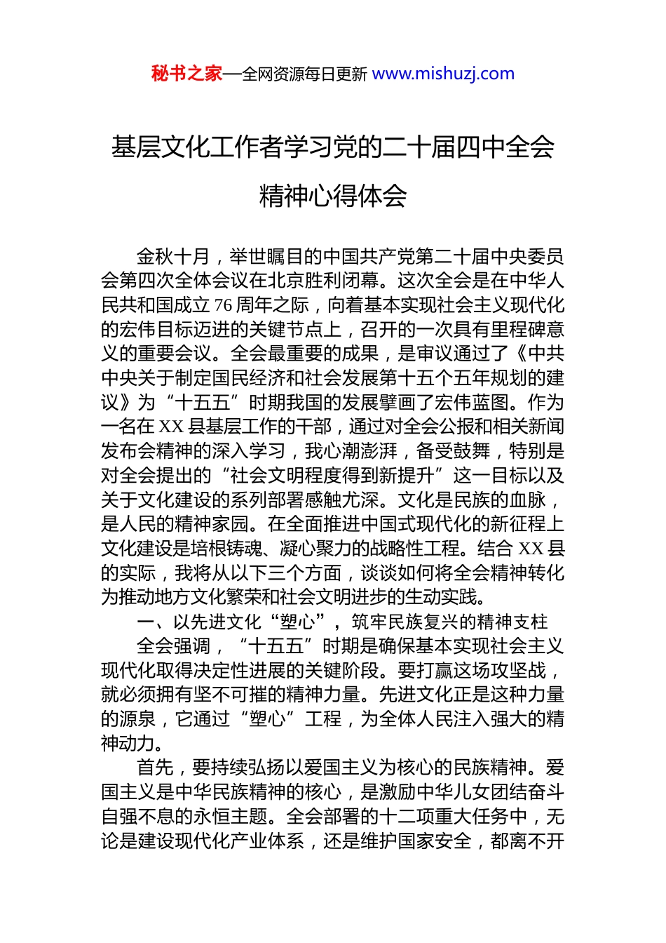 秘书之家—全网资源每日更新 www.mishuzj.com基层文化工作者学习党的二十届四中全会精神心得体会金秋十月,举世瞩目的中国共产党第二十届中央委员会第四次全体会议在北京胜利闭幕。这次全会是在中华人民共和国成立 76 周年之际,向着基本实现社会主义现代化的宏伟目标迈进的关键节点上,召开的一次具有里程碑意义的重要会议。全会最重要的成果,是审议通过了《中共中央关于制定国民经济和社会发展第十五个五年规划的建议》为“十五五”时期我国的发展擘画了宏伟蓝图。作为一名在 XX 县基层工作的干部,通过对全会公报和相关新闻发布会精神的深入学习,我心潮澎湃,备受鼓舞,特别是对全会提出的“社会文明程度得到新提升”这一目标以及关于文化建设的系列部署感触尤深。文化是民族的血脉,是人民的精神家园。在全面推进中国式现代化的新征程上文化建设是培根铸魂、凝心聚力的战略性工程。结合 XX 县的实际,我将从以下三个方面,谈谈如何将全会精神转化为推动地方文化繁荣和社会文明进步的生动实践。一、以先进文化“塑心”,筑牢民族复兴的精神支柱全会强调,“十五五”时期是确保基本实现社会主义现代化取得决定性进展的关键阶段。要打赢这场攻坚战,就必须拥有坚不可摧的精神力量。先进文化正是这种力量的源泉,它通过“塑心”工程,为全体人民注入强大的精神动力。首先,要持续弘扬以爱国主义为核心的民族精神。爱国主义是中华民族精神的核心,是激励中华儿女团结奋斗自强不息的永恒主题。全会部署的十二项重大任务中,无论是建设现代化产业体系,还是维护国家安全,都离不开秘书之家—全网资源每日更新 www.mishuzj.com强大民族精神的支撑。在 XX 县,这意味着要深度挖掘和利用本地的红色文化资源,如 XX 革命旧址、XX 英雄烈士陵园等,通过情景党课、红色走读、数字展馆等形式,让干部群众身临其境地感受革命先辈的家国情怀。同时,要将爱国主义教育融入国民教育全过程,在重大纪念日、节庆日精心组织升国旗、唱国歌、主题班会等仪式感强的活动使爱国之情内化于心、外化于行,筑牢全县人民共同的思想基础。其次,要大力传承以改革创新为核心的时代精神。全会公报将“加快实现高水平科技自立自强”和“全面深化改革”置于突出位置,释放了以创新驱动高质量发展的强烈信号。这种对创新的极致追求,不仅是经济科技领域的要求,更应成为全社会的文化自觉。在 XX 县的实践中,就是要打破思想禁锢,营造鼓励创新、宽容失败的社会氛围一方面,要大力宣传报道本地在产业转型、技术革新、社会治理等方面的创新案例和先进典型,让“创新光荣”的理念深入人心。另一方面,要推动政务服务、企业管理、乡村治理等各领域的流程再造与模式创新,鼓励干部群众敢想敢试、敢为人先,将改革创新的时代精神转化为推动XX 县高质量发展的具体行动。再者,要深入践行社会主义核心价值观。社会主义核心价值观是当代中国精神的集中体现,是凝聚社会共识的“最大公约数”。全会提出的“社会文明程度得到新提升”目标,其根本在于核心价值观的广泛践行。XX 县必须将核心价值观的培育和践行工作抓常抓细抓实。这要求不仅要通过宣传栏、电子屏、文艺作品等载体进行“硬”宣传,更要通过“XX 好人”“最美家庭”“新时代好少年”等评选表彰活动,树立可亲、可信、可学的身边榜样。同时,要将核心价值观要求融入乡规民约、学生守则、行业规范之中,使其成为人们日常工作生活的行为准则,让文明有礼、诚实守信、守望相助在 XX 大地蔚然成风。秘书之家—全网资源每日更新 www.mishuzj.com二、以优秀作品“育人”,满足人民群众的文化需求全会明确提出要“加大保障和改善民生力度”,而满足人民群众日益增长的精神文化需求,是改善民生的重要组成部分。优秀的文化产品和服务,如春风化雨,能够启迪思想、温润心灵、陶冶人生。一是要着力推出更多增强人民精神力量的优秀作品。高质量的文艺作品是时代的号角。当前,人民群众对文化产品的需求不仅求“有”,更求“优”。作为基层文化工作者,要积极响应全会号召,引导和支持 XX 县的文艺工作者们,坚持以人民为中心的创作导向,深入田间地...
