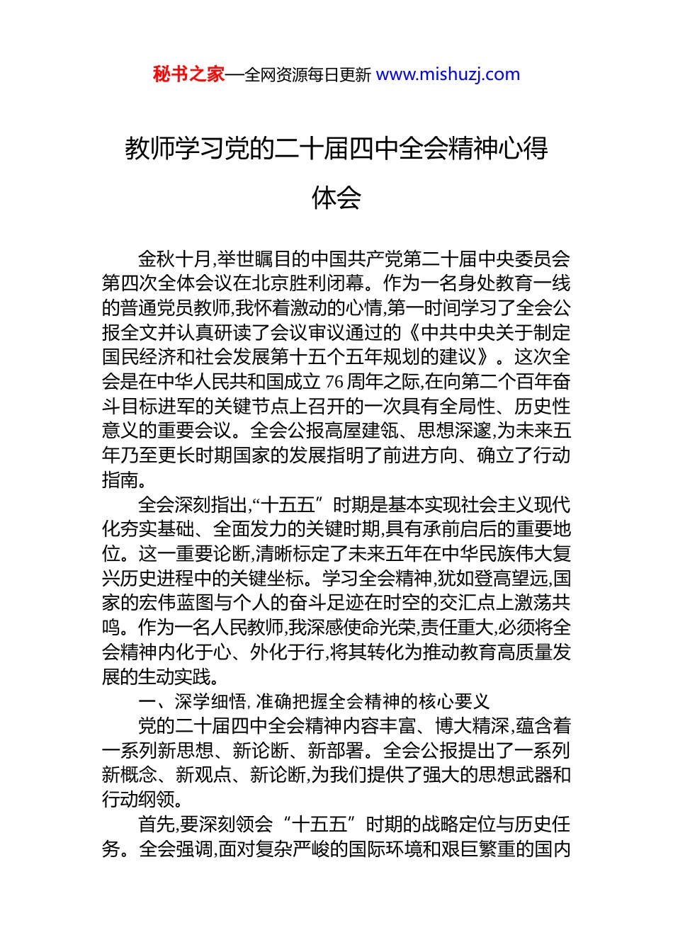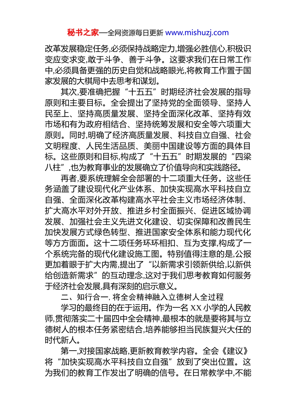 秘书之家—全网资源每日更新 www.mishuzj.com教师学习党的二十届四中全会精神心得体会金秋十月,举世瞩目的中国共产党第二十届中央委员会第四次全体会议在北京胜利闭幕。作为一名身处教育一线的普通党员教师,我怀着激动的心情,第一时间学习了全会公报全文并认真研读了会议审议通过的《中共中央关于制定国民经济和社会发展第十五个五年规划的建议》。这次全会是在中华人民共和国成立 76 周年之际,在向第二个百年奋斗目标进军的关键节点上召开的一次具有全局性、历史性意义的重要会议。全会公报高屋建瓴、思想深邃,为未来五年乃至更长时期国家的发展指明了前进方向、确立了行动指南。全会深刻指出,“十五五”时期是基本实现社会主义现代化夯实基础、全面发力的关键时期,具有承前启后的重要地位。这一重要论断,清晰标定了未来五年在中华民族伟大复兴历史进程中的关键坐标。学习全会精神,犹如登高望远,国家的宏伟蓝图与个人的奋斗足迹在时空的交汇点上激荡共鸣。作为一名人民教师,我深感使命光荣,责任重大,必须将全会精神内化于心、外化于行,将其转化为推动教育高质量发展的生动实践。一、深学细悟,准确把握全会精神的核心要义党的二十届四中全会精神内容丰富、博大精深,蕴含着一系列新思想、新论断、新部署。全会公报提出了一系列新概念、新观点、新论断,为我们提供了强大的思想武器和行动纲领。首先,要深刻领会“十五五”时期的战略定位与历史任务。全会强调,面对复杂严峻的国际环境和艰巨繁重的国内秘书之家—全网资源每日更新 www.mishuzj.com改革发展稳定任务,必须保持战略定力,增强必胜信心,积极识变应变求变,敢于斗争、善于斗争。这要求我们在日常工作中,必须具备更强的历史自觉和战略眼光,将教育工作置于国家发展的大棋局中去思考和谋划。其次,要准确把握“十五五”时期经济社会发展的指导原则和主要目标。全会提出了坚持党的全面领导、坚持人民至上、坚持高质量发展、坚持全面深化改革、坚持有效市场和有为政府相结合、坚持统筹发展和安全等六项重大原则。同时,明确了经济高质量发展、科技自立自强、社会文明程度、人民生活品质、美丽中国建设等方面的具体目标。这些原则和目标,构成了“十五五”时期发展的“四梁八柱”,也为教育事业的发展确立了价值导向和实践路径。再者,要系统理解全会部署的十二项重大任务。这些任务涵盖了建设现代化产业体系、加快实现高水平科技自立自强、全面深化改革构建高水平社会主义市场经济体制、扩大高水平对外开放、推进乡村全面振兴、促进区域协调发展、加强社会主义先进文化建设、切实保障和改善民生加快发展方式绿色转型、推进国家安全体系和能力现代化等方方面面。这十二项任务环环相扣、互为支撑,构成了一个系统完备的现代化建设施工图。特别值得注意的是,公报更加着眼于扩大内需,提出了“以新需求引领新供给,以新供给创造新需求”的互动理念,这对于我们思考教育如何服务于经济社会发展,具有深刻的启示意义。二、知行合一,将全会精神融入立德树人全过程学习的最终目的在于运用。作为一名 XX 小学的人民教师,贯彻落实二十届四中全会精神,最根本的就是要将其与立德树人的根本任务紧密结合,培养能够担当民族复兴大任的时代新人。第一,对接国家战略,更新教育教学内容。全会《建议》将“加快实现高水平科技自立自强”放到了突出位置。这为我们的教育工作发出了明确的信号。在日常教学中,不能秘书之家—全网资源每日更新 www.mishuzj.com再满足于传统的知识传授,必须将科学精神、创新意识和实践能力的培养贯穿于各学科教学之中。在科学课上,要多设计一些探究性、开放性的实验,激发学生的好奇心和想象力。在信息技术课上,要引导学生了解人工智能、大数据等前沿科技,培养他们的数字素养。在语文、数学等基础学科中,也要有意识地融入逻辑思维、批判性思维的训练,为培养未来的创新人才打下坚实的基础。同时,全会提出的“加快发展方式绿色转型”和“加强社会主义先进文化建设”等任务,也要求我们在德育和美育工作中,加强生态文明教育和中华优秀传统文化教育,引导学生树立正确的生态观和文化观,增强文化自信。第二,聚焦核心素养,创新人才培养模式...
