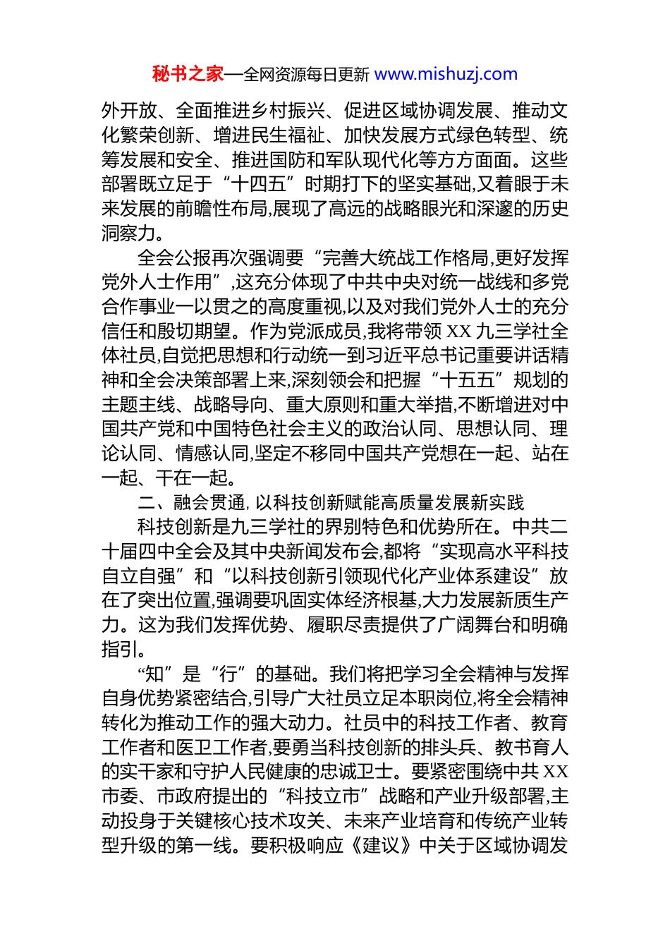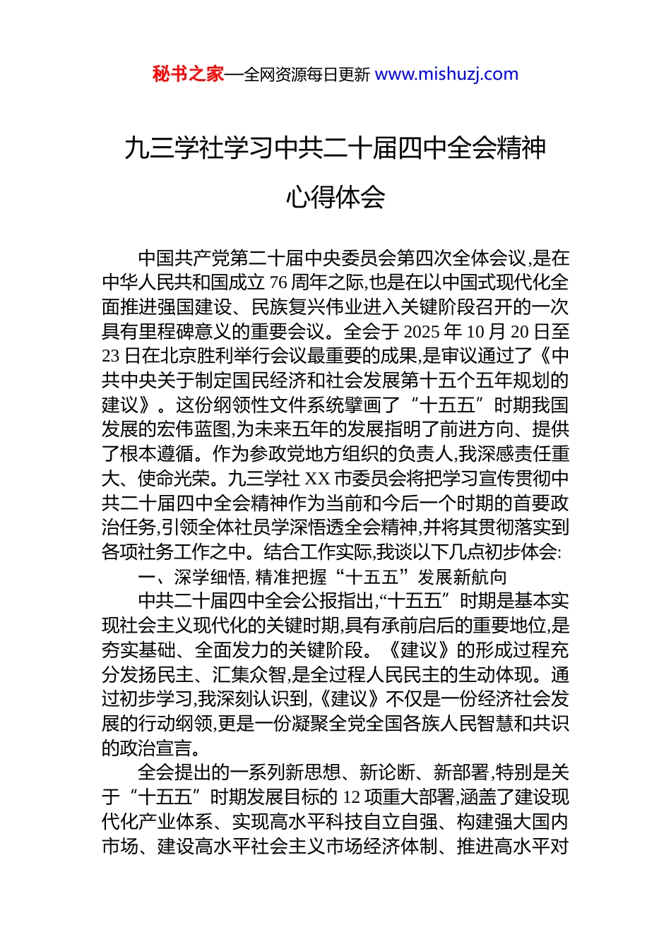 秘书之家—全网资源每日更新 www.mishuzj.com九三学社学习中共二十届四中全会精神心得体会中国共产党第二十届中央委员会第四次全体会议,是在中华人民共和国成立 76 周年之际,也是在以中国式现代化全面推进强国建设、民族复兴伟业进入关键阶段召开的一次具有里程碑意义的重要会议。全会于 2025 年 10 月 20 日至23 日在北京胜利举行会议最重要的成果,是审议通过了《中共中央关于制定国民经济和社会发展第十五个五年规划的建议》。这份纲领性文件系统擘画了“十五五”时期我国发展的宏伟蓝图,为未来五年的发展指明了前进方向、提供了根本遵循。作为参政党地方组织的负责人,我深感责任重大、使命光荣。九三学社 XX 市委员会将把学习宣传贯彻中共二十届四中全会精神作为当前和今后一个时期的首要政治任务,引领全体社员学深悟透全会精神,并将其贯彻落实到各项社务工作之中。结合工作实际,我谈以下几点初步体会:一、深学细悟,精准把握“十五五”发展新航向中共二十届四中全会公报指出,“十五五”时期是基本实现社会主义现代化的关键时期,具有承前启后的重要地位,是夯实基础、全面发力的关键阶段。《建议》的形成过程充分发扬民主、汇集众智,是全过程人民民主的生动体现。通过初步学习,我深刻认识到,《建议》不仅是一份经济社会发展的行动纲领,更是一份凝聚全党全国各族人民智慧和共识的政治宣言。全会提出的一系列新思想、新论断、新部署,特别是关于“十五五”时期发展目标的 12 项重大部署,涵盖了建设现代化产业体系、实现高水平科技自立自强、构建强大国内市场、建设高水平社会主义市场经济体制、推进高水平对秘书之家—全网资源每日更新 www.mishuzj.com外开放、全面推进乡村振兴、促进区域协调发展、推动文化繁荣创新、增进民生福祉、加快发展方式绿色转型、统筹发展和安全、推进国防和军队现代化等方方面面。这些部署既立足于“十四五”时期打下的坚实基础,又着眼于未来发展的前瞻性布局,展现了高远的战略眼光和深邃的历史洞察力。全会公报再次强调要“完善大统战工作格局,更好发挥党外人士作用”,这充分体现了中共中央对统一战线和多党合作事业一以贯之的高度重视,以及对我们党外人士的充分信任和殷切期望。作为党派成员,我将带领 XX 九三学社全体社员,自觉把思想和行动统一到习近平总书记重要讲话精神和全会决策部署上来,深刻领会和把握“十五五”规划的主题主线、战略导向、重大原则和重大举措,不断增进对中国共产党和中国特色社会主义的政治认同、思想认同、理论认同、情感认同,坚定不移同中国共产党想在一起、站在一起、干在一起。二、融会贯通,以科技创新赋能高质量发展新实践科技创新是九三学社的界别特色和优势所在。中共二十届四中全会及其中央新闻发布会,都将“实现高水平科技自立自强”和“以科技创新引领现代化产业体系建设”放在了突出位置,强调要巩固实体经济根基,大力发展新质生产力。这为我们发挥优势、履职尽责提供了广阔舞台和明确指引。“知”是“行”的基础。我们将把学习全会精神与发挥自身优势紧密结合,引导广大社员立足本职岗位,将全会精神转化为推动工作的强大动力。社员中的科技工作者、教育工作者和医卫工作者,要勇当科技创新的排头兵、教书育人的实干家和守护人民健康的忠诚卫士。要紧密围绕中共 XX市委、市政府提出的“科技立市”战略和产业升级部署,主动投身于关键核心技术攻关、未来产业培育和传统产业转型升级的第一线。要积极响应《建议》中关于区域协调发秘书之家—全网资源每日更新 www.mishuzj.com展和农业农村现代化的号召继续深化“科技兴农”“医疗下乡”“教育帮扶”等社会服务品牌项目,将先进的科学技术、医疗资源和教育理念送到基层,服务群众,为 XX 市的城乡融合发展和乡村全面振兴贡献智慧和力量。我们将积极探索创新激励机制,鼓励社员在各自领域争先创优,将个人专长与国家和地方发展的宏大叙事相结合,在新征程上展现新作为。三、笃行实干,推动参政履职成果转化再上新台阶参政议政、民主监督、参加中国共产党领导的政治协商,是参政党的基本职能。学习贯彻全会精神,最终要落脚到提升履职实效上。我们将把全会精神作...