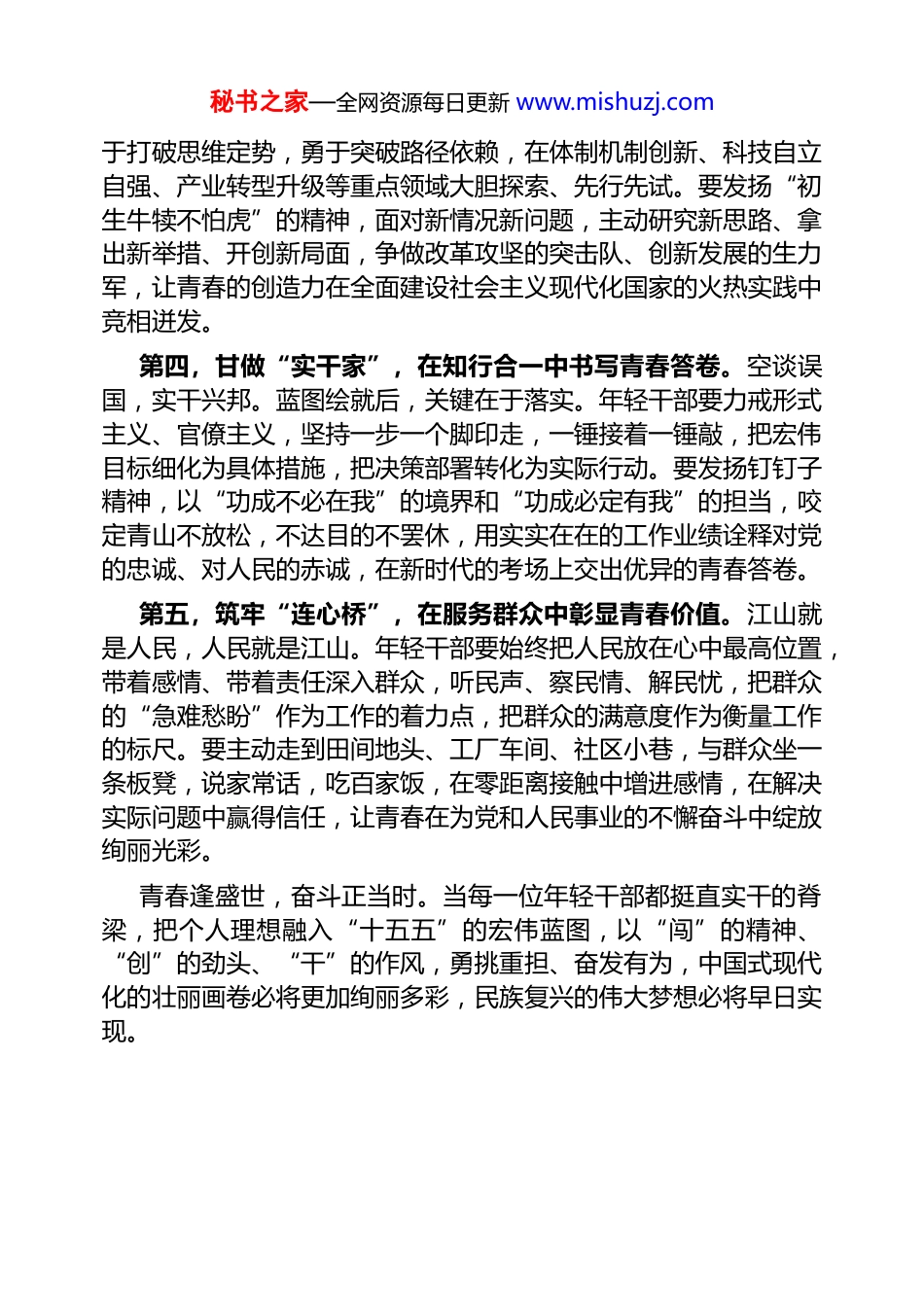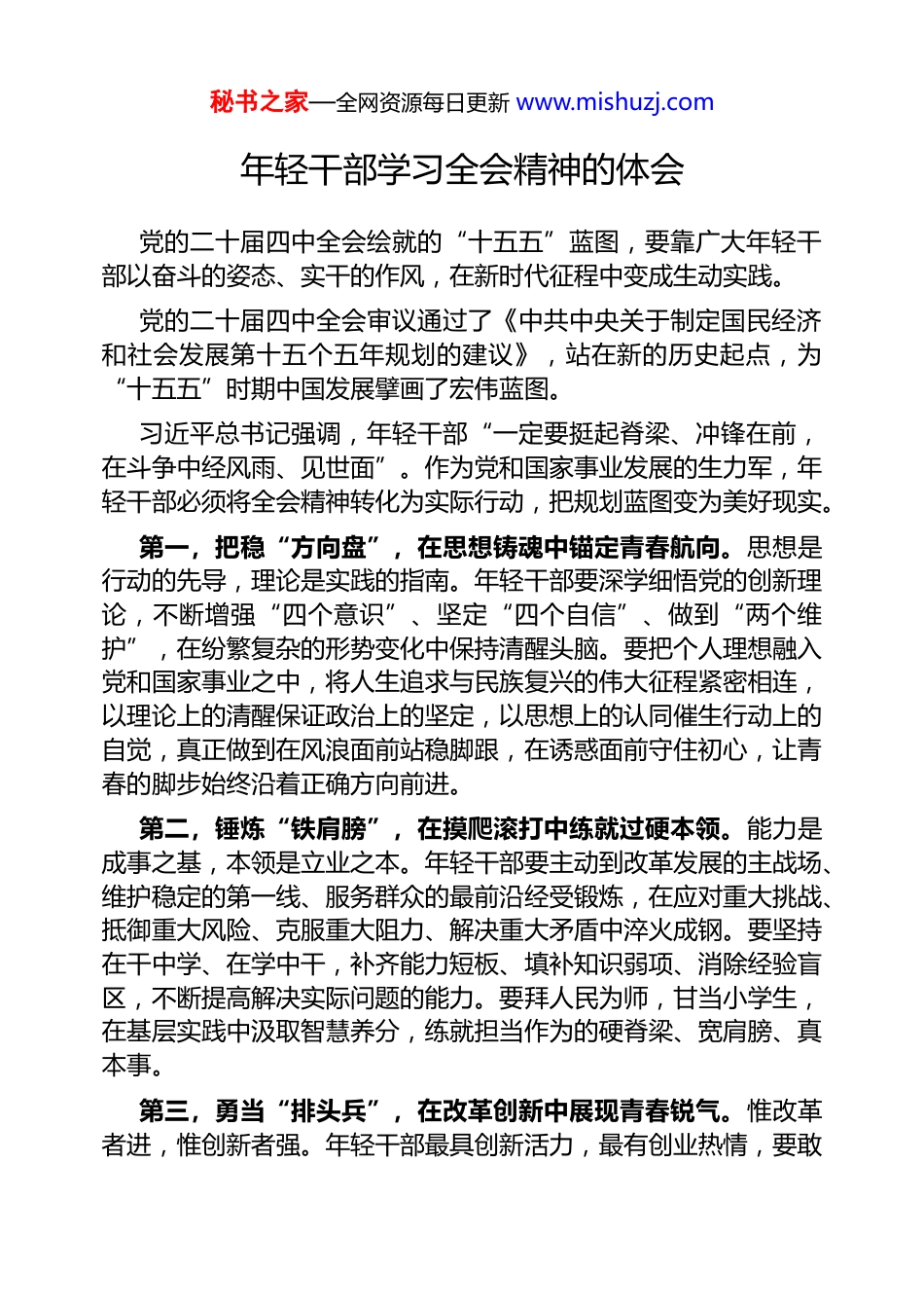 秘书之家—全网资源每日更新 www.mishuzj.com年轻干部学习全会精神的体会党的二十届四中全会绘就的“十五五”蓝图,要靠广大年轻干部以奋斗的姿态、实干的作风,在新时代征程中变成生动实践。党的二十届四中全会审议通过了《中共中央关于制定国民经济和社会发展第十五个五年规划的建议》,站在新的历史起点,为“十五五”时期中国发展擘画了宏伟蓝图。习近平总书记强调,年轻干部“一定要挺起脊梁、冲锋在前,在斗争中经风雨、见世面”。作为党和国家事业发展的生力军,年轻干部必须将全会精神转化为实际行动,把规划蓝图变为美好现实。第一,把稳“方向盘”,在思想铸魂中锚定青春航向。思想是行动的先导,理论是实践的指南。年轻干部要深学细悟党的创新理论,不断增强“四个意识”、坚定“四个自信”、做到“两个维护”,在纷繁复杂的形势变化中保持清醒头脑。要把个人理想融入党和国家事业之中,将人生追求与民族复兴的伟大征程紧密相连,以理论上的清醒保证政治上的坚定,以思想上的认同催生行动上的自觉,真正做到在风浪面前站稳脚跟,在诱惑面前守住初心,让青春的脚步始终沿着正确方向前进。第二,锤炼“铁肩膀”,在摸爬滚打中练就过硬本领。能力是成事之基,本领是立业之本。年轻干部要主动到改革发展的主战场、维护稳定的第一线、服务群众的最前沿经受锻炼,在应对重大挑战、抵御重大风险、克服重大阻力、解决重大矛盾中淬火成钢。要坚持在干中学、在学中干,补齐能力短板、填补知识弱项、消除经验盲区,不断提高解决实际问题的能力。要拜人民为师,甘当小学生,在基层实践中汲取智慧养分,练就担当作为的硬脊梁、宽肩膀、真本事。第三,勇当“排头兵”,在改革创新中展现青春锐气。惟改革者进,惟创新者强。年轻干部最具创新活力,最有创业热情,要敢秘书之家—全网资源每日更新 www.mishuzj.com于打破思维定势,勇于突破路径依赖,在体制机制创新、科技自立自强、产业转型升级等重点领域大胆探索、先行先试。要发扬“初生牛犊不怕虎”的精神,面对新情况新问题,主动研究新思路、拿出新举措、开创新局面,争做改革攻坚的突击队、创新发展的生力军,让青春的创造力在全面建设社会主义现代化国家的火热实践中竞相迸发。第四,甘做“实干家”,在知行合一中书写青春答卷。空谈误国,实干兴邦。蓝图绘就后,关键在于落实。年轻干部要力戒形式主义、官僚主义,坚持一步一个脚印走,一锤接着一锤敲,把宏伟目标细化为具体措施,把决策部署转化为实际行动。要发扬钉钉子精神,以“功成不必在我”的境界和“功成必定有我”的担当,咬定青山不放松,不达目的不罢休,用实实在在的工作业绩诠释对党的忠诚、对人民的赤诚,在新时代的考场上交出优异的青春答卷。第五,筑牢“连心桥”,在服务群众中彰显青春价值。江山就是人民,人民就是江山。年轻干部要始终把人民放在心中最高位置,带着感情、带着责任深入群众,听民声、察民情、解民忧,把群众的“急难愁盼”作为工作的着力点,把群众的满意度作为衡量工作的标尺。要主动走到田间地头、工厂车间、社区小巷,与群众坐一条板凳,说家常话,吃百家饭,在零距离接触中增进感情,在解决实际问题中赢得信任,让青春在为党和人民事业的不懈奋斗中绽放绚丽光彩。青春逢盛世,奋斗正当时。当每一位年轻干部都挺直实干的脊梁,把个人理想融入“十五五”的宏伟蓝图,以“闯”的精神、“创”的劲头、“干”的作风,勇挑重担、奋发有为,中国式现代化的壮丽画卷必将更加绚丽多彩,民族复兴的伟大梦想必将早日实现。