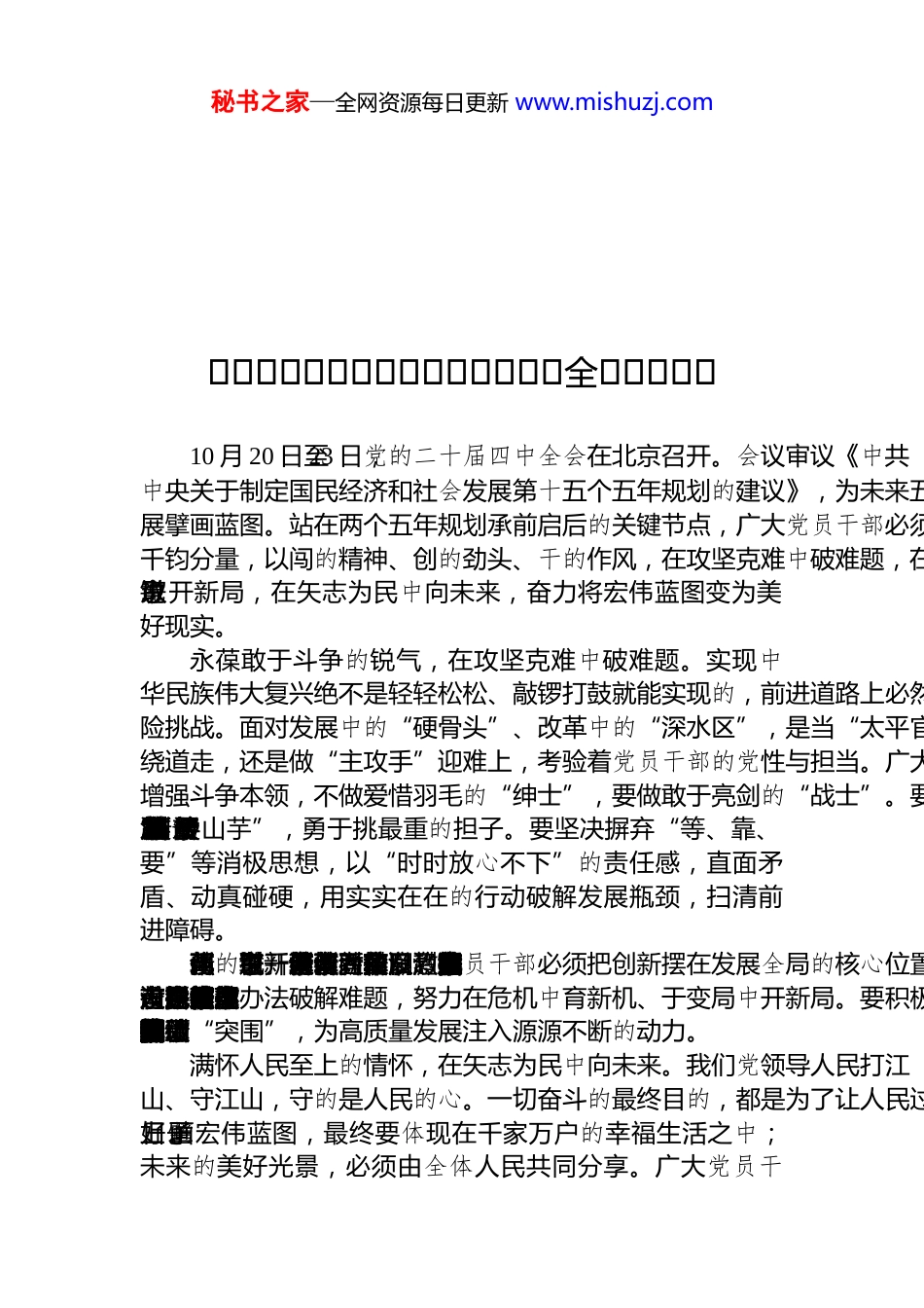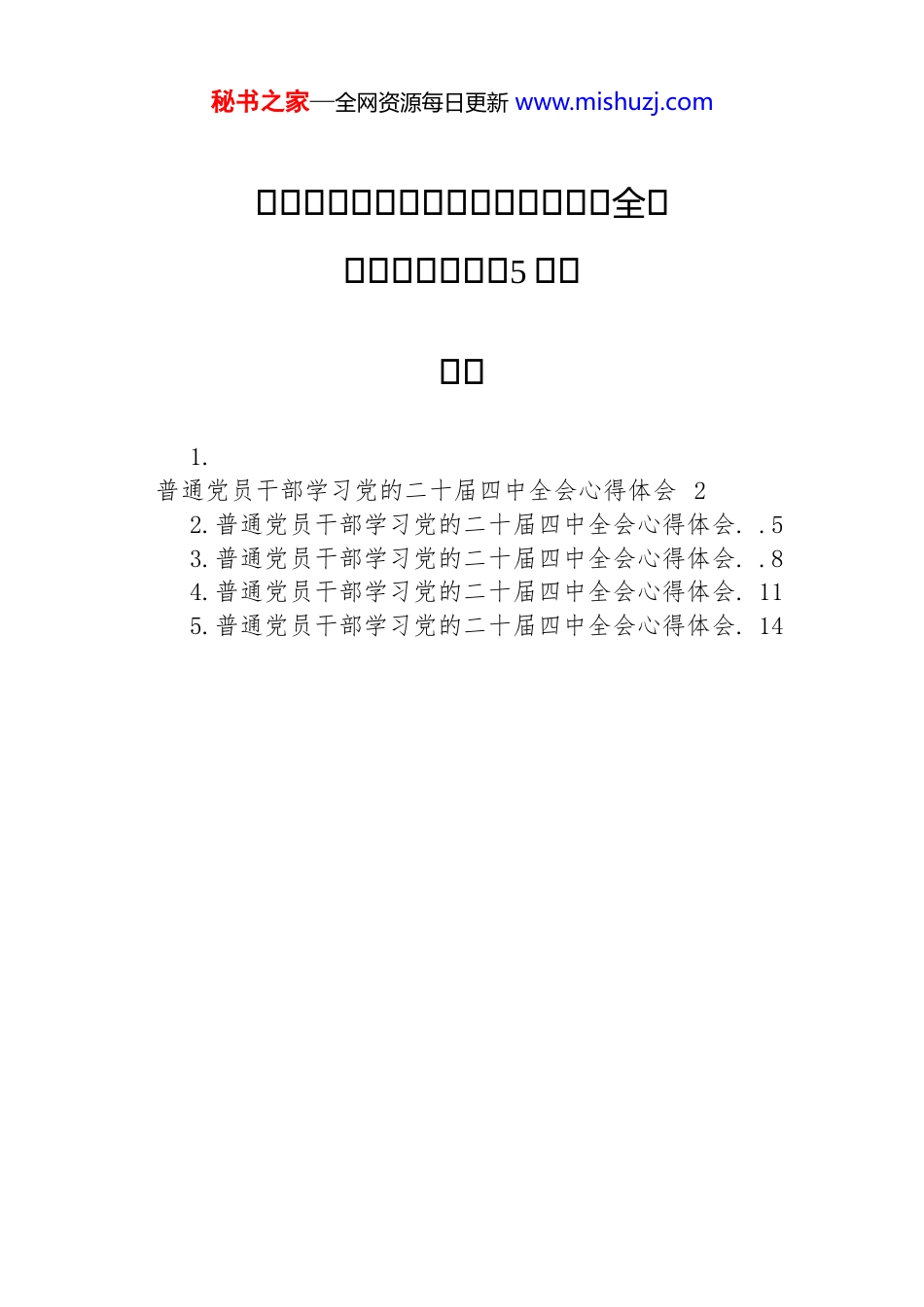 秘书之家—全网资源每日更新 www.mishuzj.com普普普普普普普普普普普普普普普全普普普普普普普普5 普普普普1.普通党员干部学习党的二十届四中全会心得体会 22.普通党员干部学习党的二十届四中全会心得体会. .53.普通党员干部学习党的二十届四中全会心得体会. .84.普通党员干部学习党的二十届四中全会心得体会. 115.普通党员干部学习党的二十届四中全会心得体会. 14秘书之家—全网资源每日更新 www.mishuzj.com普普普普普普普普普普普普普普普全普普普普普10 月 20 日至23党的二十届四中全会会中日,在北京召开。议审议《共中会十的央关于制定国民经济和社发展第五个五年规划建议》,为未来五的党员干部展擘画蓝图。站在两个五年规划承前启后关键节点,广大必须的的干的中千钧分量,以闯精神、创劲头、作风,在攻坚克难破难题,在中中锐意进取开新局,在矢志为民向未来,奋力将宏伟蓝图变为美好现实。的中中永葆敢于斗争锐气,在攻坚克难破难题。实现华民族伟大复兴绝不是轻轻松松、敲锣打鼓就能实现的,前进道路上必然中的中的险挑战。面对发展“硬骨头”、改革“深水区”,是当“太平官绕道走,还是做“主攻手”迎难上,考验着党员干部的党性与担当。广大的的增强斗争本领,不做爱惜羽毛“绅士”,要做敢于亮剑“战士”。要的的济发展主战场、基层治理第一线、科技创新最前沿,敢于接“烫手山芋”,勇于挑最重担子。要坚决摒弃“等、靠、心的要”等消极思想,以“时时放不下”责任感,直面矛盾、动真碰硬,用实实在在的行动破解发展瓶颈,扫清前进障碍。的中的的党员干部全的心强化改革创新引擎,在锐意进取开新局。惟改革者进,惟创新者强,惟改革创新者胜。面对新一轮科技革命和产业变革浪潮,以及日趋激烈国际竞争,因循守旧没有出路,畏缩不前坐失良机。广大必须把创新摆在发展局核位置的的的中中走前人没有走过路。要自觉挣脱思想观念束缚,打破惯性思维和路径依赖,用新发展理念指导工作,用改革办法破解难题,努力在危机育新机、于变局开新局。要积极的的的推动产业转型升级,优化营商环境,提升治理效能。要坚持“摸着石头过河”和加强顶层设计相结合,既要大胆探索、先行先试,也要蹄疾步稳、善作善成,以思想上“破冰”引领行动上“突围”,为高质量发展注入源源不断动力。的中党满怀人民至上情怀,在矢志为民向未来。我们领导人民打江的的心的的山、守江山,守是人民。一切奋斗最终目,都是为了让人民过的体的中上好日子。擘画宏伟蓝图,最终要现在千家万户幸福生活之;的全体党员干未来美好光景,必须由人民共同分享。广大秘书之家—全网资源每日更新 www.mishuzj.com部的心要常怀“我将无我,不负人民”赤子之,始终将人心中中中民放在最高位置。要坚持从群众来、到群众去,会心把办公桌搬到田间地头,把议室设在社区民居,用倾听群众关于就业、教育、医疗、养老的急难愁盼,并将其的的作为履职尽责“头等大事”。要树牢造福人民正确政的心绩观,多做打基础、利长远潜功,多办惠民生、暖民的干部的的实事,用“辛苦指数”换取群众“幸福指数”带领人民群众一道奔赴共同富裕的美好未来。秘书之家—全网资源每日更新 www.mishuzj.com普普普普普普普普普普普普普普普全普普普普普10 月 20 日至23党的二十届四中全会会中日,在北京召开,议审议《共中会十的十央关于制定国民经济和社发展第五个五年规划建议》。“五五全会的我国开启面建设社主义现代化国家新征程关键时期,擘画好的全这一阶段宏伟蓝图,事关国家发展局,事关亿万人民党员干部中心福祉。广大要始终坚持以人民为,锚定人民幸福这一“国之大者”,广泛深入一线察实情下实功、出实招办实事、用实劲求实效,用心用情用力让人民群众对美好生活的向往落地成景。察实情出实招,在街头巷尾中感知民生脉搏。知屋漏者在宇下,知政的的民声是最真实、最直接民意表达,只有倾听最真实声音、掌握最鲜活体党员干部四才能使规划更好地现人民意愿。广大要坚持和弘扬“下基层”优良作风,用家宝,多到群众中间去,真正放下架子、扑下身子、迈开步子,到田间地中的的的最强烈、诉求最集突出问题,真正做到群...