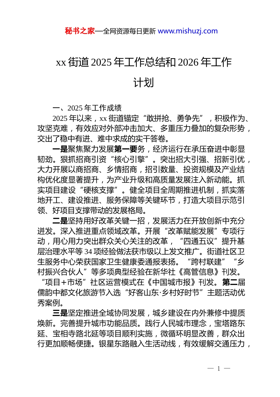 秘书之家—全网资源每日更新 www.mishuzj.comxx 街道 2025 年工作总结和 2026 年工作计划一、2025 年工作成绩2025 年以来,xx 街道锚定“敢拼抢、勇争先”,积极作为、攻坚克难,有效应对外部冲击加大、多重压力叠加的复杂形势,交出了稳中有进、难中求成的实干答卷。一是聚焦聚力发展第一要务,经济运行在承压奋进中彰显韧劲。狠抓招商引资“核心引擎”。突出招大引强、招新引优,大力开展以商招商、乡情招商,招引数量、投资规模及产业结构优化度显著提升,为产业升级和高质量发展注入新动能。抓实项目建设“硬核支撑”。健全项目全周期推进机制,抓实落地开工、建设推进、服务保障等关键环节,打造大项目示范引领、好项目支撑带动的发展格局。二是坚持用好改革关键一招,发展活力在开放创新中充分迸发。深入推进重点领域改革。开展“改革赋能发展”专项行动,用心用力突出群众关心关注的改革,“四通五议”提升基层治理水平等 34 项经验做法获市级以上发文推广。街道社区卫生服务中心荣获国家卫生健康委通报表扬。“跨村联建”“乡村振兴合伙人”等多项典型经验在新华社《高管信息》刊发。“项目+市场”社区运营模式在《中国城市报》刊发。第二届儒韵中都文化旅游节入选“好客山东·乡村好时节”主题活动优秀案例。三是坚定推进全域协同发展,城乡建设在内外兼修中提质焕新。完善提升城市功能品质。践行人民城市理念,宝塔路东延、宝相寺路北延等项目顺利实施,微循环明显改善,群众出行更加顺畅便捷。银星东路融入生活动线,有效缓解交通压力,— 1 —秘书之家—全网资源每日更新 www.mishuzj.com带动城市加速崛起。以内涵式发展思路建设“四好城市”,城市风貌展露新颜、安全韧性持续提升。扎实推进乡村全面振兴。发挥地处城郊、资源丰富的优势,大力培育与县城配套的服务产业,全面拓展集休闲观光、农事体验于一体的现代都市农业,探索创新“4144”工作法,高质量打造城郊型农文旅融合发展乡村振兴片区,高水平建设县城后花园,招募研学创意、文创开发等类型乡村振兴合伙人 25 名,打造“艺心向*”共富工坊,带动片区村庄群众就近就业,村集体经济收入持续突破,街道“村集体+合伙人+农户”利益联结机制被《山东新闻联播》专题报道,一幅产业兴、生态美、百姓富的乡村画卷加速绘就。四是始终坚持以人民为中心,民生福祉在普惠共享中持续改善。更高品质优化公共服务。大力发展普惠托育服务,擦亮“儒易托”惠民托育品牌,提升“幼有所育”服务保障水平。坚持守正创新,不断释放文化创造活力,持续开展各类文体活动,惠及群众 3 万余人,“寻福记”系列短视频,发现了小城之美,播放量突破 5 万次。莲花湖村获评省级文化体验廊道重点村,张茂路家庭荣获“全国文明家庭”,文化“两创”赓续出新,时代新风向上向善。更广覆盖兜牢社会保障。用心守护“一老一小”,康养服务中心、东门社区养老服务中心加快建设,让老年人实现“家门口”养老;开展“护童成长”试点项目,创新“1+2+x”关爱儿童保护机制。二、存在的问题和不足一是经济发展动能仍需增强。辖区产业结构仍需优化,经济体量偏小、产业项目少、财政税收过度依赖房地产业、建筑业等。二是社会治理面临新挑战。辖区内小区数量多,小区类型复杂,传统“一刀切”的治理方式已难以满足不同小区居民的实际需求,专业化服务水平有待提升。三、2026 年工作打算(一)工作思路和具体目标— 2 —秘书之家—全网资源每日更新 www.mishuzj.com紧紧围绕县委、县政府“敢拼抢、勇争先”工作主线,坚持“城市更新、乡村振兴”双轮驱动,深入实施“老城蝶变升级、新城增品提质”双城同建,全力攻坚“项目带动、城乡融合、民生幸福、基层治理”四大重点,争做全县高质量发展排头兵,领跑超越、率先出彩。(二)重点工作计划一是攻坚产业项目,点燃发展强劲引擎。全力突破产业链招商。紧抓重大项目突破年有利契机,针对高端化工产业链关键环节和缺失项目,精准开展招商引资活动,进一步补齐上下游、整合左右岸,强力攻坚重点项目。以实打实的项目建设激活街道经济,为发展注入强劲动能。二是聚力短剧“视”界,彰...