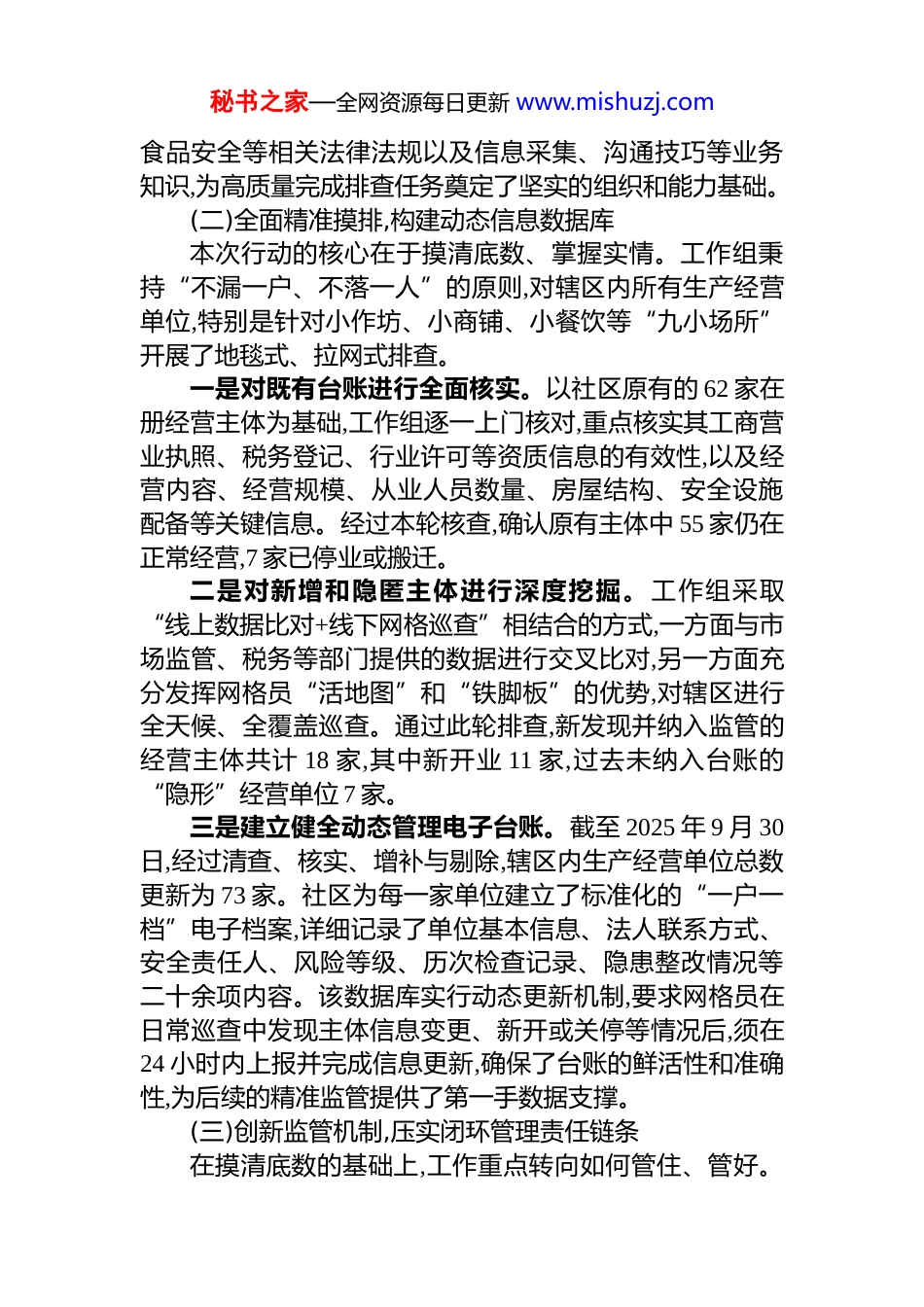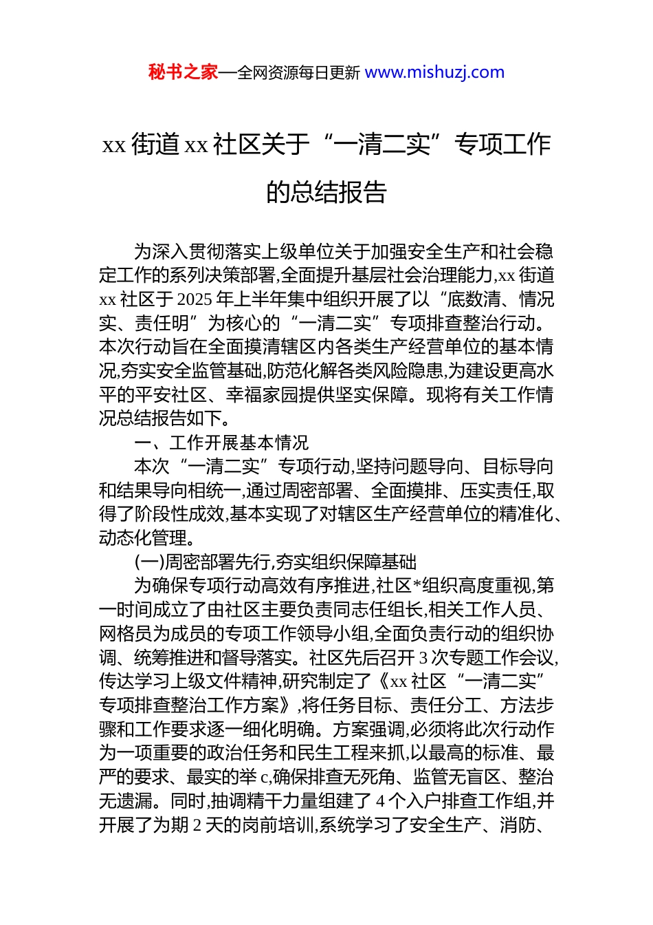 秘书之家—全网资源每日更新 www.mishuzj.comxx 街道 xx 社区关于“一清二实”专项工作的总结报告为深入贯彻落实上级单位关于加强安全生产和社会稳定工作的系列决策部署,全面提升基层社会治理能力,xx 街道xx 社区于 2025 年上半年集中组织开展了以“底数清、情况实、责任明”为核心的“一清二实”专项排查整治行动。本次行动旨在全面摸清辖区内各类生产经营单位的基本情况,夯实安全监管基础,防范化解各类风险隐患,为建设更高水平的平安社区、幸福家园提供坚实保障。现将有关工作情况总结报告如下。一、工作开展基本情况本次“一清二实”专项行动,坚持问题导向、目标导向和结果导向相统一,通过周密部署、全面摸排、压实责任,取得了阶段性成效,基本实现了对辖区生产经营单位的精准化、动态化管理。(一)周密部署先行,夯实组织保障基础为确保专项行动高效有序推进,社区*组织高度重视,第一时间成立了由社区主要负责同志任组长,相关工作人员、网格员为成员的专项工作领导小组,全面负责行动的组织协调、统筹推进和督导落实。社区先后召开 3 次专题工作会议,传达学习上级文件精神,研究制定了《xx 社区“一清二实”专项排查整治工作方案》,将任务目标、责任分工、方法步骤和工作要求逐一细化明确。方案强调,必须将此次行动作为一项重要的政治任务和民生工程来抓,以最高的标准、最严的要求、最实的举 c,确保排查无死角、监管无盲区、整治无遗漏。同时,抽调精干力量组建了 4 个入户排查工作组,并开展了为期 2 天的岗前培训,系统学习了安全生产、消防、秘书之家—全网资源每日更新 www.mishuzj.com食品安全等相关法律法规以及信息采集、沟通技巧等业务知识,为高质量完成排查任务奠定了坚实的组织和能力基础。(二)全面精准摸排,构建动态信息数据库本次行动的核心在于摸清底数、掌握实情。工作组秉持“不漏一户、不落一人”的原则,对辖区内所有生产经营单位,特别是针对小作坊、小商铺、小餐饮等“九小场所”开展了地毯式、拉网式排查。一是对既有台账进行全面核实。以社区原有的 62 家在册经营主体为基础,工作组逐一上门核对,重点核实其工商营业执照、税务登记、行业许可等资质信息的有效性,以及经营内容、经营规模、从业人员数量、房屋结构、安全设施配备等关键信息。经过本轮核查,确认原有主体中 55 家仍在正常经营,7 家已停业或搬迁。二是对新增和隐匿主体进行深度挖掘。工作组采取“线上数据比对+线下网格巡查”相结合的方式,一方面与市场监管、税务等部门提供的数据进行交叉比对,另一方面充分发挥网格员“活地图”和“铁脚板”的优势,对辖区进行全天候、全覆盖巡查。通过此轮排查,新发现并纳入监管的经营主体共计 18 家,其中新开业 11 家,过去未纳入台账的“隐形”经营单位 7 家。三是建立健全动态管理电子台账。截至 2025 年 9 月 30日,经过清查、核实、增补与剔除,辖区内生产经营单位总数更新为 73 家。社区为每一家单位建立了标准化的“一户一档”电子档案,详细记录了单位基本信息、法人联系方式、安全责任人、风险等级、历次检查记录、隐患整改情况等二十余项内容。该数据库实行动态更新机制,要求网格员在日常巡查中发现主体信息变更、新开或关停等情况后,须在24 小时内上报并完成信息更新,确保了台账的鲜活性和准确性,为后续的精准监管提供了第一手数据支撑。(三)创新监管机制,压实闭环管理责任链条在摸清底数的基础上,工作重点转向如何管住、管好。秘书之家—全网资源每日更新 www.mishuzj.com社区积极探索创新监管模式,着力构建权责清晰、运转高效的闭环管理体系。一是全面推行网格化包片管理。将辖区划分为 4 个大的管理网格,每个网格明确一名社区干部作为总负责人,并配备2-3 名专职网格员。73 家经营单位被精准划分到各个网格中,实现了定人、定岗、定责。网格员承担日常巡查、政策宣传、信息上报、隐患初核、协助整改等“一线哨兵”职责,确保问题能被第一时间发现和报告。二是构建“属地+部门+主体”三方责任体系。明确了社区的属地管理责任、行业主管部门的监管责任和生产经营单位的主体责任。社区与每一家经营单位签订了《安全生产责任...