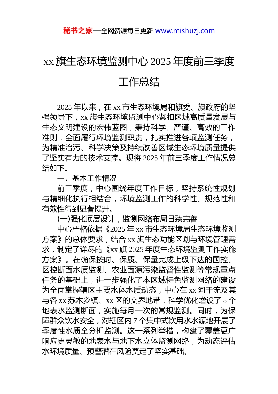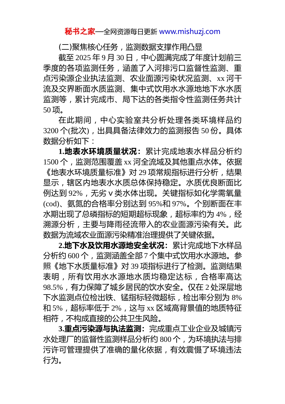 秘书之家—全网资源每日更新 www.mishuzj.comxx 旗生态环境监测中心 2025 年度前三季度工作总结2025 年以来,在 xx 市生态环境局和旗委、旗政府的坚强领导下,xx 旗生态环境监测中心紧扣区域高质量发展与生态文明建设的宏伟蓝图,秉持科学、严谨、高效的工作准则,全面履行环境监测职责,扎实推进各项监测任务,为精准治污、科学决策及持续改善区域生态环境质量提供了坚实有力的技术支撑。现将 2025 年前三季度工作情况总结如下。一、基本工作情况前三季度,中心围绕年度工作目标,坚持系统性规划与精细化执行相结合,环境监测工作的科学性、规范性和有效性得到显著提升。(一)强化顶层设计,监测网络布局日臻完善中心严格依据《2025 年 xx 市生态环境局生态环境监测方案》的总体要求,结合 xx 旗生态功能区划与环境管理需求,制定了详尽的《xx 旗 2025 年度生态环境监测工作实施方案》。在确保按时、保质、保量完成上级下达的国控、区控断面水质监测、农业面源污染监督性监测等常规重点任务的基础上,进一步强化了本区域特色监测网络的建设为全面掌握辖区主要水体水质动态,中心在 xx 河干流及其与各 xx 苏木乡镇、xx 区的交界地带,科学优化增设了 8 个地表水监测断面,实施每月一次的常规监测。同时,为保障群众饮水安全,对辖区内 7 个集中式饮用水水源地开展了季度性水质全分析监测。这一系列举措,构建了覆盖更广响应更灵敏的地表水与地下水立体监测网络,为动态评估水环境质量、预警潜在风险奠定了坚实基础。秘书之家—全网资源每日更新 www.mishuzj.com(二)聚焦核心任务,监测数据支撑作用凸显截至 2025 年 9 月 30 日,中心圆满完成了年度计划前三季度的各项监测任务,涵盖了入河排污口监督性监测、重点污染源企业执法监测、农业面源污染状况监测、xx 河干流及交界断面水质监测、集中式饮用水水源地地下水水质监测等,累计完成市、局下达的各类指令性监测任务共计50 项。在此期间,中心实验室共分析处理各类环境样品约3200 个(批次),出具具备法律效力的监测报告 50 份。具体数据分析如下:1.地表水环境质量状况:累计完成地表水样品分析约1500 个,监测范围覆盖 xx 河全流域及其他重点水体。依据《地表水环境质量标准》对 29 项常规指标进行分析,结果显示,辖区内地表水水质总体保持稳定。水质优良断面比例达到 92%,无劣ⅴ类水体出现。关键指标如化学需氧量(cod)、氨氮的合格率分别达到 95%和 97%。个别断面在丰水期出现了总磷指标的短期超标现象,超标率约为 4%,经溯源分析,主要与降雨径流带入的农业面源污染有关。此数据为流域农业面源污染精准治理提供了关键依据。2.地下水及饮用水源地安全状况:累计完成地下水样品分析约 600 个,监测涵盖全部 7 个集中式饮用水水源地。参照《地下水质量标准》对 39 项指标进行了检测。监测结果表明,所有饮用水水源地水质均稳定达标,合格率高达98.5%,有力保障了城乡居民的饮水安全。仅在 2 处深层地下水监测点位检出铁、锰指标轻微超标,检出率分别为 8%和 5%,超标率低于 2%,这与 xx 区域高背景值的地质特征相符,不构成直接的公共卫生风险。3.重点污染源与执法监测:完成重点工业企业及城镇污水处理厂的监督性监测样品分析约 800 个,为环境执法与排污许可管理提供了准确的量化依据,有效震慑了环境违法行为。秘书之家—全网资源每日更新 www.mishuzj.com(三)严守质量生命线,监测数据公信力稳固提升中心始终将监测数据质量视为工作的生命线。为此,建立并严格执行了一套贯穿“样品采集—保存流转—实验室分析—数据审核—报告签发”的全流程质量保证与质量控制体系。工作中,严格遵循国家环境监测技术规范,科学布点,规范操作。同时,积极参与外部能力验证,在前三季度参加的由 xx 自治区监测总站组织的 3 轮次水质分析能力考核中,所有考核项目均获得“满意”评价;在接受 xx市局开展的 2 次盲样考核中,合格率均达到 100%,充分证明了中心监测数据的准确性、可靠性和权威性。(四)注重人才培养,队伍专业化水平稳步增强为适应新时期环境监测工...