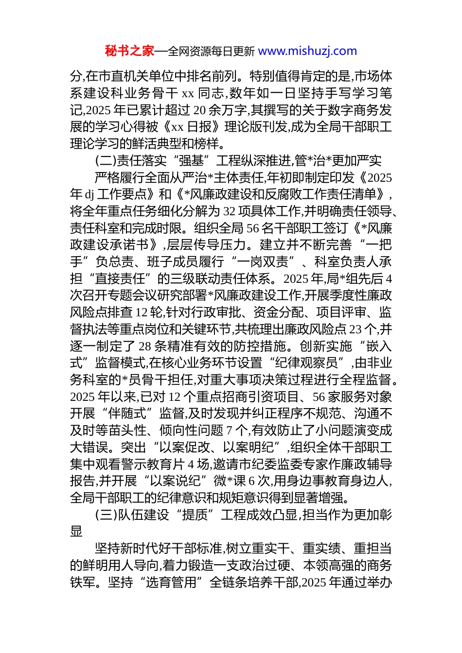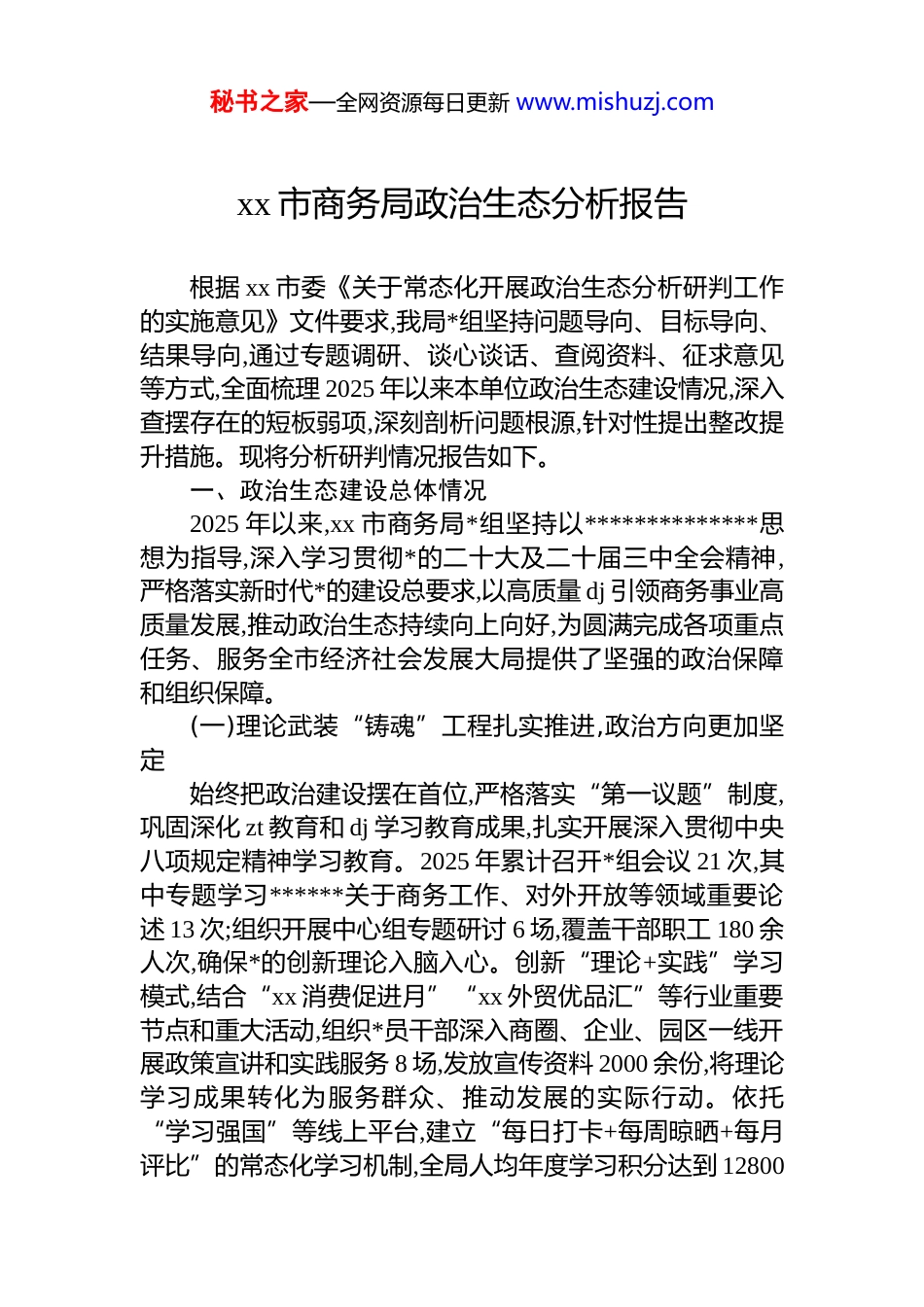 秘书之家—全网资源每日更新 www.mishuzj.comxx 市商务局政治生态分析报告根据 xx 市委《关于常态化开展政治生态分析研判工作的实施意见》文件要求,我局*组坚持问题导向、目标导向、结果导向,通过专题调研、谈心谈话、查阅资料、征求意见等方式,全面梳理 2025 年以来本单位政治生态建设情况,深入查摆存在的短板弱项,深刻剖析问题根源,针对性提出整改提升措施。现将分析研判情况报告如下。一、政治生态建设总体情况2025 年以来,xx 市商务局*组坚持以**************思想为指导,深入学习贯彻*的二十大及二十届三中全会精神,严格落实新时代*的建设总要求,以高质量 dj 引领商务事业高质量发展,推动政治生态持续向上向好,为圆满完成各项重点任务、服务全市经济社会发展大局提供了坚强的政治保障和组织保障。(一)理论武装“铸魂”工程扎实推进,政治方向更加坚定始终把政治建设摆在首位,严格落实“第一议题”制度,巩固深化 zt 教育和 dj 学习教育成果,扎实开展深入贯彻中央八项规定精神学习教育。2025 年累计召开*组会议 21 次,其中专题学习******关于商务工作、对外开放等领域重要论述 13 次;组织开展中心组专题研讨 6 场,覆盖干部职工 180 余人次,确保*的创新理论入脑入心。创新“理论+实践”学习模式,结合“xx 消费促进月”“xx 外贸优品汇”等行业重要节点和重大活动,组织*员干部深入商圈、企业、园区一线开展政策宣讲和实践服务 8 场,发放宣传资料 2000 余份,将理论学习成果转化为服务群众、推动发展的实际行动。依托“学习强国”等线上平台,建立“每日打卡+每周晾晒+每月评比”的常态化学习机制,全局人均年度学习积分达到 12800秘书之家—全网资源每日更新 www.mishuzj.com分,在市直机关单位中排名前列。特别值得肯定的是,市场体系建设科业务骨干 xx 同志,数年如一日坚持手写学习笔记,2025 年已累计超过 20 余万字,其撰写的关于数字商务发展的学习心得被《xx 日报》理论版刊发,成为全局干部职工理论学习的鲜活典型和榜样。(二)责任落实“强基”工程纵深推进,管*治*更加严实严格履行全面从严治*主体责任,年初即制定印发《2025年 dj 工作要点》和《*风廉政建设和反腐败工作责任清单》,将全年重点任务细化分解为 32 项具体工作,并明确责任领导、责任科室和完成时限。组织全局 56 名干部职工签订《*风廉政建设承诺书》,层层传导压力。建立并不断完善“一把手”负总责、班子成员履行“一岗双责”、科室负责人承担“直接责任”的三级联动责任体系。2025 年,局*组先后 4次召开专题会议研究部署*风廉政建设工作,开展季度性廉政风险点排查 12 轮,针对行政审批、资金分配、项目评审、监督执法等重点岗位和关键环节,共梳理出廉政风险点 23 个,并逐一制定了 28 条精准有效的防控措施。创新实施“嵌入式”监督模式,在核心业务环节设置“纪律观察员”,由非业务科室的*员骨干担任,对重大事项决策过程进行全程监督。2025 年以来,已对 12 个重点招商引资项目、56 家服务对象开展“伴随式”监督,及时发现并纠正程序不规范、沟通不及时等苗头性、倾向性问题 7 个,有效防止了小问题演变成大错误。突出“以案促改、以案明纪”,组织全体干部职工集中观看警示教育片 4 场,邀请市纪委监委专家作廉政辅导报告,并开展“以案说纪”微*课 6 次,用身边事教育身边人,全局干部职工的纪律意识和规矩意识得到显著增强。(三)队伍建设“提质”工程成效凸显,担当作为更加彰显坚持新时代好干部标准,树立重实干、重实绩、重担当的鲜明用人导向,着力锻造一支政治过硬、本领高强的商务铁军。坚持“选育管用”全链条培养干部,2025 年通过举办秘书之家—全网资源每日更新 www.mishuzj.com“岗位大练兵”“招商技能大比武”等活动,选拔出业务能力突出、综合素质全面的业务骨干 12 名,其中 3 名优秀年轻干部成功入选上级系统“青年尖兵人才库”。加大干部交流轮岗和实践锻炼力度,全年选派 5 名年轻干部到 xx 自贸区、xx 高新区等经济主战场跟班学习,选派 3 名缺乏基层经验的干部到乡镇一线挂职锻炼,干部队伍的专业结构和梯队层次得到进一步优化。聚焦...