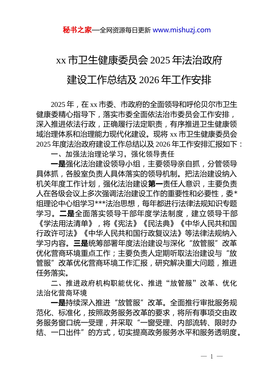 秘书之家—全网资源每日更新 www.mishuzj.comxx 市卫生健康委员会 2025 年法治政府建设工作总结及 2026 年工作安排2025 年,在 xx 市委、市政府的全面领导和呼伦贝尔市卫生健康委精心指导下,落实市委全面依法治市委员会工作安排,深入推进依法行政,正确履行法定职责,有序推进卫生健康领域治理体系和治理能力现代化建设。现将 xx 市卫生健康委员会2025 年度法治政府建设工作总结以及 2026 年工作安排汇报如下:一、加强法治理论学习,强化领导责任一是强化法治建设领导小组,主要领导亲自抓,分管领导具体抓,各股室负责人具体落实的领导机制。把法治建设纳入机关年度工作计划,强化法治建设第一责任人意识,主要负责人在各级会议上多次强调法治建设工作的重要性和必要性,委*组理论中心组学习***法治思想,每年都进行法律法规知识专题学习。二是全面落实领导干部年度学法制度,建立领导干部《学法用法清单》,将《宪法》《民法典》《中华人民共和国行政许可法》《中华人民共和国行政复议法》等法律法规纳入学习内容。三是统筹部署年度法治建设与深化“放管服”改革优化营商环境重点工作;主要负责人定期听取法治建设与“放管服”改革优化营商环境工作汇报,研究解决重大问题,推进任务落实。二、推进政府机构职能优化、推进“放管服”改革、优化法治化营商环境一是持续深入推进“放管服”改革。全面推行审批服务规范化、标准化,按照政务服务改革的要求,将所有事项交由政务服务窗口统一受理,并采取“一窗受理、内部流转、限时办结、一口出件”的方式,切实提高政务服务水平和服务透明度。— 1 —秘书之家—全网资源每日更新 www.mishuzj.com全面推行证明事项告知承诺制,企业和群众办事实现“最多跑一次”的目标。深化“证照分离”改革,诊所执业登记改备案。共办理诊所执业备案 12 件。全面推进“免证办”服务。完成认领电子证照 11 类,汇聚电子证照 2386 件,68 项政务服务事项关联电子证照实现“免证办”。提供“免证办”服务 9 件。推进“全区通办”事项标准化,在一体化平台完成 24 项通办事项的认领、编制、变更、调整工作。二是深化“双随机、一公开”监管。本年度共完成 156 家国家“双随机”、26 家市本级联合“双随机”抽查任务。制定 xx 市卫生健康委《卫生健康委员会双随机市场监管工作细》(2024 版),全面推行“一业一册”、“一业一查”部门联合随机抽查监管新模式,强化部门协作联动,实现“进一次门、查多项事”目的,最大限度减少对市场主体经营的干扰。三、完善依法行政制度和决策制度落实重大行政决策程序制度。依法规范行政决策程序,开展重大事项合法性审查,保障依法科学决策,提升决策质量。2025 年,22 件重大行政处罚执法决定进行了合法性审查。四、严格规范公正文明执法一是全面落实行政执法“三项制度”。落实行政执法公示制度。“双随机”抽查结果和行政处罚决定作出后及时将所办理的行政处罚案件全部在市政府网站上进行公示,同时上传至呼伦贝尔市信用信息共享平台,接受群众监督。推行执法全过程记录制度。推行重大执法决定法制审核制度,办理的所有重大行政执法案件均按照规定进行法制审核。二是加强执法稽查。采取查阅资料、案件评查、网上核查等方式,对执法全过程记录制度落实、“双随机”监督抽查、执法文书制作与管理等开展稽查。通过对全市卫生健康执法机构开展内部稽查和层级稽查,确保全市卫生健康执法机构依法履行职权,依法开展卫生监督执法检查工作。— 2 —秘书之家—全网资源每日更新 www.mishuzj.com五、加强综合监督,提高卫生依法行政能力一是完成疾病预防控制中心(卫生监督站)机构改革 ,2025 年度新增 13 名执法人员,同时为 27 名执法人员发放执法证件,确保执法人员合法履行执法职责,保障执法工作的连续性。二是进一步加大卫生行政处罚力度,通过主动监督、接受投诉举报 80 起,2025 全年共计立案 35 起(其中未结案 12 起),结案 30 起(其中 2024 年立案结案 6 起),1 起非法行医案件已移送至公安机关处理,2025 年累计上缴国库罚没款 xx 元。...