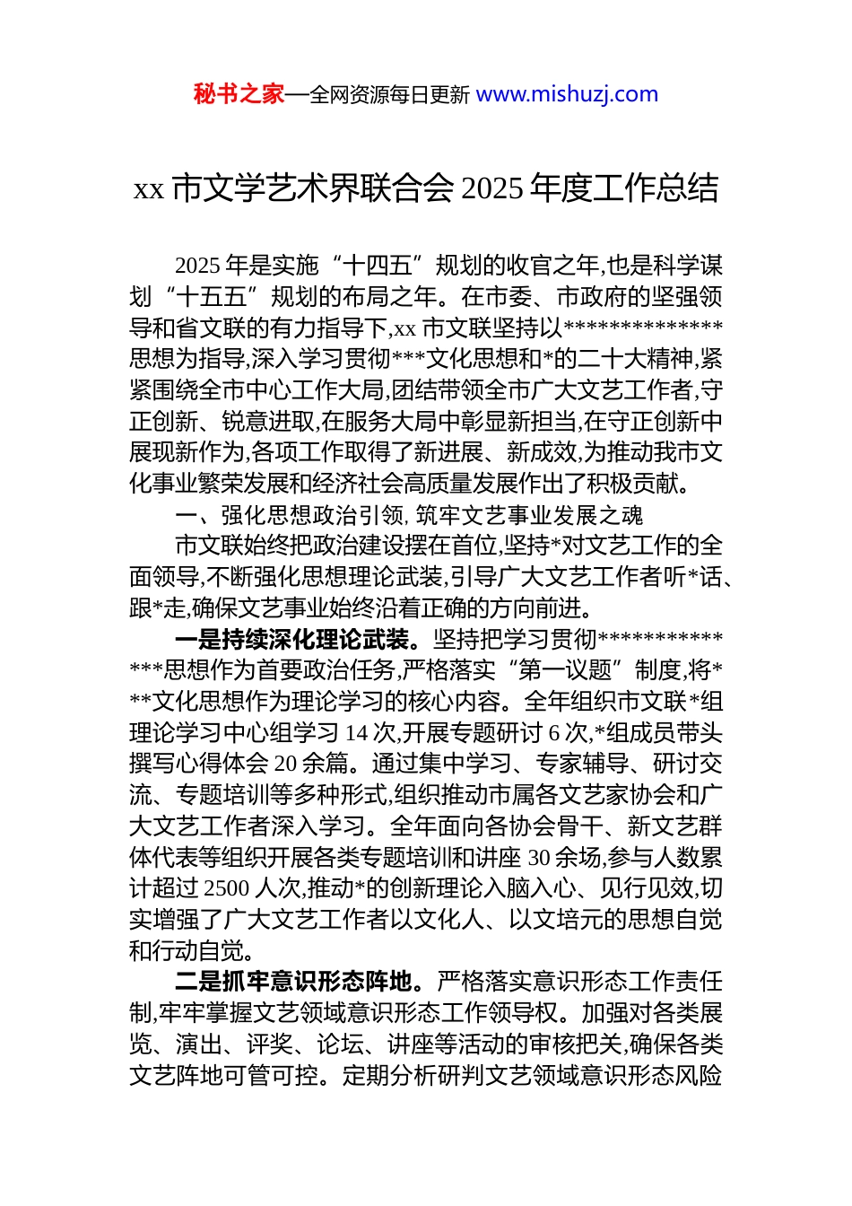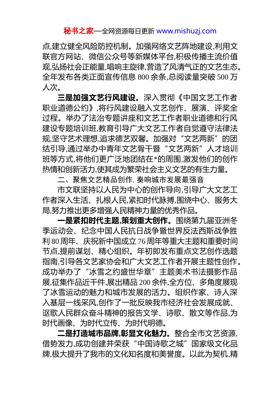 秘书之家—全网资源每日更新 www.mishuzj.comxx 市文学艺术界联合会 2025 年度工作总结2025 年是实施“十四五”规划的收官之年,也是科学谋划“十五五”规划的布局之年。在市委、市政府的坚强领导和省文联的有力指导下,xx 市文联坚持以**************思想为指导,深入学习贯彻***文化思想和*的二十大精神,紧紧围绕全市中心工作大局,团结带领全市广大文艺工作者,守正创新、锐意进取,在服务大局中彰显新担当,在守正创新中展现新作为,各项工作取得了新进展、新成效,为推动我市文化事业繁荣发展和经济社会高质量发展作出了积极贡献。一、强化思想政治引领,筑牢文艺事业发展之魂市文联始终把政治建设摆在首位,坚持*对文艺工作的全面领导,不断强化思想理论武装,引导广大文艺工作者听*话、跟*走,确保文艺事业始终沿着正确的方向前进。一是持续深化理论武装。坚持把学习贯彻**************思想作为首要政治任务,严格落实“第一议题”制度,将***文化思想作为理论学习的核心内容。全年组织市文联*组理论学习中心组学习 14 次,开展专题研讨 6 次,*组成员带头撰写心得体会 20 余篇。通过集中学习、专家辅导、研讨交流、专题培训等多种形式,组织推动市属各文艺家协会和广大文艺工作者深入学习。全年面向各协会骨干、新文艺群体代表等组织开展各类专题培训和讲座 30 余场,参与人数累计超过 2500 人次,推动*的创新理论入脑入心、见行见效,切实增强了广大文艺工作者以文化人、以文培元的思想自觉和行动自觉。二是抓牢意识形态阵地。严格落实意识形态工作责任制,牢牢掌握文艺领域意识形态工作领导权。加强对各类展览、演出、评奖、论坛、讲座等活动的审核把关,确保各类文艺阵地可管可控。定期分析研判文艺领域意识形态风险秘书之家—全网资源每日更新 www.mishuzj.com点,建立健全风险防控机制。加强网络文艺阵地建设,利用文联官方网站、微信公众号等新媒体平台,积极传播主流价值观,弘扬社会正能量,唱响主旋律,营造了风清气正的文艺生态。全年发布各类正面宣传信息 800 余条,总阅读量突破 500 万人次。三是加强文艺行风建设。深入贯彻《中国文艺工作者职业道德公约》,将行风建设融入文艺创作、展演、评奖全过程。举办了法治专题讲座和文艺工作者职业道德和行风建设专题培训班,教育引导广大文艺工作者自觉遵守法律法规,坚守艺术理想,追求德艺双馨。加强对“文艺两新”的团结引导,通过举办中青年文艺骨干暨“文艺两新”人才培训班等方式,将他们更广泛地团结在*的周围,激发他们的创作热情和创新活力,使其成为繁荣社会主义文艺的有生力量。二、聚焦文艺精品创作,奏响城市发展最强音市文联坚持以人民为中心的创作导向,引导广大文艺工作者深入生活、扎根人民,紧扣时代脉搏,围绕中心、服务大局,努力推出更多增强人民精神力量的优秀作品。一是紧扣时代主题,策划重大创作。围绕第九届亚洲冬季运动会、纪念中国人民抗日战争暨世界反法西斯战争胜利 80 周年、庆祝新中国成立 76 周年等重大主题和重要时间节点,提前谋划、精心组织。年初即发布重点文艺创作选题指南,引导各文艺家协会和广大文艺工作者开展主题性创作。成功举办了“冰雪之约盛世华章”主题美术书法摄影作品展,征集作品近千件,展出精品 200 余件,全方位、多角度展现了冰雪运动的魅力和城市发展的活力。组织作家、诗人深入基层一线采风,创作了一批反映我市经济社会发展成就、讴歌人民群众奋斗精神的报告文学、诗歌、散文等作品,为时代画像、为时代立传、为时代明德。二是打造城市品牌,彰显文化魅力。整合全市文艺资源,借势发力,成功创建并荣获“中国诗歌之城”国家级文化品牌,极大提升了我市的文化知名度和美誉度。以此为契机,精秘书之家—全网资源每日更新 www.mishuzj.com心策划开展“第二届 xx 冰雪诗会”,邀请国内外知名诗人齐聚 xx,以诗歌为媒,共赏冰雪神韵。举办“丁香诗笺·音乐朗诵会”,在城市地标奏响诗与音乐的和谐旋律,吸引数万市民和游客驻足欣赏。积极推动文艺“走出去”,携 300 余种本土优秀书籍赴 xx 文博会,在“xx 融媒·书韵共生”板块集中展示 xx 作为“中国诗歌之城”的深厚底蕴。举办“大美...
