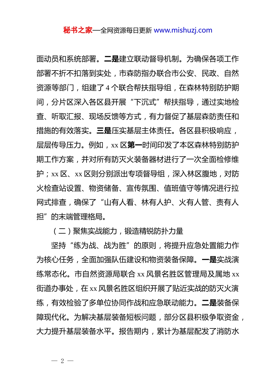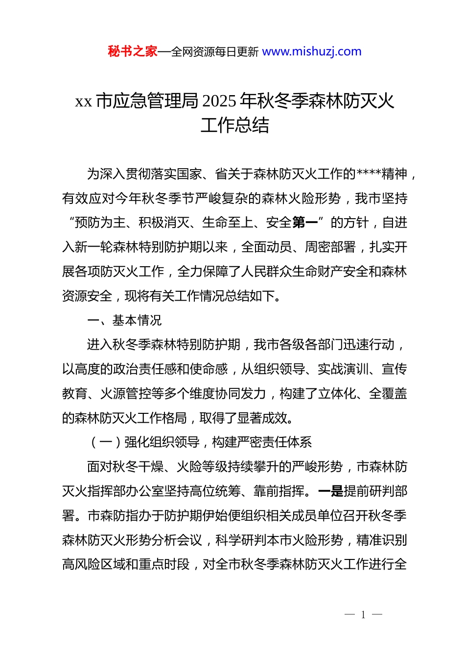 秘书之家—全网资源每日更新 www.mishuzj.comxx 市应急管理局 2025 年秋冬季森林防灭火工作总结为深入贯彻落实国家、省关于森林防灭火工作的****精神,有效应对今年秋冬季节严峻复杂的森林火险形势,我市坚持“预防为主、积极消灭、生命至上、安全第一”的方针,自进入新一轮森林特别防护期以来,全面动员、周密部署,扎实开展各项防灭火工作,全力保障了人民群众生命财产安全和森林资源安全,现将有关工作情况总结如下。一、基本情况进入秋冬季森林特别防护期,我市各级各部门迅速行动,以高度的政治责任感和使命感,从组织领导、实战演训、宣传教育、火源管控等多个维度协同发力,构建了立体化、全覆盖的森林防灭火工作格局,取得了显著成效。(一)强化组织领导,构建严密责任体系面对秋冬干燥、火险等级持续攀升的严峻形势,市森林防灭火指挥部办公室坚持高位统筹、靠前指挥。一是提前研判部署。市森防指办于防护期伊始便组织相关成员单位召开秋冬季森林防灭火形势分析会议,科学研判本市火险形势,精准识别高风险区域和重点时段,对全市秋冬季森林防灭火工作进行全— 1 —秘书之家—全网资源每日更新 www.mishuzj.com面动员和系统部署。二是建立联动督导机制。为确保各项工作部署不折不扣落到实处,市森防指办联合市公安、民政、自然资源等部门,组建了 4 个联合帮扶指导组,在森林特别防护期间,分片区深入各区县开展“下沉式”帮扶指导,通过实地检查、听取汇报、现场反馈等方式,有力督促了基层森防责任和措施的有效落实。三是压实基层主体责任。各区县积极响应,层层传导压力。例如,xx 区第一时间印发了本区森林特别防护期工作方案,并对所有防灭火装备器材进行了一次全面检修维护;xx 区、xx 区则分别派出专项督导组,深入林区腹地,对防火检查站设置、物资储备、宣传氛围、值班值守等情况进行拉网式排查,确保了“山有人看、林有人护、火有人管、责有人担”的末端管理格局。(二)聚焦实战能力,锻造精锐防扑力量坚持“练为战、战为胜”的原则,将提升应急处置能力作为核心任务,全面加强队伍建设和物资装备保障。一是实战演练常态化。市自然资源局联合 xx 风景名胜区管理局及属地 xx街道办事处,在 xx 风景名胜区组织开展了贴近实战的防灭火演练,有效检验了多单位协同作战和应急联动能力。二是装备保障现代化。为解决基层装备短板问题,部分区县积极争取资金,大力提升基层装备水平。报告期内,累计为基层配发了消防水— 2 —秘书之家—全网资源每日更新 www.mishuzj.com车 13 辆、消防摩托车 3 辆、防火服 130 套、二号灭火工具 650把、应急电源 26 台、割灌机 65 台、370mhz 数字对讲机终端 13套等一批关键装备,极大增强了基层一线“打早、打小、打了”的物质基础。三是专业培训体系化。为提升队伍专业素养,xx 区组织全区 183 个涉林村居的业务骨干开展了防灭火业务培训;xx 区则在 xx 镇集中组织了各镇(街道)应急办、半专业森林消防队伍骨干及群众骨干共 106 人,开展森林火灾扑救技能专项培训,系统学习了火灾预防、初期火情处置、安全撤离等专业知识,有效提升了基层防扑火队伍的整体战斗力。(三)深化宣传教育,筑牢全民思想防线坚持把宣传教育作为治本之策,广泛动员社会力量参与,营造“森林防火、人人有责”的浓厚社会氛围。一是主题宣传有声势。围绕“守护绿色家园,森林防火人人有责”等主题,各相关部门和涉林镇街积极创新宣传形式,通过线上线下相结合的方式,广泛普及森林防灭火法律法规和安全用火知识。二是宣传覆盖有广度。报告期内,全市累计组织各类宣传活动达134 场次,印制并派发了宣传海报、科普手册、《禁火令》、宣传单等宣传品约 56000 份(张),制作并悬挂宣传横幅 450条,同时对林区内的警告标志、固定宣传牌进行了更新维护,累计更新 273 块。这些举措极大地提升了公众的森林防火意识— 3 —秘书之家—全网资源每日更新 www.mishuzj.com和法治观念。三是防火成效有数据。得益于严密的防控措施,全市未发生重大及以上森林火灾,森林火灾次数、受害森林面积、火灾造成损失等关键...